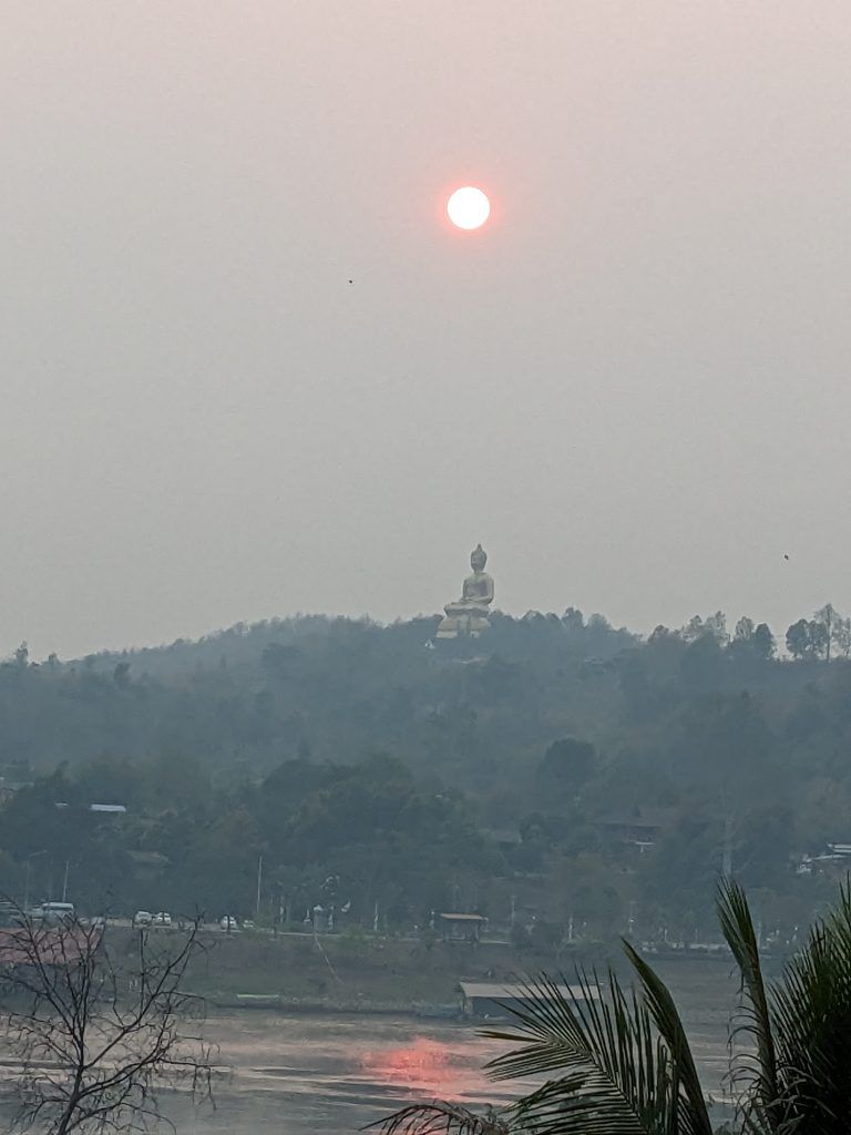 Sunset from Huay Xai looking across the river to Thailand and the golden Buddha on the hill.