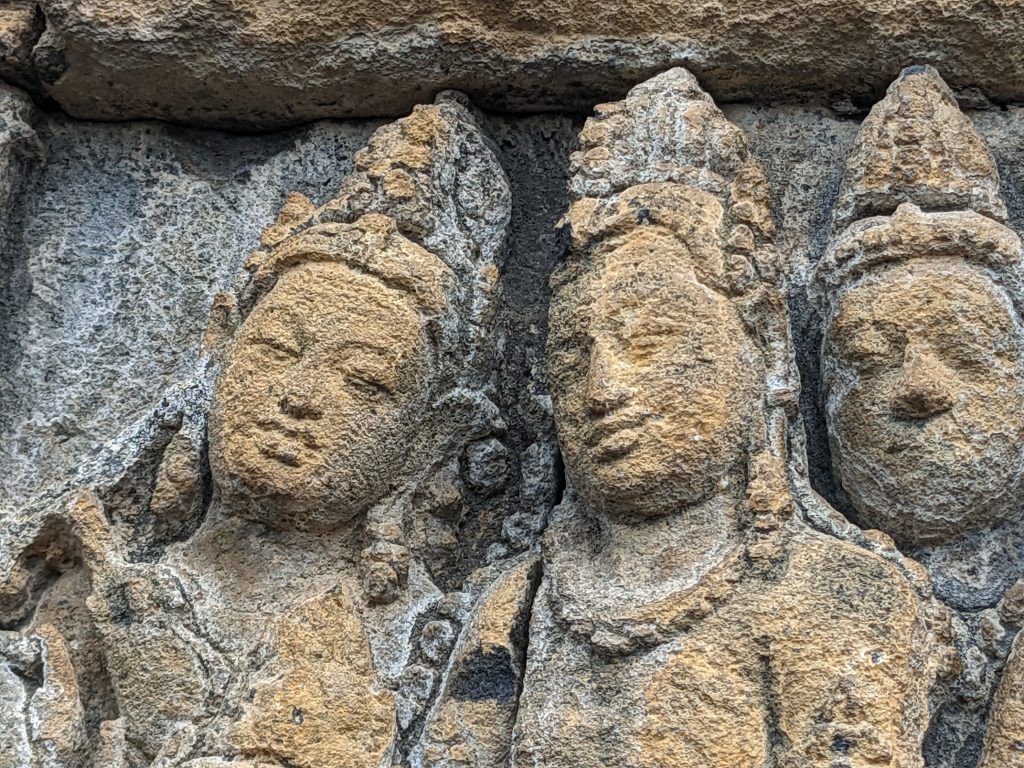Per Wikipedia, a lot about the temple is a mystery: “There are no known records of construction or the intended purpose of Borobudur. The duration of construction has been estimated by comparison of carved reliefs on the temple’s hidden foot and the inscriptions commonly used in royal charters during the 8th and 9th centuries. Borobudur was likely founded around 800 AD.This corresponds to the period between 760 and 830 AD, the peak of the Sailendra dynasty rule over the Mataram kingdom in central Java, when their power encompassed not only the Srivijayan Empire but also southern Thailand, Indianized kingdoms of Philippines, North Malaya (Kedah, also known in Indian texts as the ancient Hindu state of Kadaram). The construction has been estimated to have taken 75 years with completion during the reign of Samaratungga in 825.”
