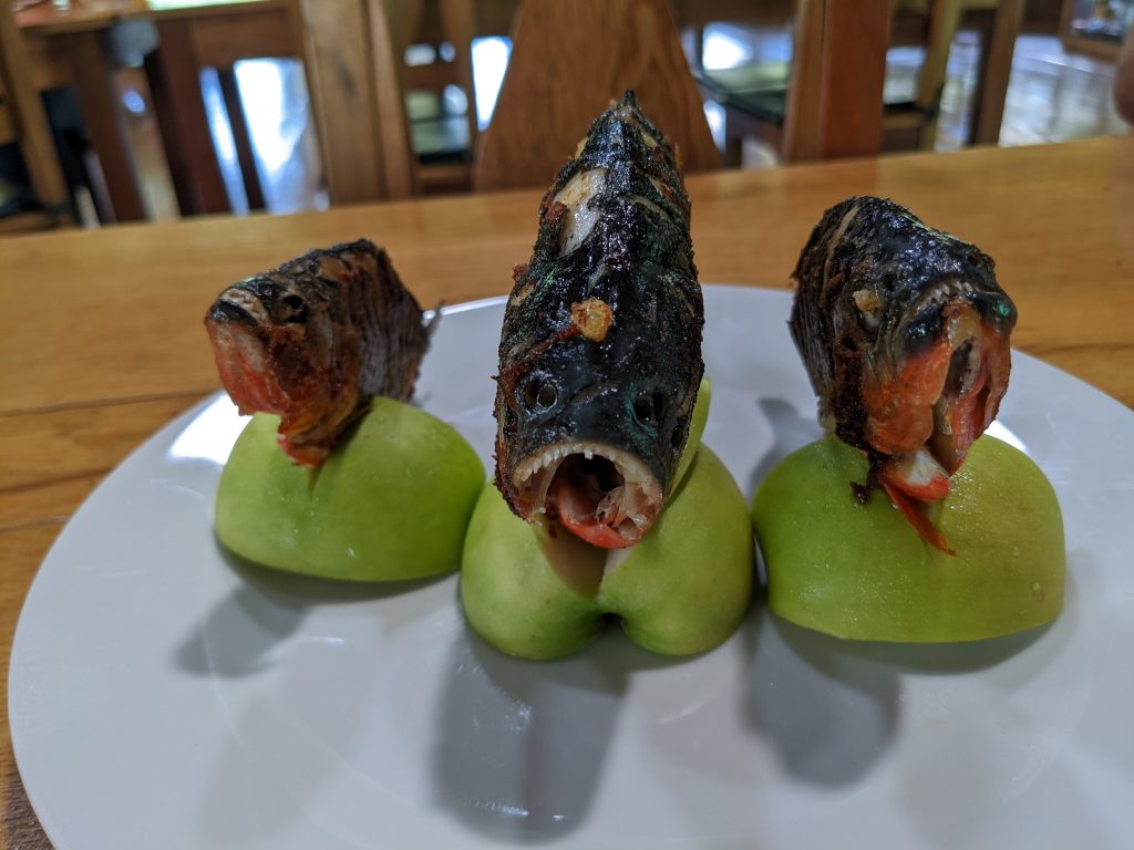 A couple of hours later the chef served up the larger one I caught and two more smaller ones my guide caught. They were sauteed in garlic and butter and tasted a lot better than they looked!