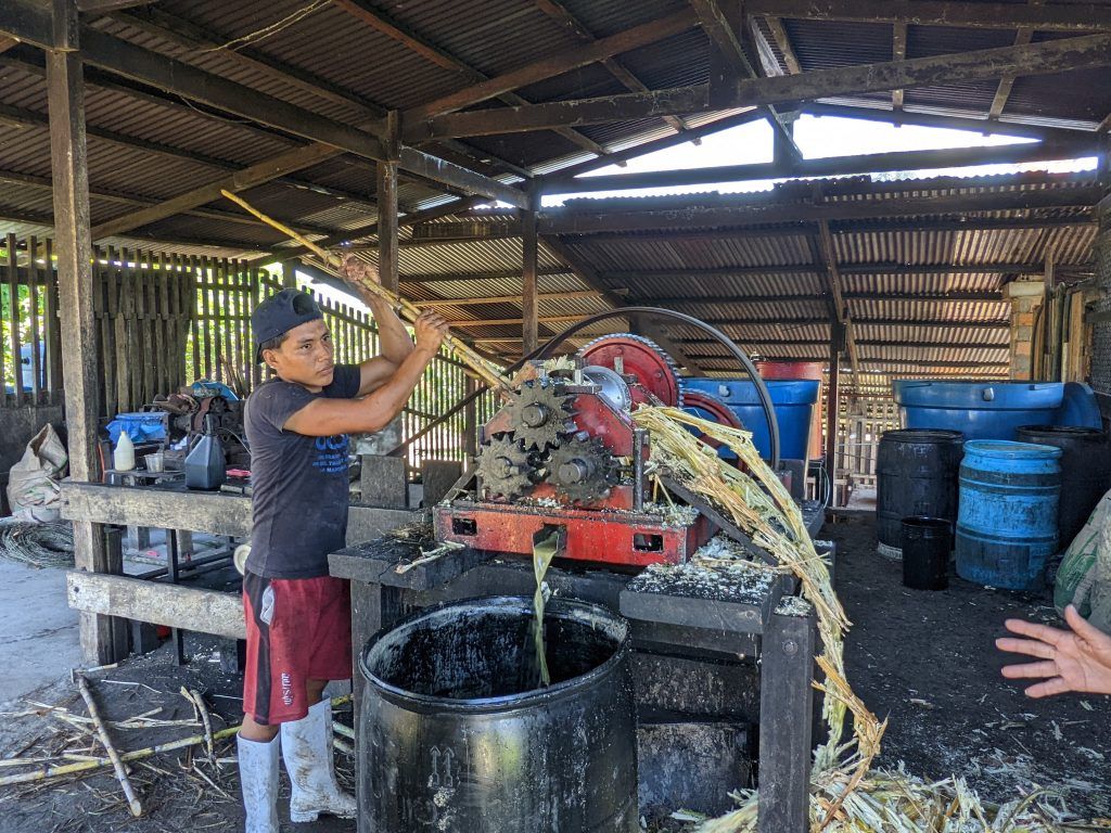 This machine grinds out the juice of the sugar cane. They can recycle and feed the pulp to various farm animals.