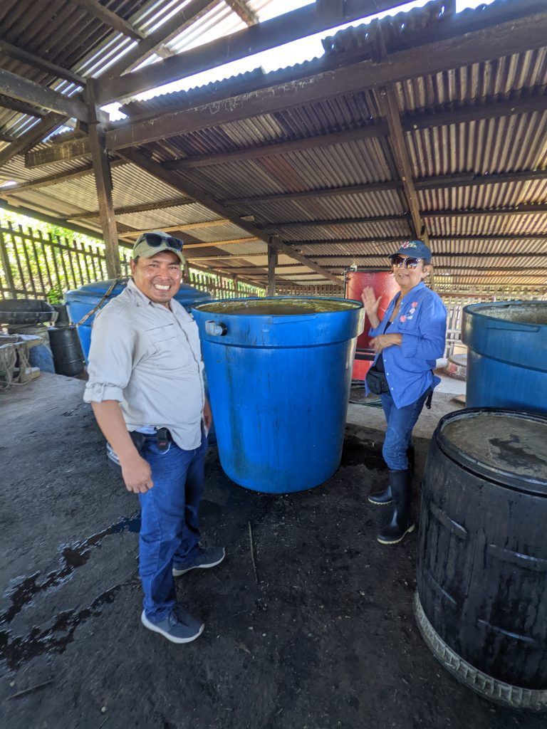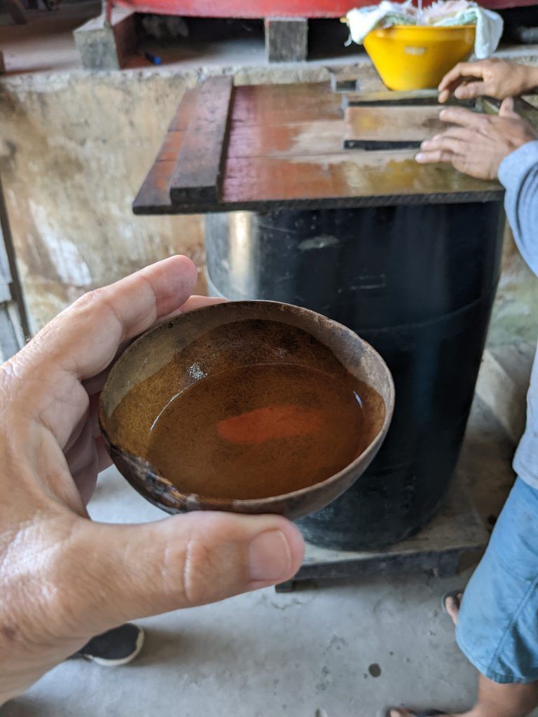 After sqeezing out the juice it ferments in the blue vats for 1-2 days. My guide Willy on the left and the owner on the right.