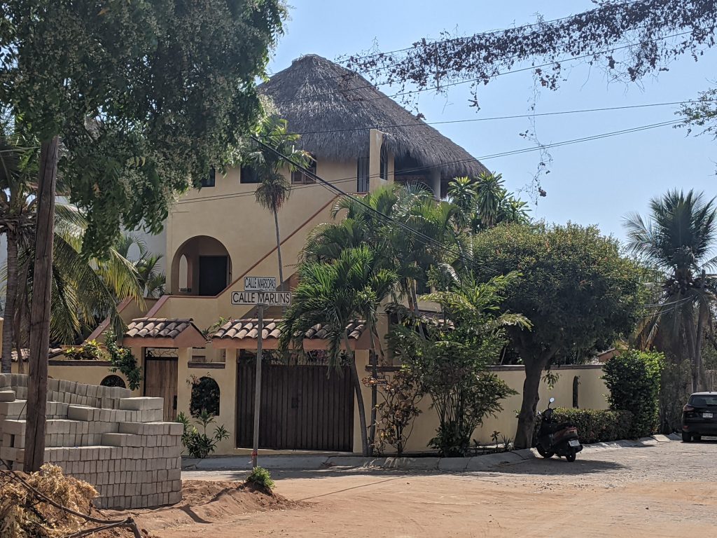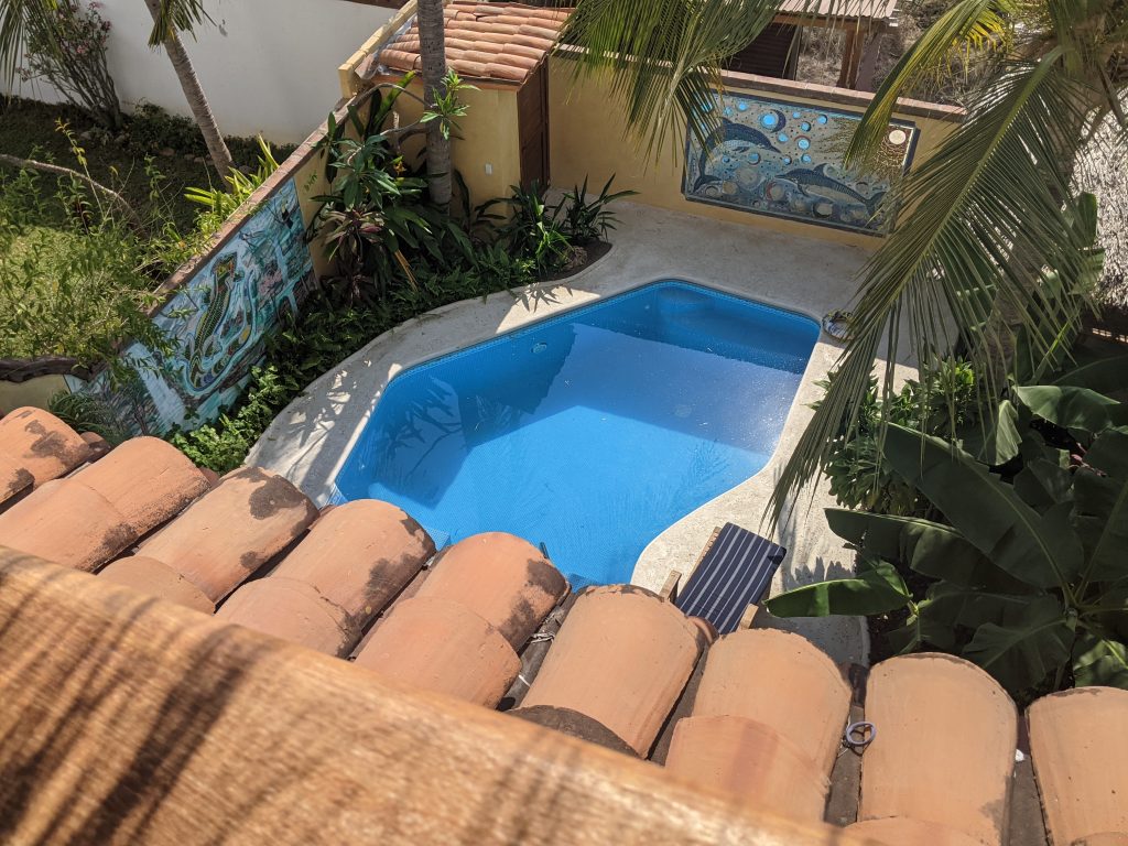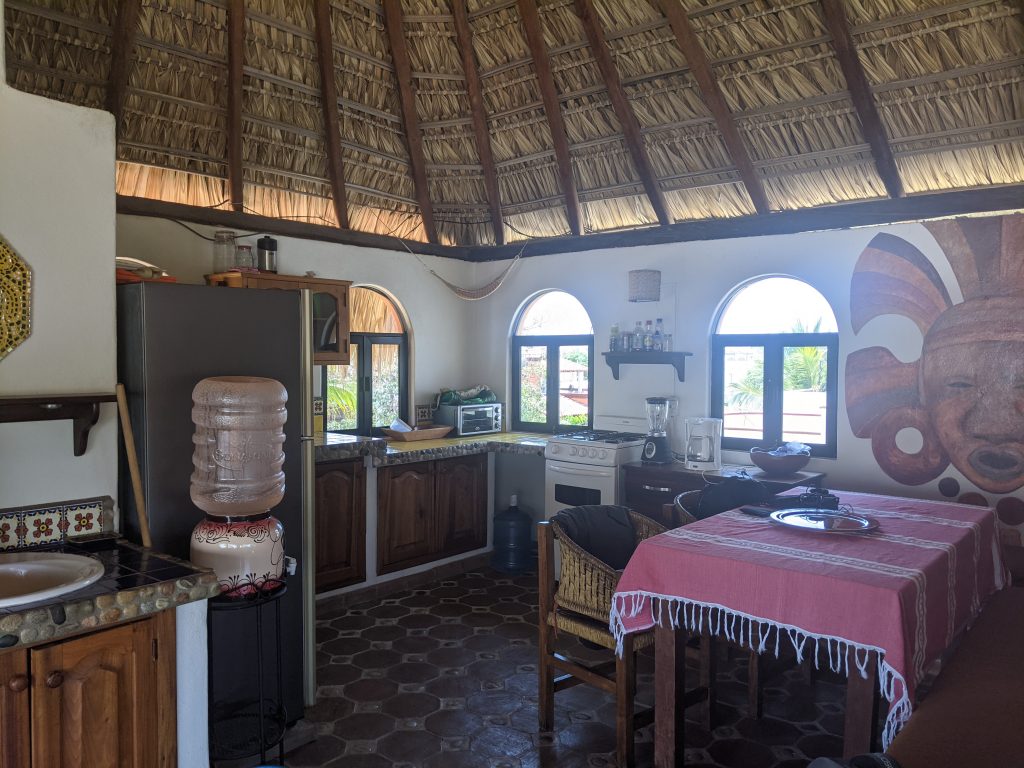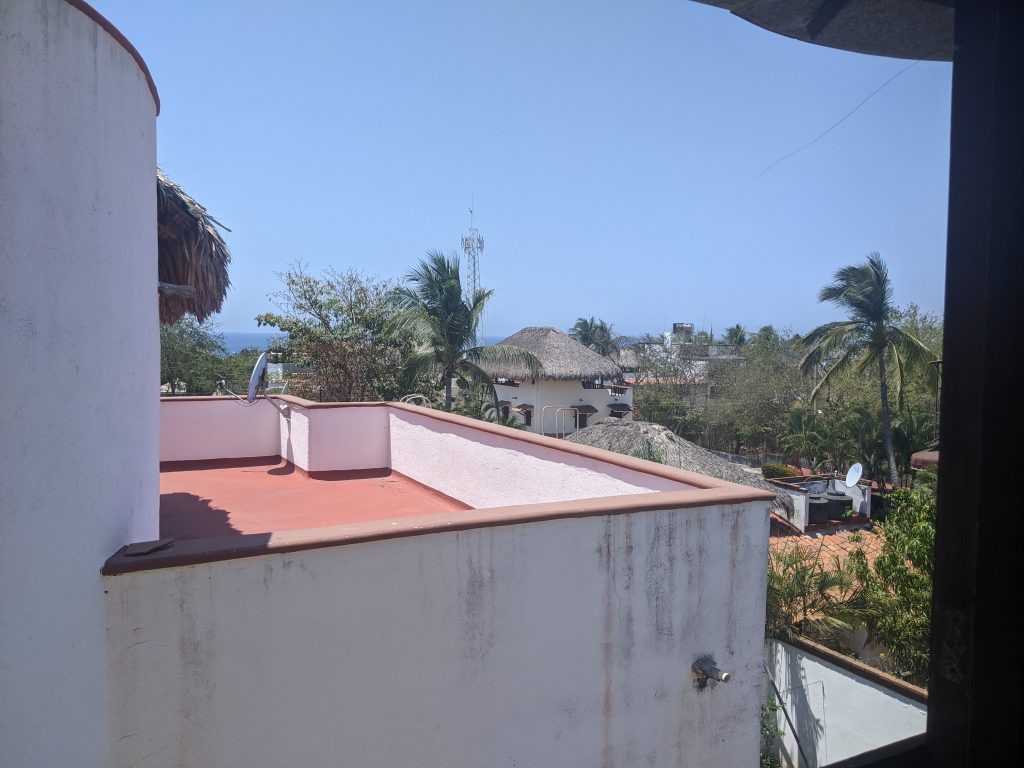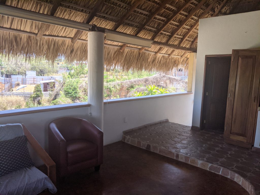 I’ll be staying in an amazing, large third floor palapa apartment which has no walls on two sides as the pictures below show. At night it feels a bit like camping as the breezes and night sounds blow through the open walls. It’s basically like living in a tree house! It’s owned by a retired American couple who live on the first floor.