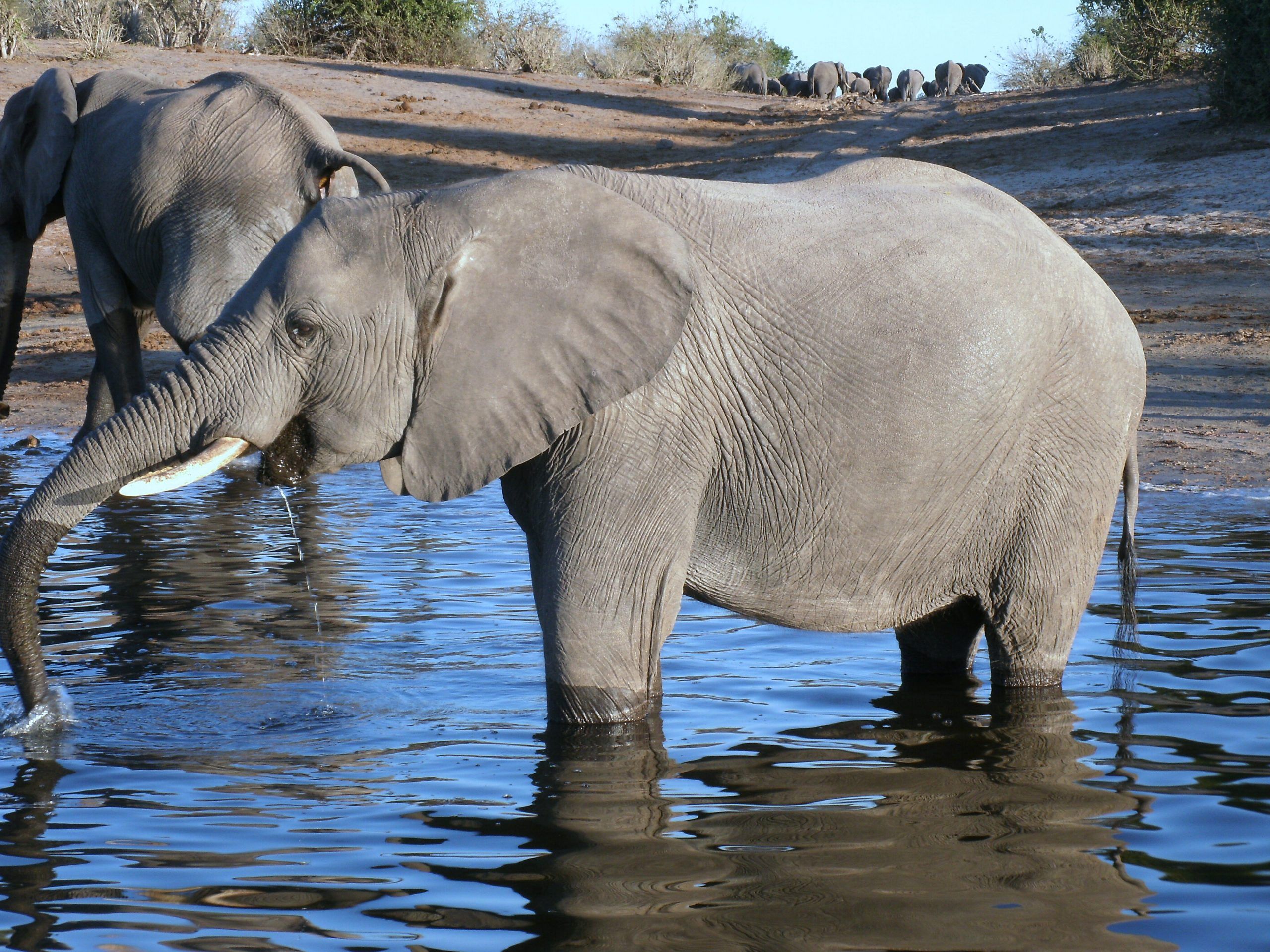 A major feature of Chobe National Park is its elephant population. It comprise part of what is probably the largest surviving continuous elephant population in the Africa. This population covers most of northern Botswana plus northwestern Zimbabwe. The Chobe elephant are migratory, making seasonal movements of up to 200 kilometers from the Chobe and Linyanti rivers, where they concentrate in the dry season, to the pans in the southeast of the park, to which they disperse in the rains. The elephants in this area have the distinction of being the largest in body size of all living elephants. The ivory is brittle and you will not see many huge tuskers among these rangy monsters.