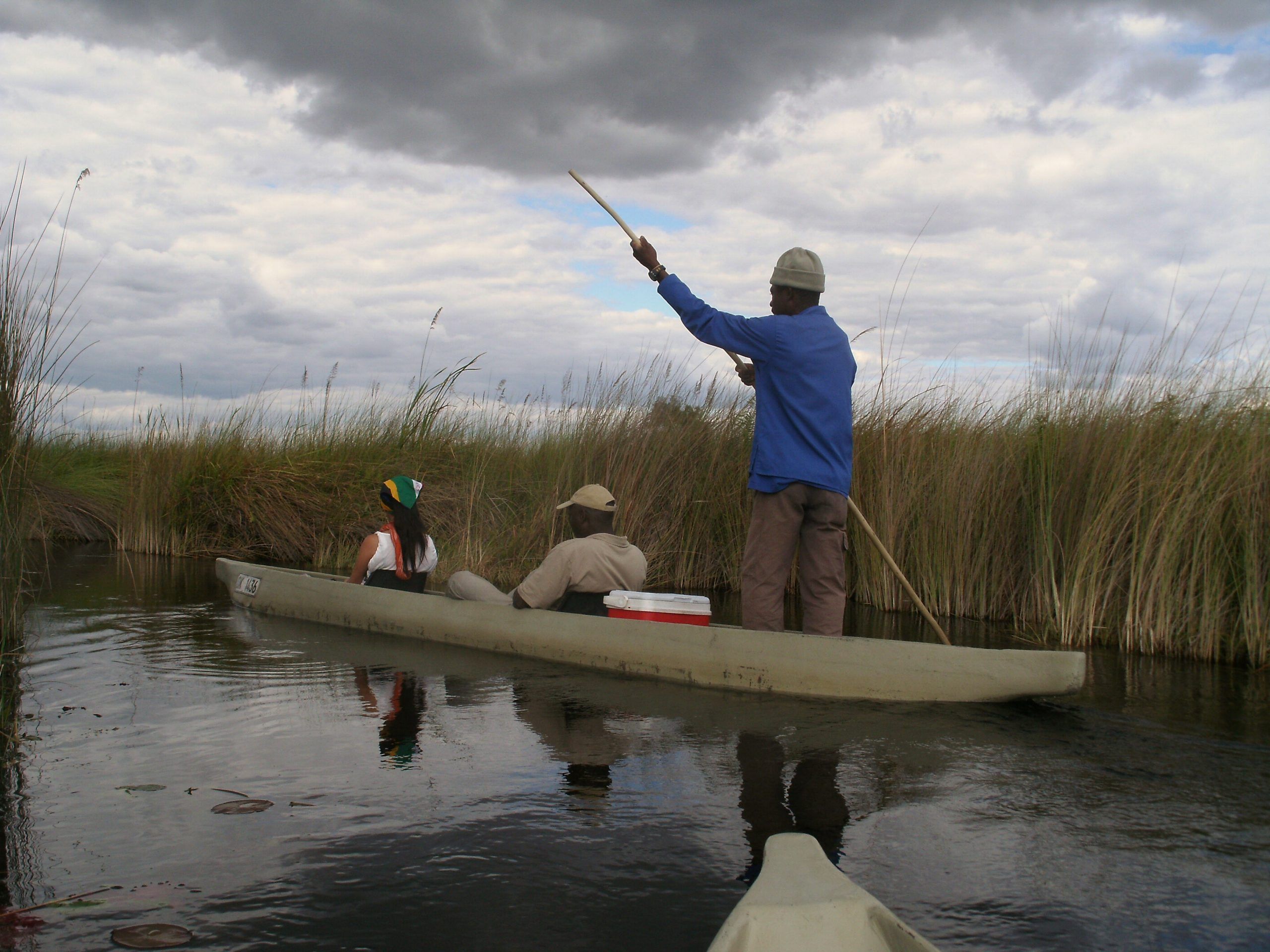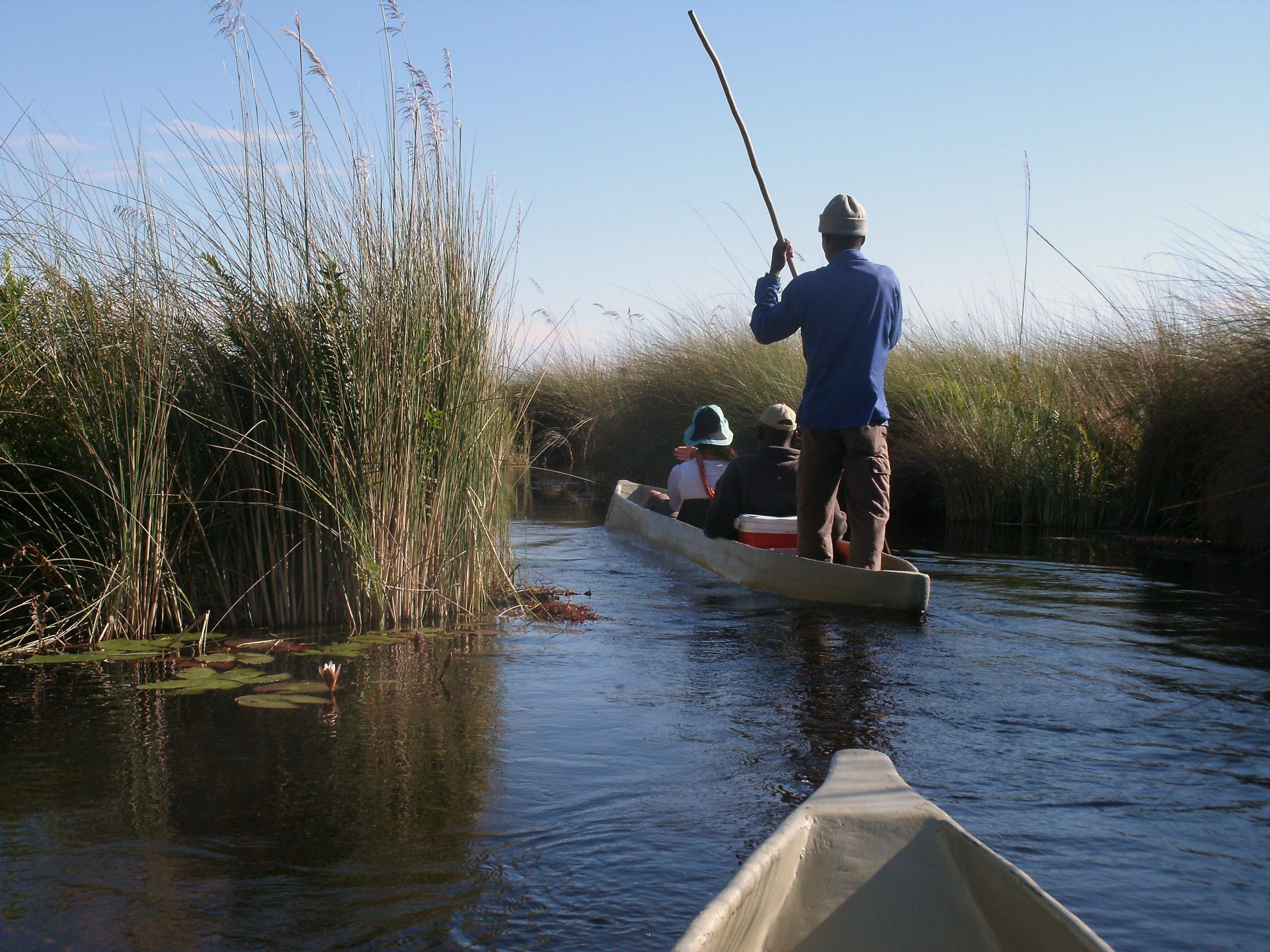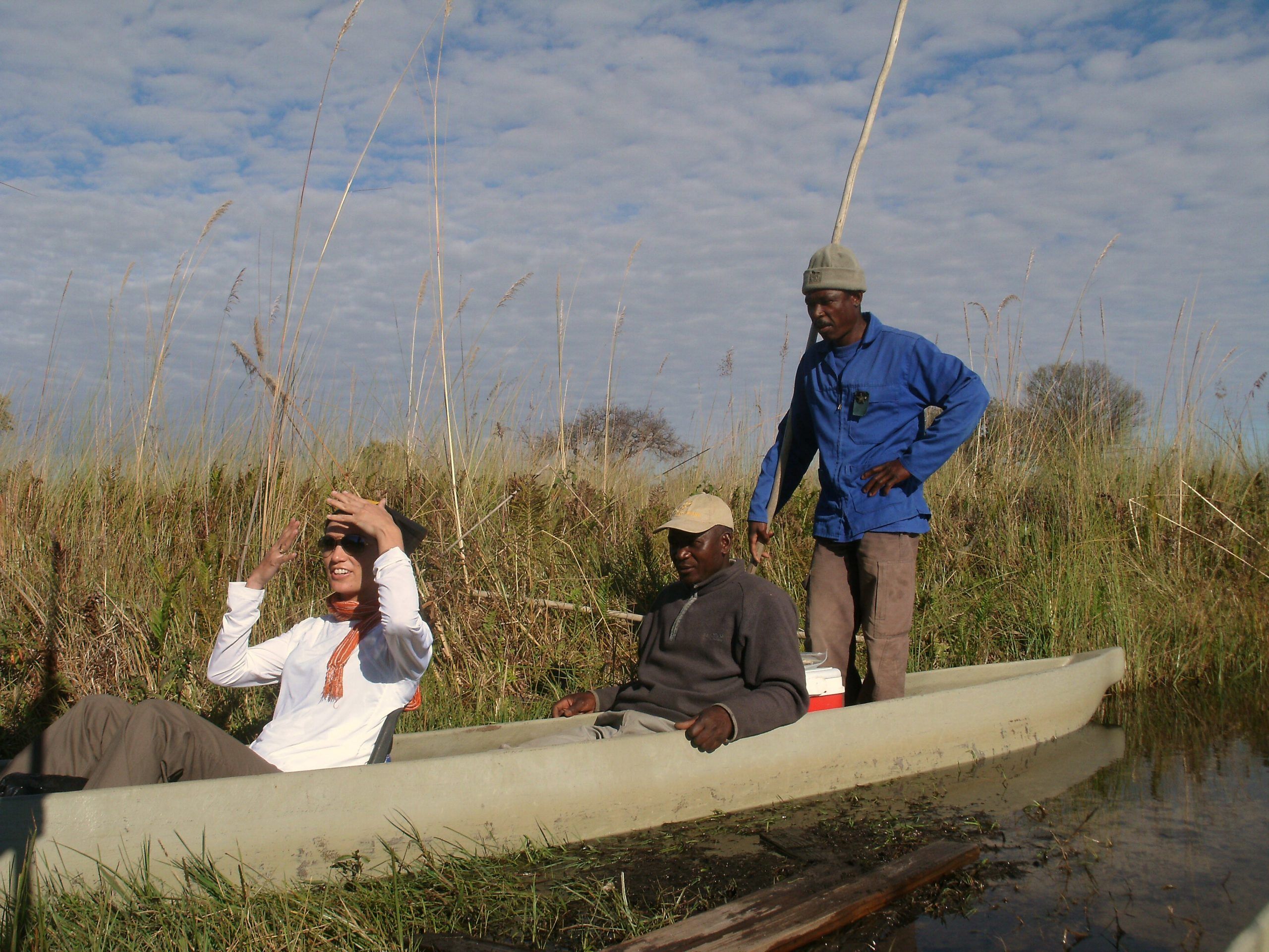 The BaYei people came to the Okavango Delta hundreds of years ago, bringing with them, their traditional mode of transport, the mokoro, a dug-out canoe made from a large straight tree such as a sausage tree or an ebony tree. The mokoro is ideally suited as transport in the delta. It can move quietly through shallow water, being pushed by the boatman using a long pole, moving along the narrow channels or cutting through the long grasses or papyrus.