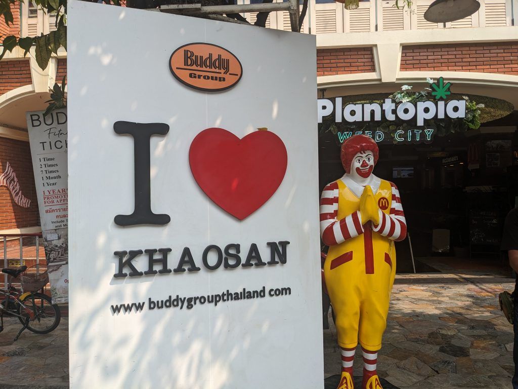 A perfect Khao San Road scene: a tourism sign, Ronald McDonald and a weed shop.