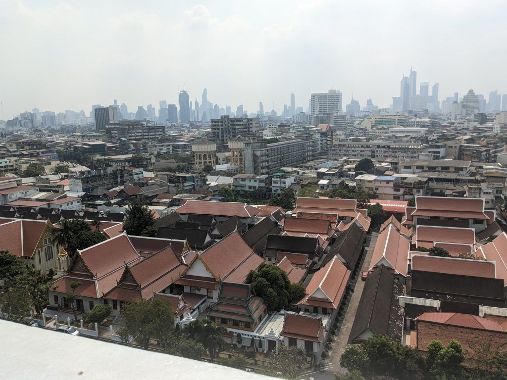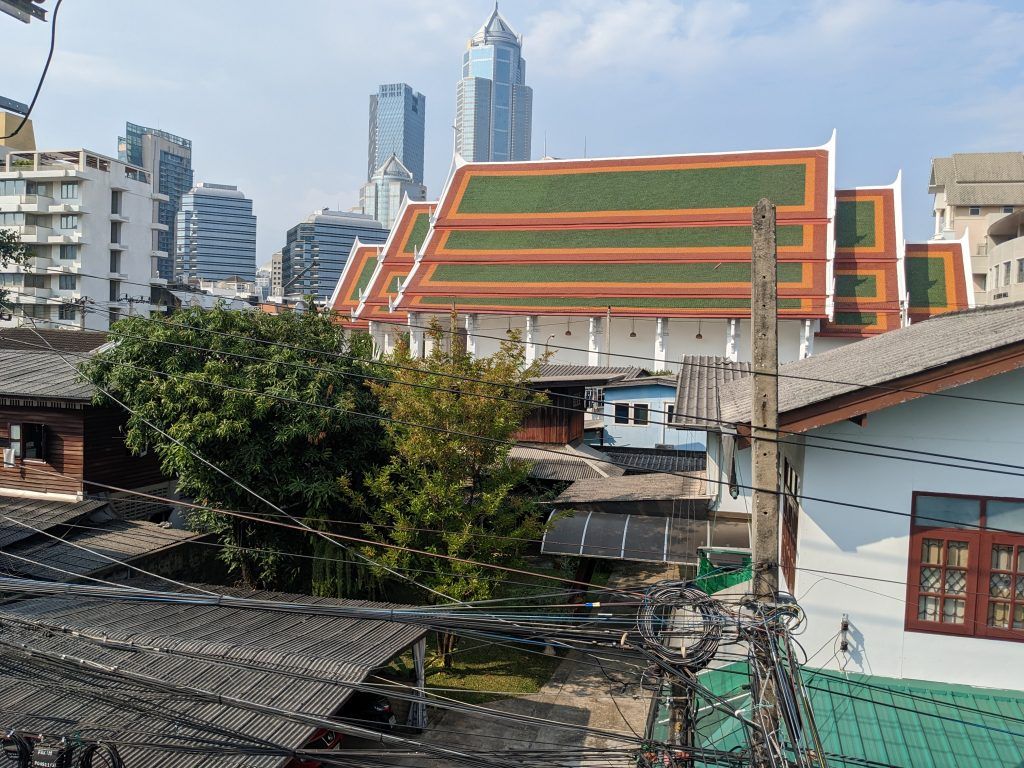 Some older housing juxtaposed against a large wat building and then some modern skyscrapers