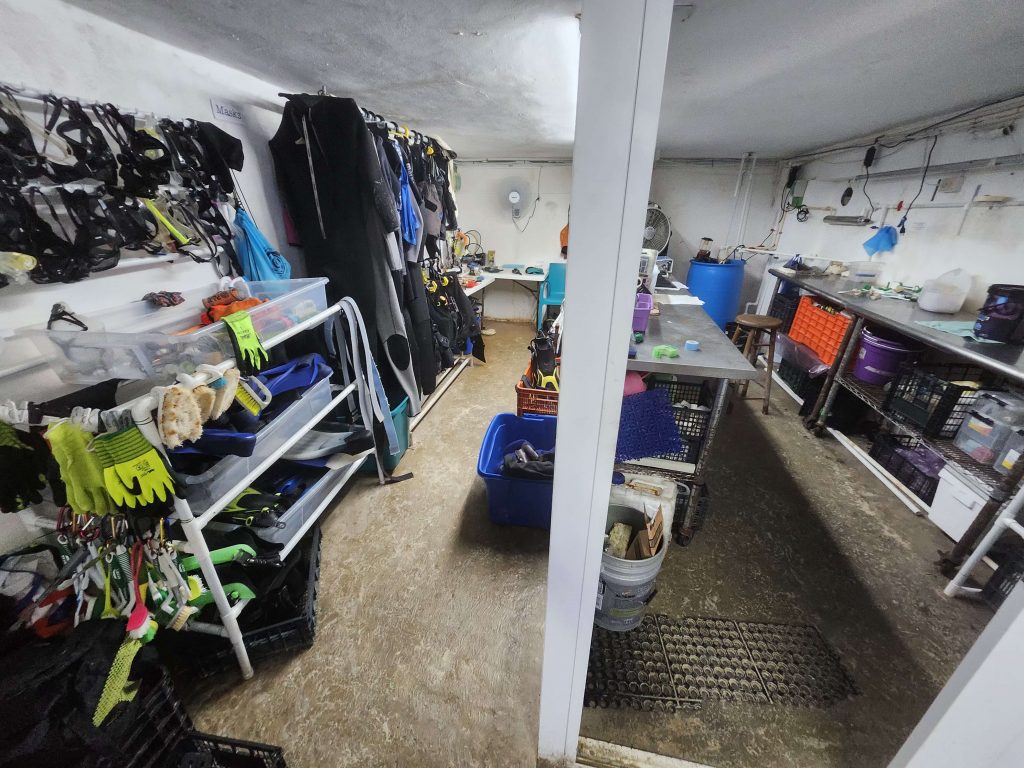 There’s a very simple room where the gear and their modest labwork is located.