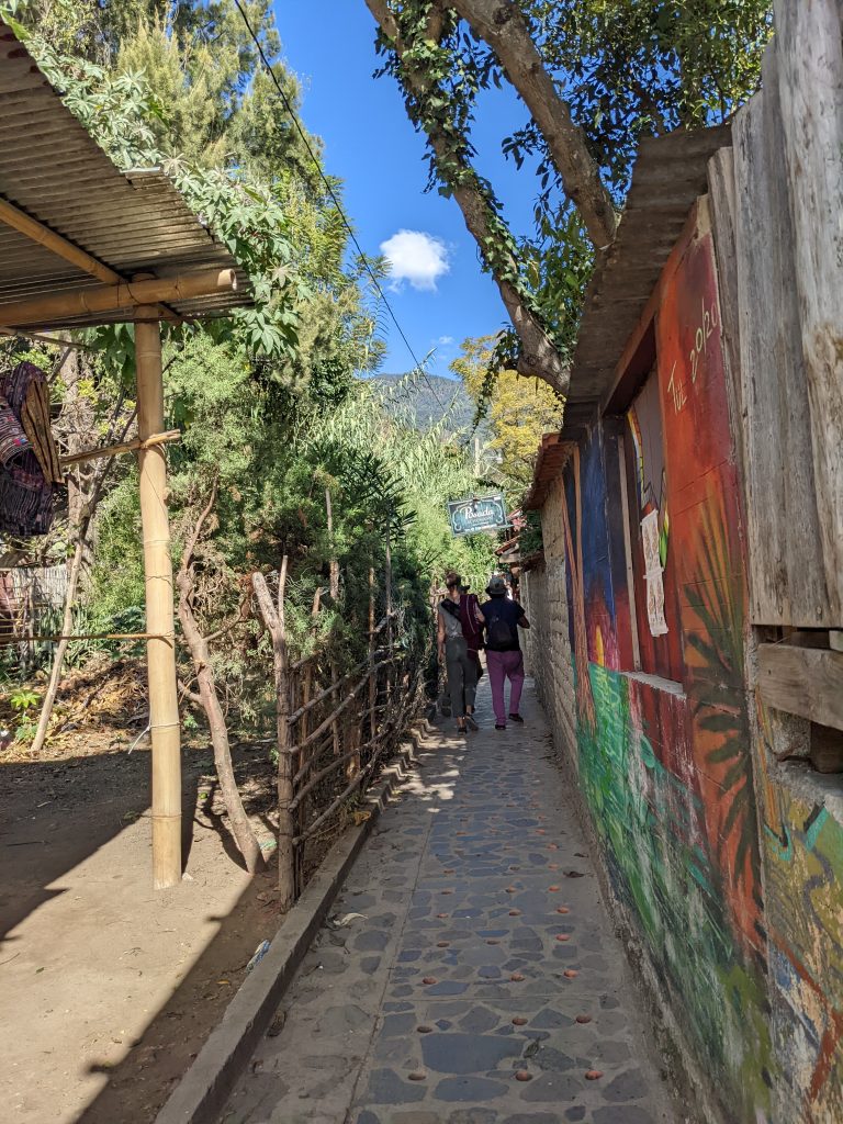 I did a first stop in the town of San Pedro, since I stayed there when I was here in the 90s. It has grown significantly since then. But it now has a nice town square. The small ferry dock in San MarcosThe main tourist corridor in tiny San MarcosLooking at the small village of TzunanaLooking out to part of Panajachel in the distancePart of a group of locals struggling with some heavy loads up the steep steps of the trailThe main street of Jaibalito. Just wide enough for a tuk tukTaking a break at a beautiful restaurant in JaibalitoLooking down at Santa Cruz