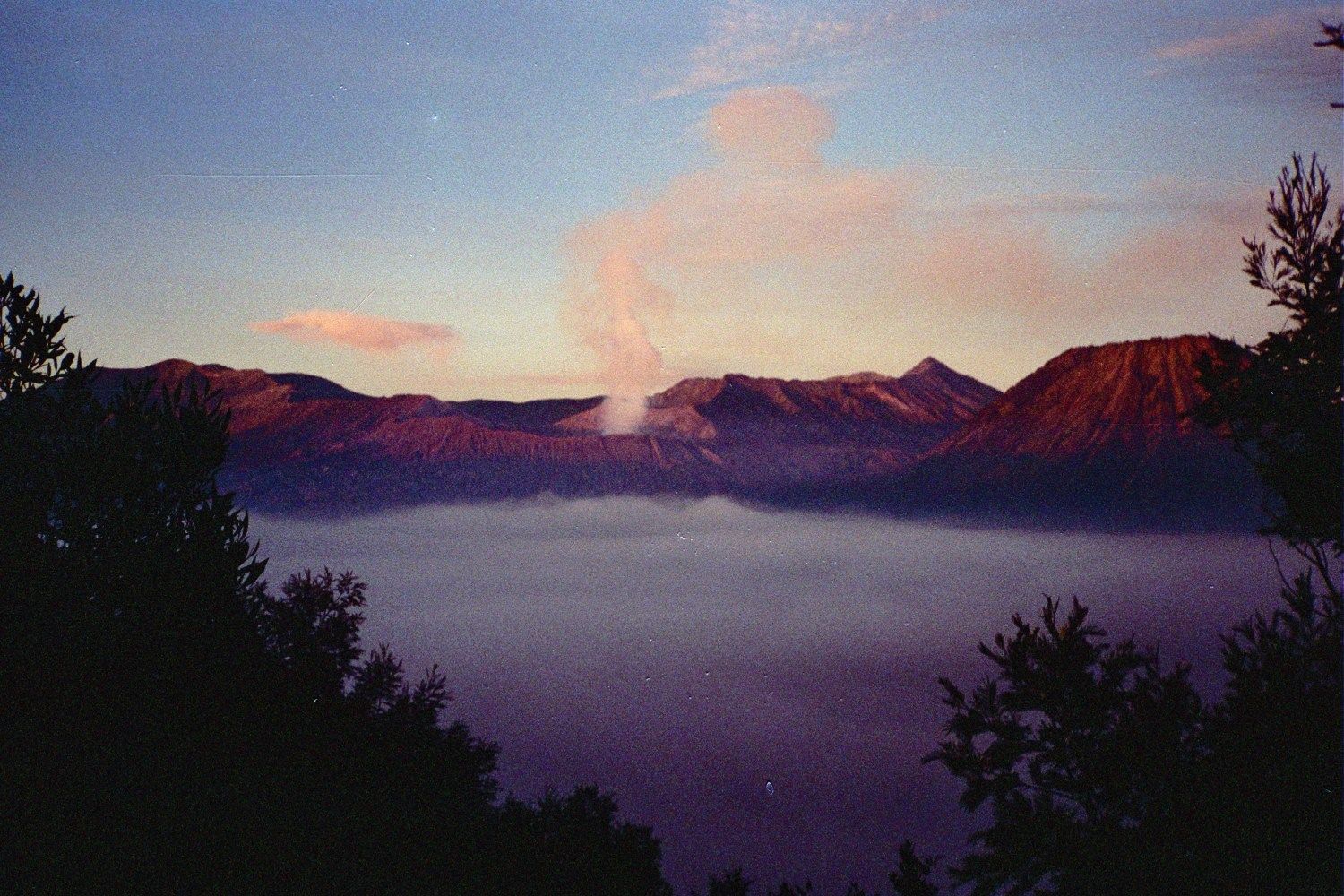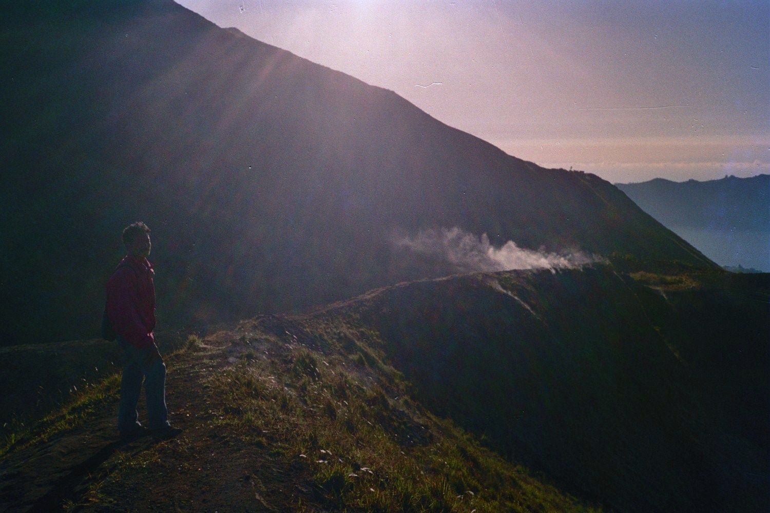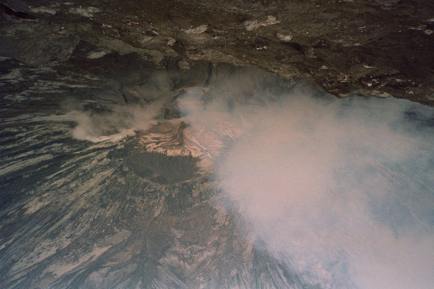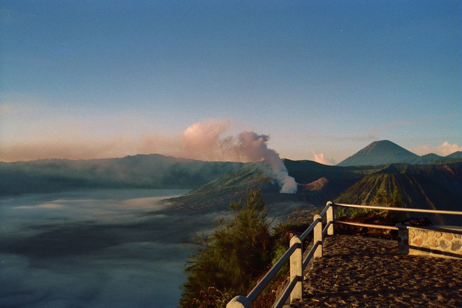 5/6 – Woken up at 3:30am and took jeep to viewing platform. Saw the creation of the world. As the sun slowly rose we could see a huge mist shrouded crater below us. Inside was a streaming volcano, Mt Bromo, and another cone shaped mountain. It was a stark, beautiful scene. Went back, took a nap and walked up to volcano. The larger crater was full of volcanic ash and a sea of soft green grass. The volcano itself was steep and rumbling with sulfuric steam belching out of it. It had gone off in 1840 and again in 1981. Wandered back, kicked back on a building foundation and watch the clouds come in. I was told we’re at around 2,000 meters. I could feel the elevation when I climbed to the volcano. Had lunch at a very quiet restaurant. Just me and a bunch of flies, but meal was cheap and good. Went back to guest house restaurant and talked to Allison and an American journalist/ photographer. He left to camp on the volcano rim to take sunset/star/sunrise photos. He had been all over the world and told us how frustrating his field could be to get steady work; there were just too many other people doing this. She had spent one year in Africa and had been robbed in Nairobi. She had been all over south and east Africa. Did some volunteer work and did some heavy, random backpacking. I showed her my Africa letters and promised to send her some copies. I ended up watching a beautiful sunset and eating dinner at that small restaurant, again the only customer. I started getting the chills from the cold weather so I went to bed early.