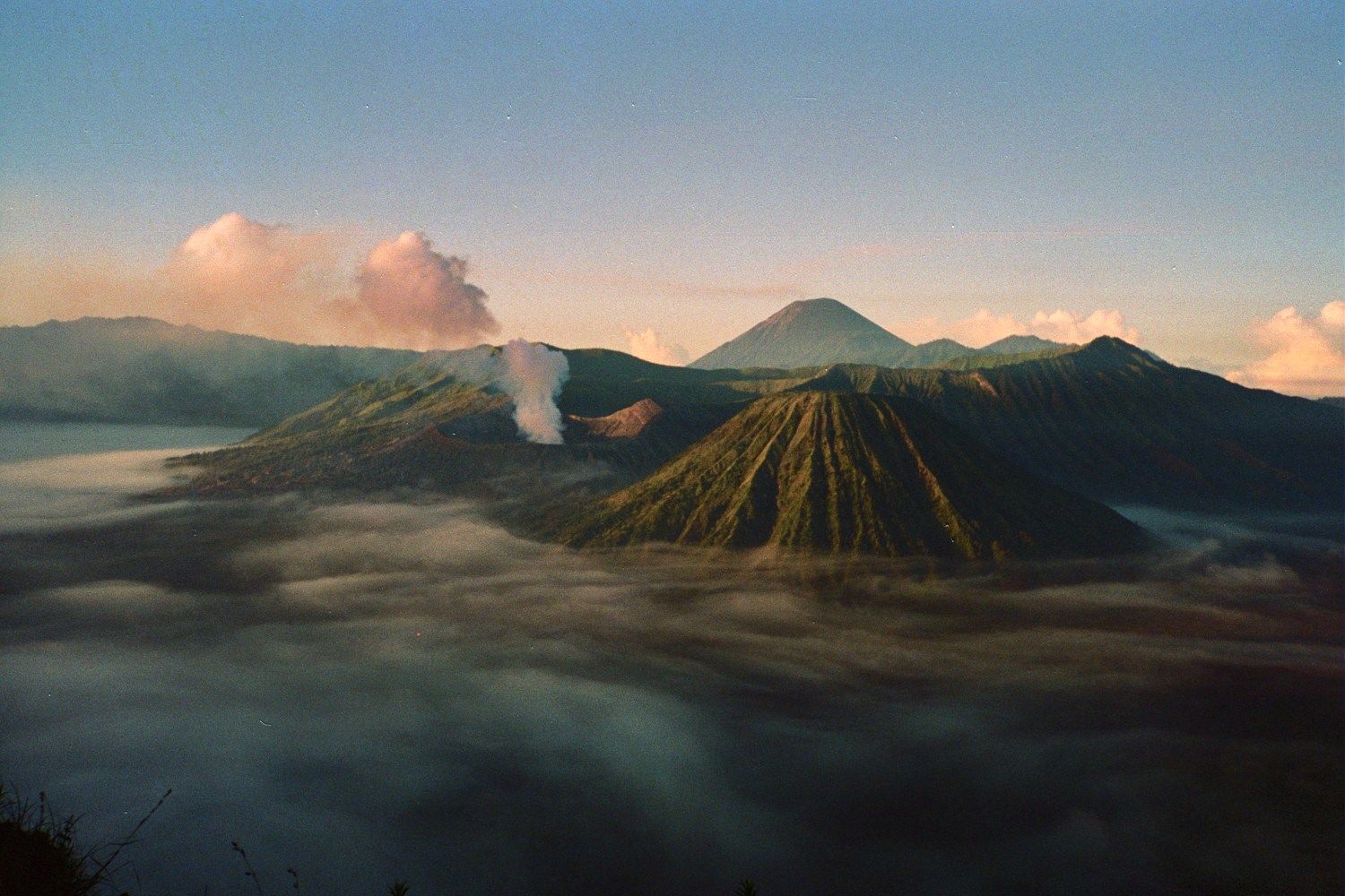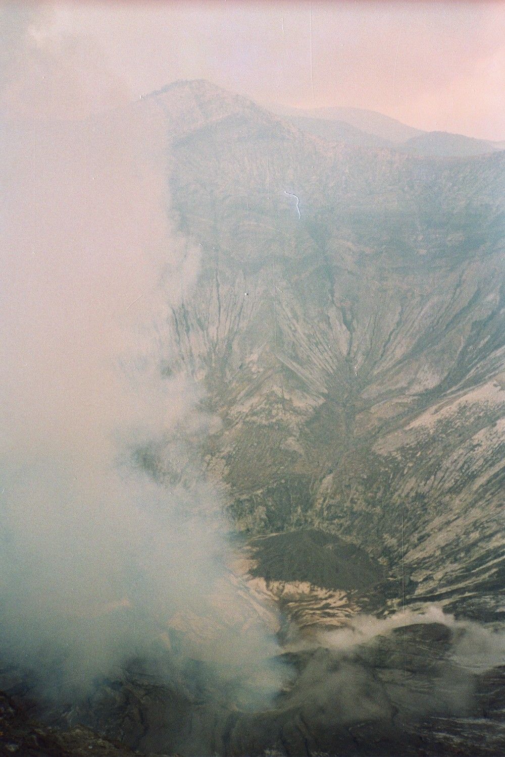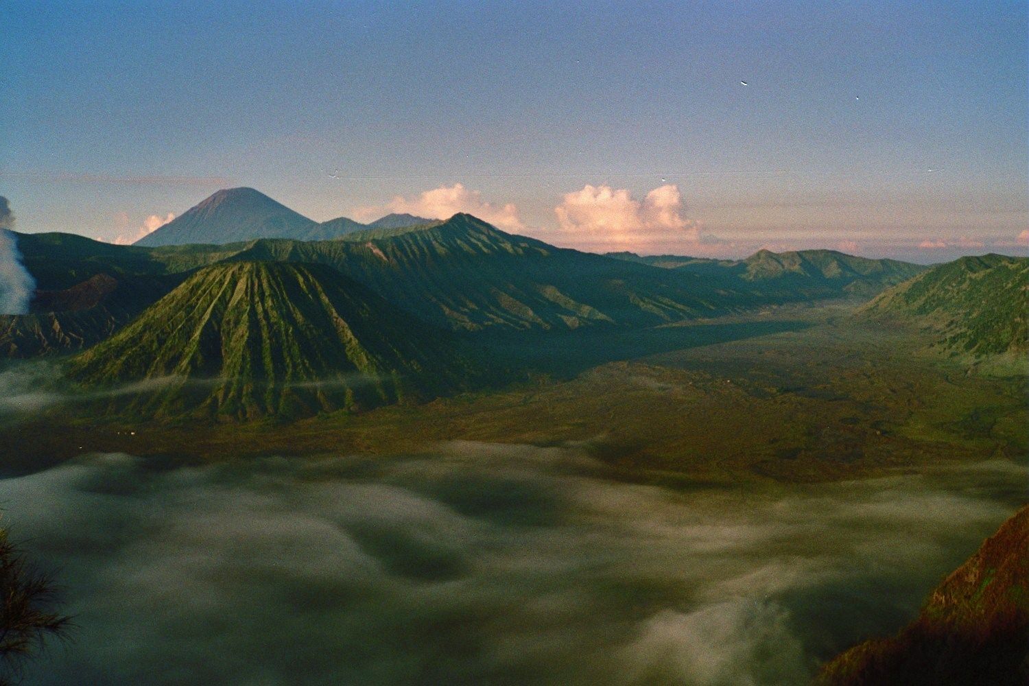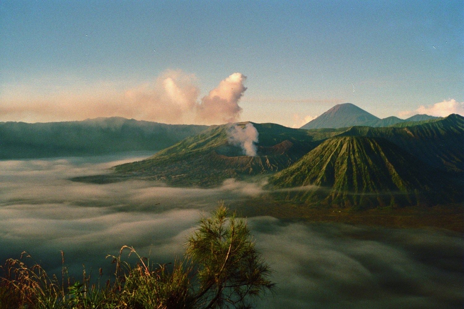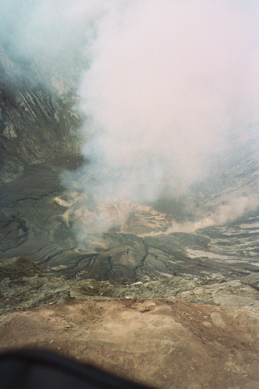 5/6 – Woken up at 3:30am and took jeep to viewing platform. Saw the creation of the world. As the sun slowly rose we could see a huge mist shrouded crater below us. Inside was a streaming volcano, Mt Bromo, and another cone shaped mountain. It was a stark, beautiful scene. Went back, took a nap and walked up to volcano. The larger crater was full of volcanic ash and a sea of soft green grass. The volcano itself was steep and rumbling with sulfuric steam belching out of it. It had gone off in 1840 and again in 1981. Wandered back, kicked back on a building foundation and watch the clouds come in. I was told we’re at around 2,000 meters. I could feel the elevation when I climbed to the volcano. Had lunch at a very quiet restaurant. Just me and a bunch of flies, but meal was cheap and good. Went back to guest house restaurant and talked to Allison and an American journalist/ photographer. He left to camp on the volcano rim to take sunset/star/sunrise photos. He had been all over the world and told us how frustrating his field could be to get steady work; there were just too many other people doing this. She had spent one year in Africa and had been robbed in Nairobi. She had been all over south and east Africa. Did some volunteer work and did some heavy, random backpacking. I showed her my Africa letters and promised to send her some copies. I ended up watching a beautiful sunset and eating dinner at that small restaurant, again the only customer. I started getting the chills from the cold weather so I went to bed early.