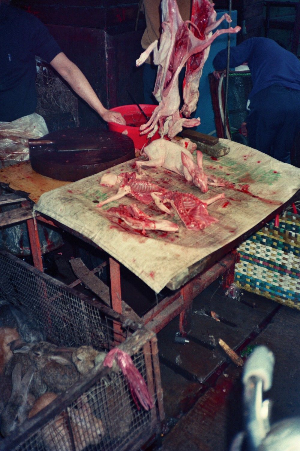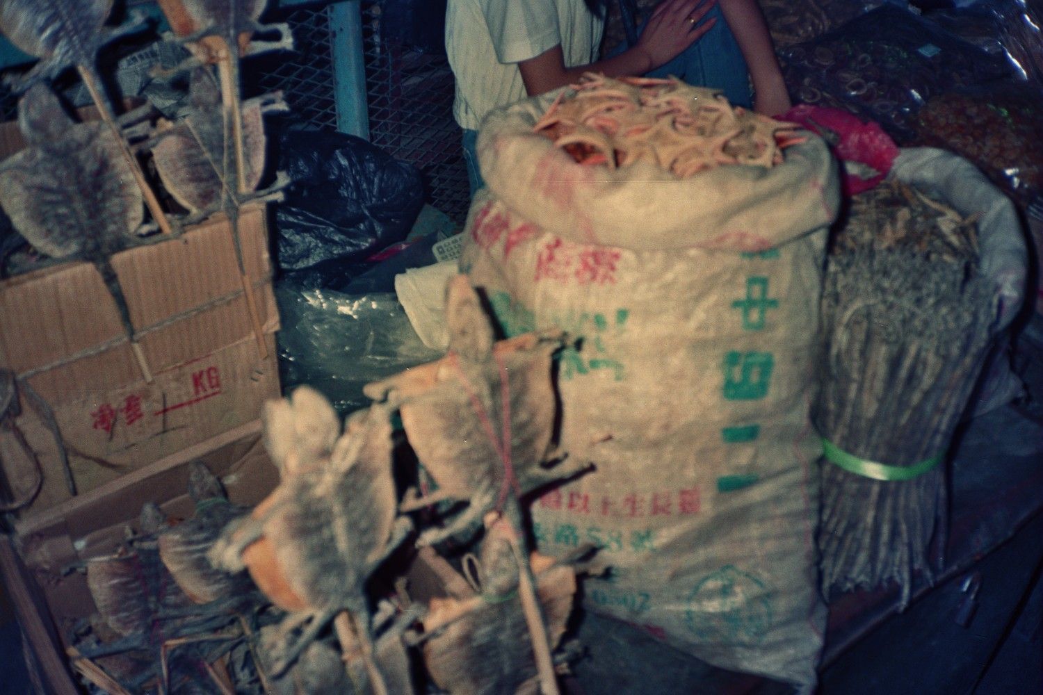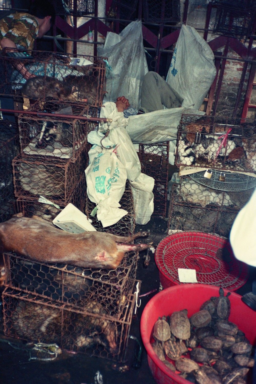 4/7 – Arrived in Guangzhou. Kim, Lenn and I walked over Pearl River Bridge. Glenn and I got room in youth hostel. Glenn and I walked up to beautiful Chinese school. On the way went to Qingping Market. Saw all sorts of animals in cages to be eaten. Saw live, breathing skinned rabbit. Stepped on a dead frog. Bags of dried bugs, snakes, seahorses, etc. School/gallery was beautiful. Met Tang and Su; two Chinese who worked there. Had very difficult time catching bus or taxi back to Shamian Island. Went to dinner with Tang. After dinner had “tea” at another restaurant and more food and beers. This was an official communist party restaurant. Had fun with some Chinese children at restaurant. Tang forgot his wallet and lost big face when Glenn paid the bill. He also wants us to do a favor for his English teacher – which happens to be Su. We will meet tomorrow night.