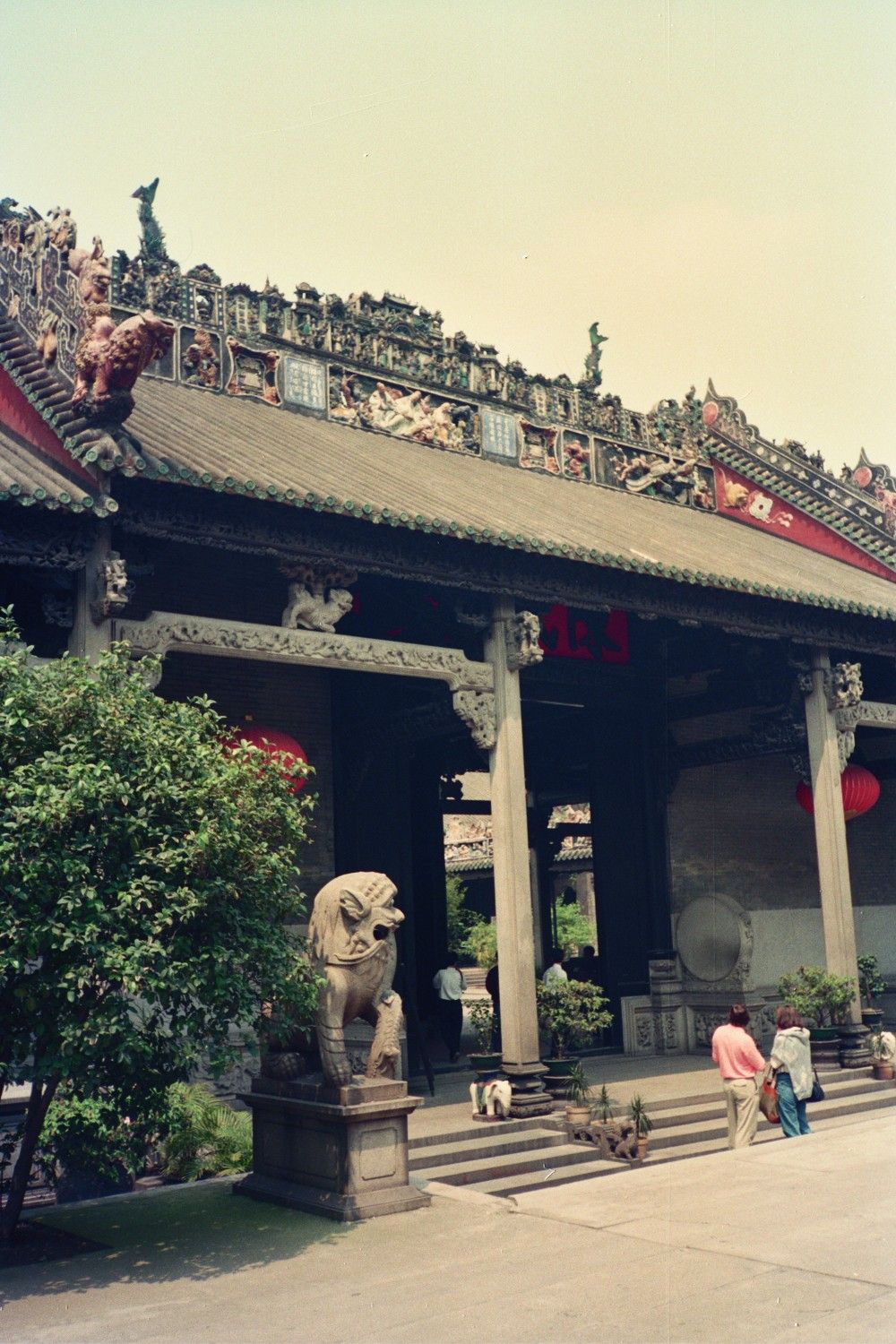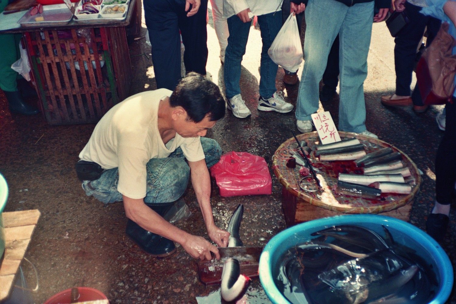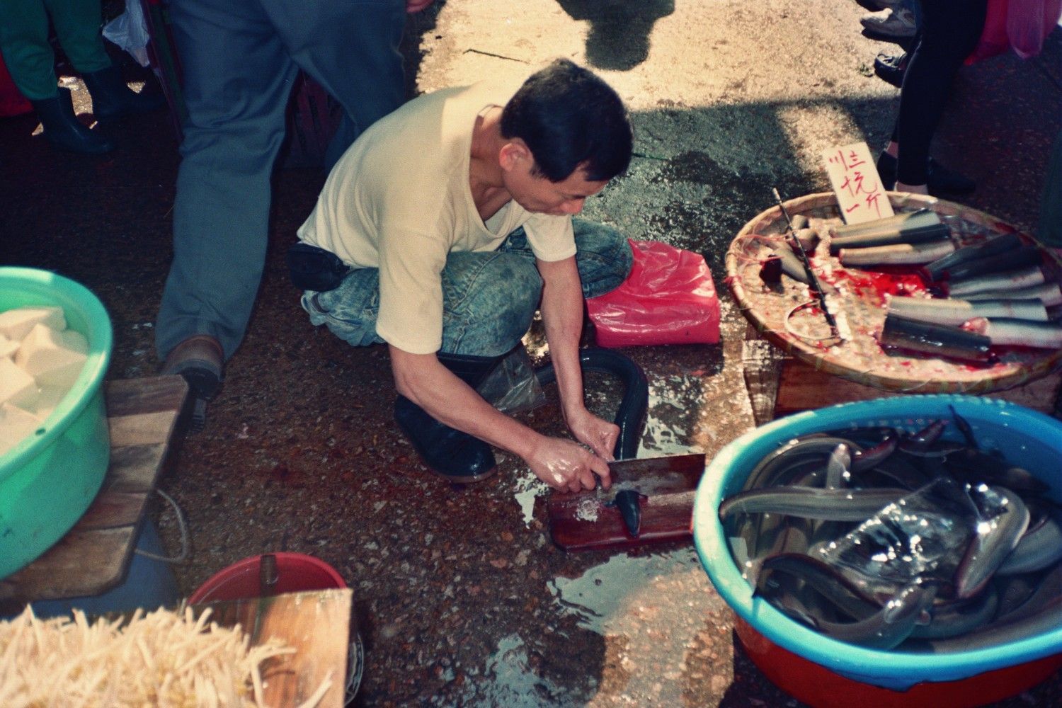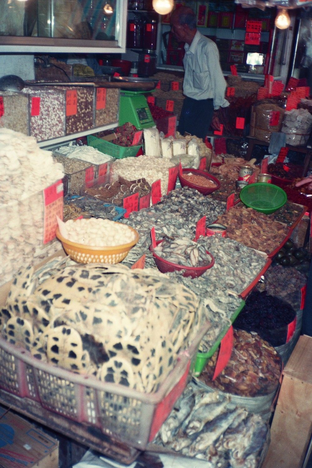 4/7 – Arrived in Guangzhou. Kim, Lenn and I walked over Pearl River Bridge. Glenn and I got room in youth hostel. Glenn and I walked up to beautiful Chinese school. On the way went to Qingping Market. Saw all sorts of animals in cages to be eaten. Saw live, breathing skinned rabbit. Stepped on a dead frog. Bags of dried bugs, snakes, seahorses, etc. School/gallery was beautiful. Met Tang and Su; two Chinese who worked there. Had very difficult time catching bus or taxi back to Shamian Island. Went to dinner with Tang. After dinner had “tea” at another restaurant and more food and beers. This was an official communist party restaurant. Had fun with some Chinese children at restaurant. Tang forgot his wallet and lost big face when Glenn paid the bill. He also wants us to do a favor for his English teacher – which happens to be Su. We will meet tomorrow night.
