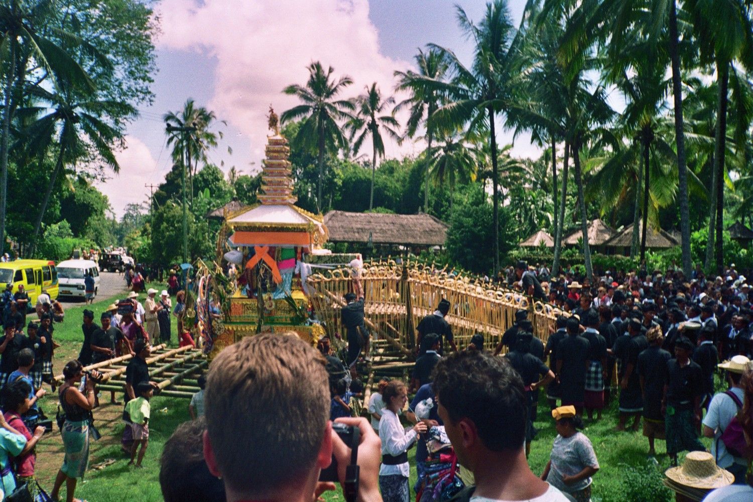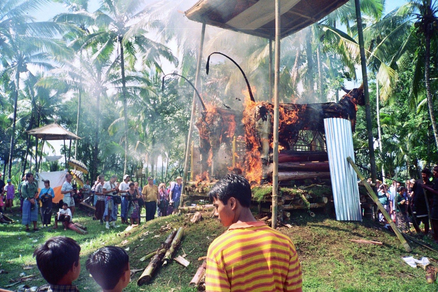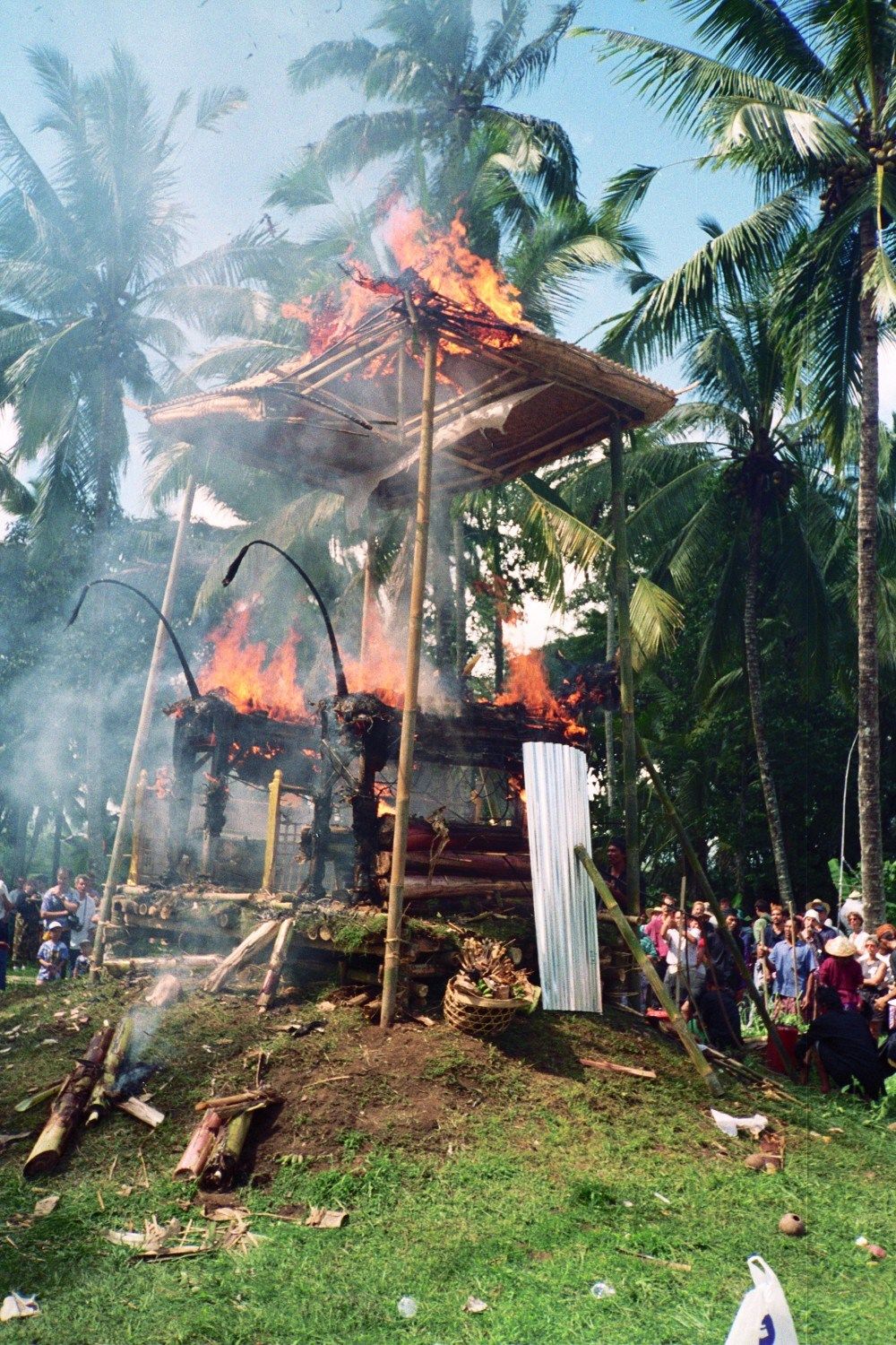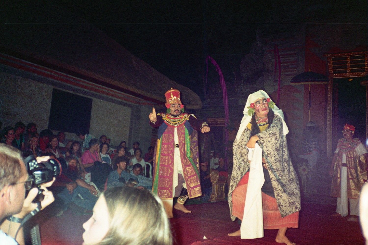 5/13 – Woke up and felt bad. Bad stomach, chills, light fever and headache. Ended up buying a tape of Balinese dance music, then going to post office and mailing all my purchases home for about $10, which will take 2-3 months by boat. Went to see cremation ceremony in a village about 12km away. Waited around for almost an hour, then a small procession came by with men dressed in black, women in black shirts with a black or green tops, a float with two black cow figures and a golden, flowery float which contained two bodies. Followed the procession to a clearing. The bodies were taken off the golden float in boxes, paraded around, then place in the two hollow cows. People climbed up to the cows and stood there and dropped things in. Finally, after a lot of preparation, they burnt the logs under the bodies. After all the wrappings burned you could actually see the human shapes, especially the charred feet and toes. Afterwards I went back, finished the book I was reading, showered and went to a Berong dance at the Ubud Temple. Beautiful costumes, the story of a wizard warding off the magic of a sorceress – but I think after four straight nights, I’m getting a bit burnt out of the dances. My favorite by far was the chanting of the Kekak dance on the second night. Still felt ill, so went to bed early.