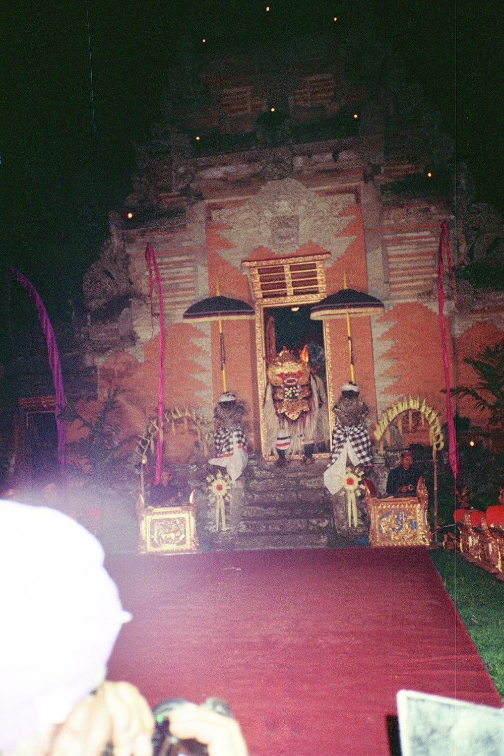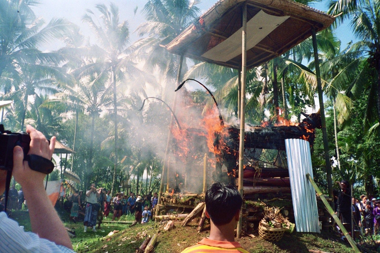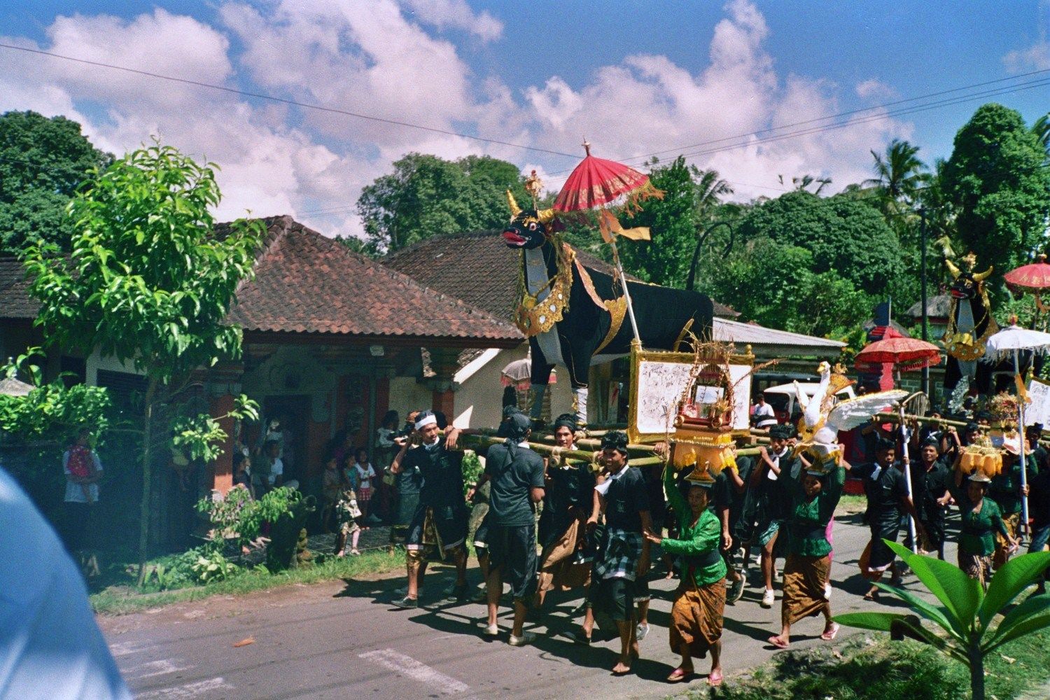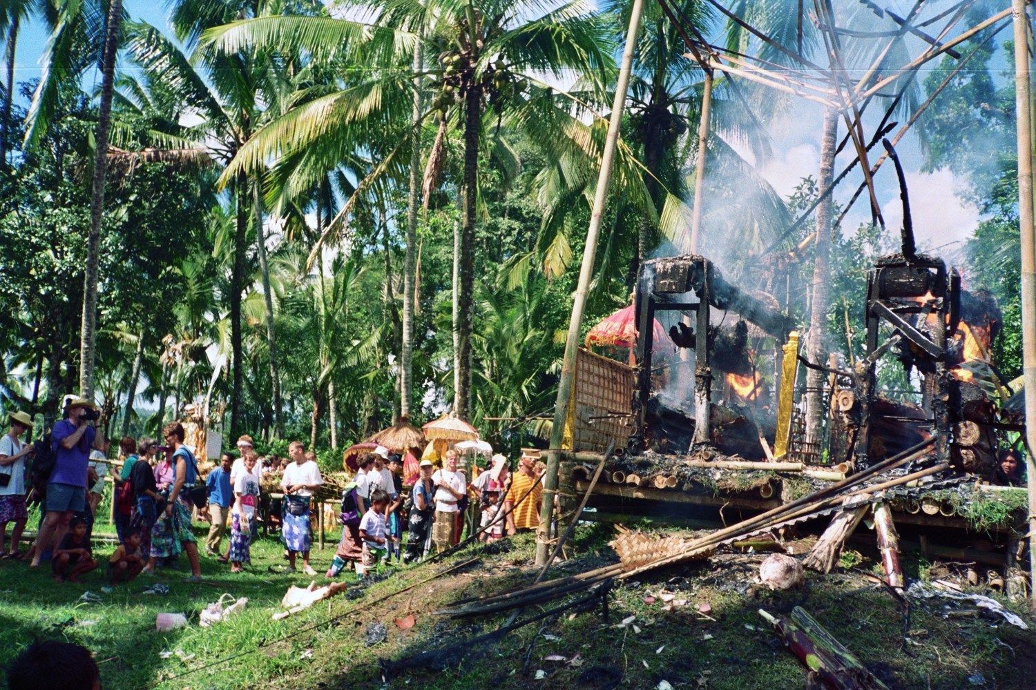 5/13 – Woke up and felt bad. Bad stomach, chills, light fever and headache. Ended up buying a tape of Balinese dance music, then going to post office and mailing all my purchases home for about $10, which will take 2-3 months by boat. Went to see cremation ceremony in a village about 12km away. Waited around for almost an hour, then a small procession came by with men dressed in black, women in black shirts with a black or green tops, a float with two black cow figures and a golden, flowery float which contained two bodies. Followed the procession to a clearing. The bodies were taken off the golden float in boxes, paraded around, then place in the two hollow cows. People climbed up to the cows and stood there and dropped things in. Finally, after a lot of preparation, they burnt the logs under the bodies. After all the wrappings burned you could actually see the human shapes, especially the charred feet and toes. Afterwards I went back, finished the book I was reading, showered and went to a Berong dance at the Ubud Temple. Beautiful costumes, the story of a wizard warding off the magic of a sorceress – but I think after four straight nights, I’m getting a bit burnt out of the dances. My favorite by far was the chanting of the Kekak dance on the second night. Still felt ill, so went to bed early.