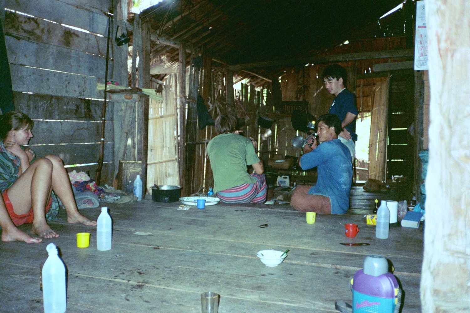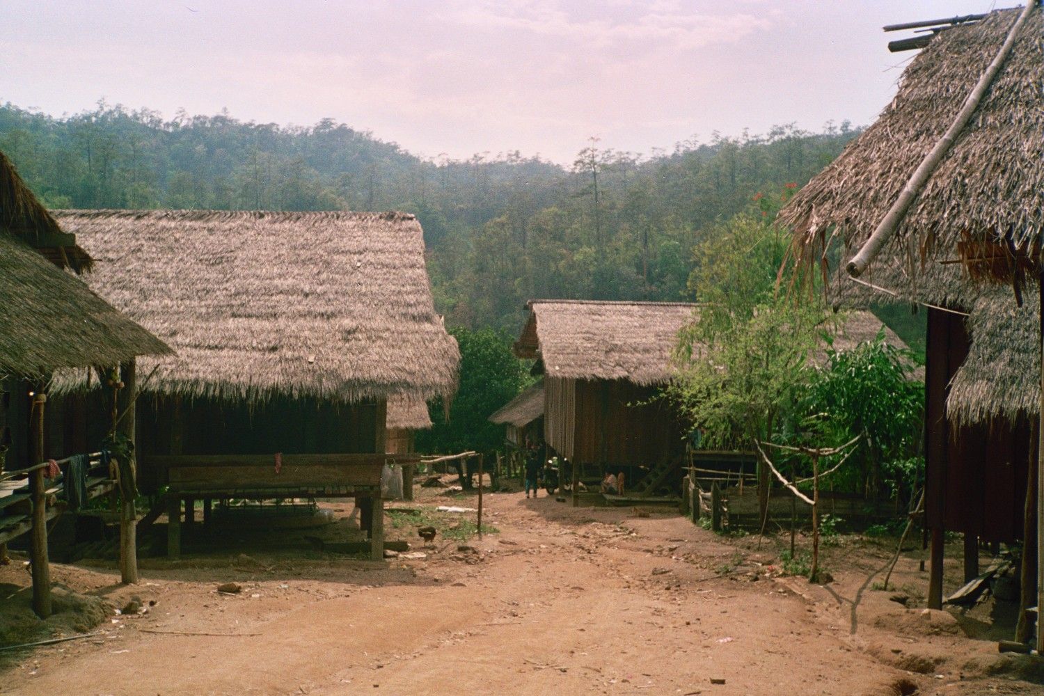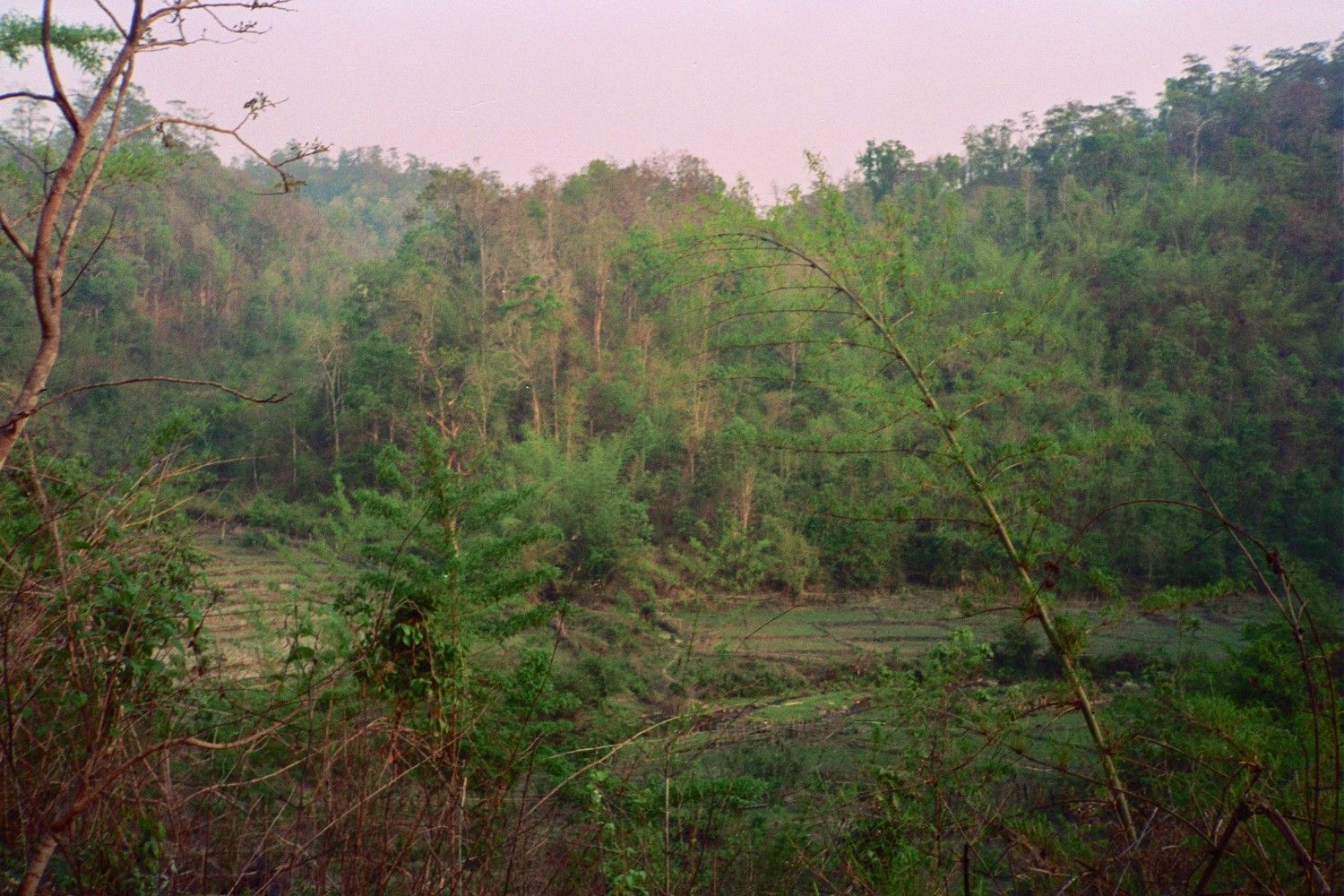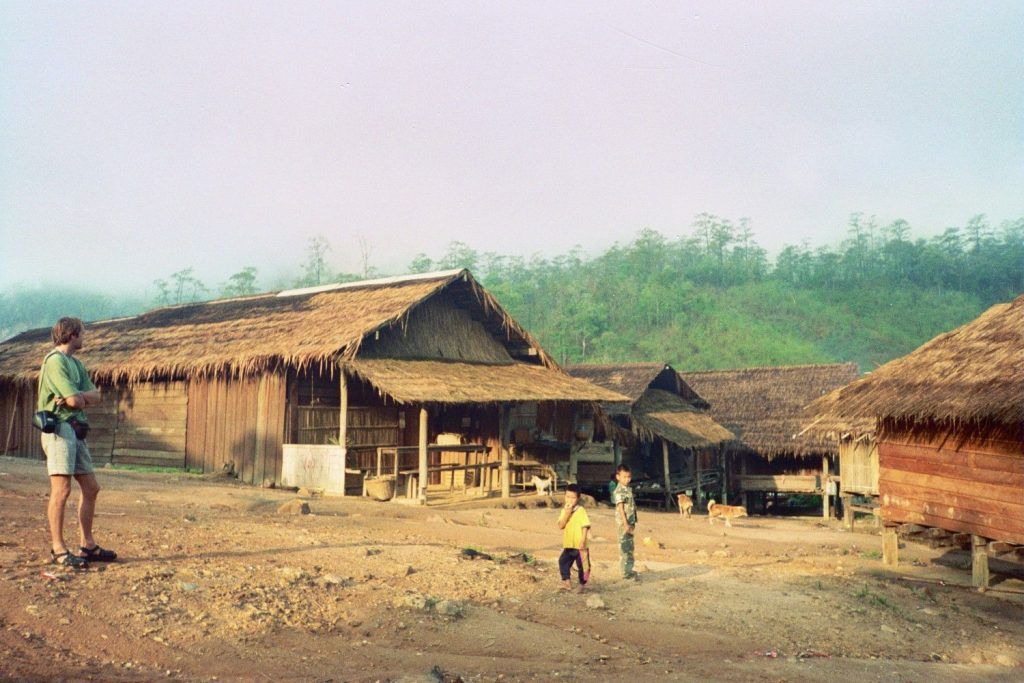4/13 – Arrived in Chang Mai to discover that Rose’s Guest House didn’t know about my four day trek. They scrambled to find someone else. We all got soaked from the New Year festivities leaving the city, as everyone along the road had squirt guns or water buckets, and had a long, wet ride. Found Rose’s only paid my guide for a 3 day trek. He promised to sort the thing out later. We ended up at a small village and walked all afternoon and early evening through beautiful scenery. Arrived at a village just at dusk. I bathed and washed my clothes in a pond in the dark. Had a rice and vegetables dinner and we all crashed early.