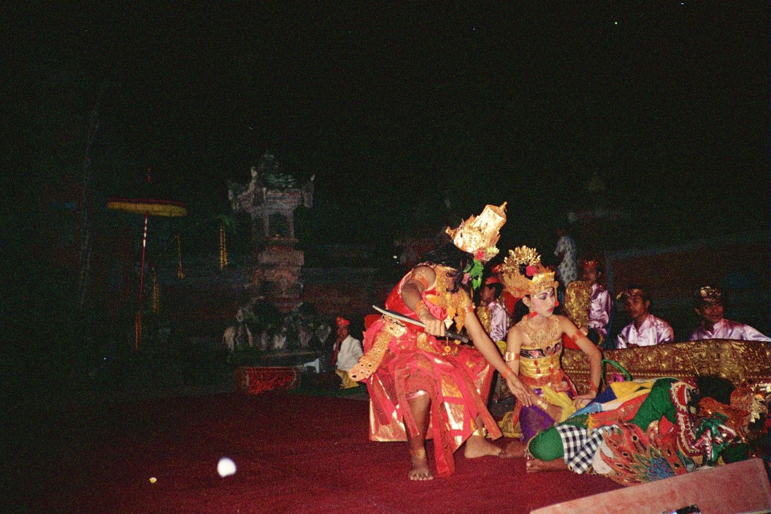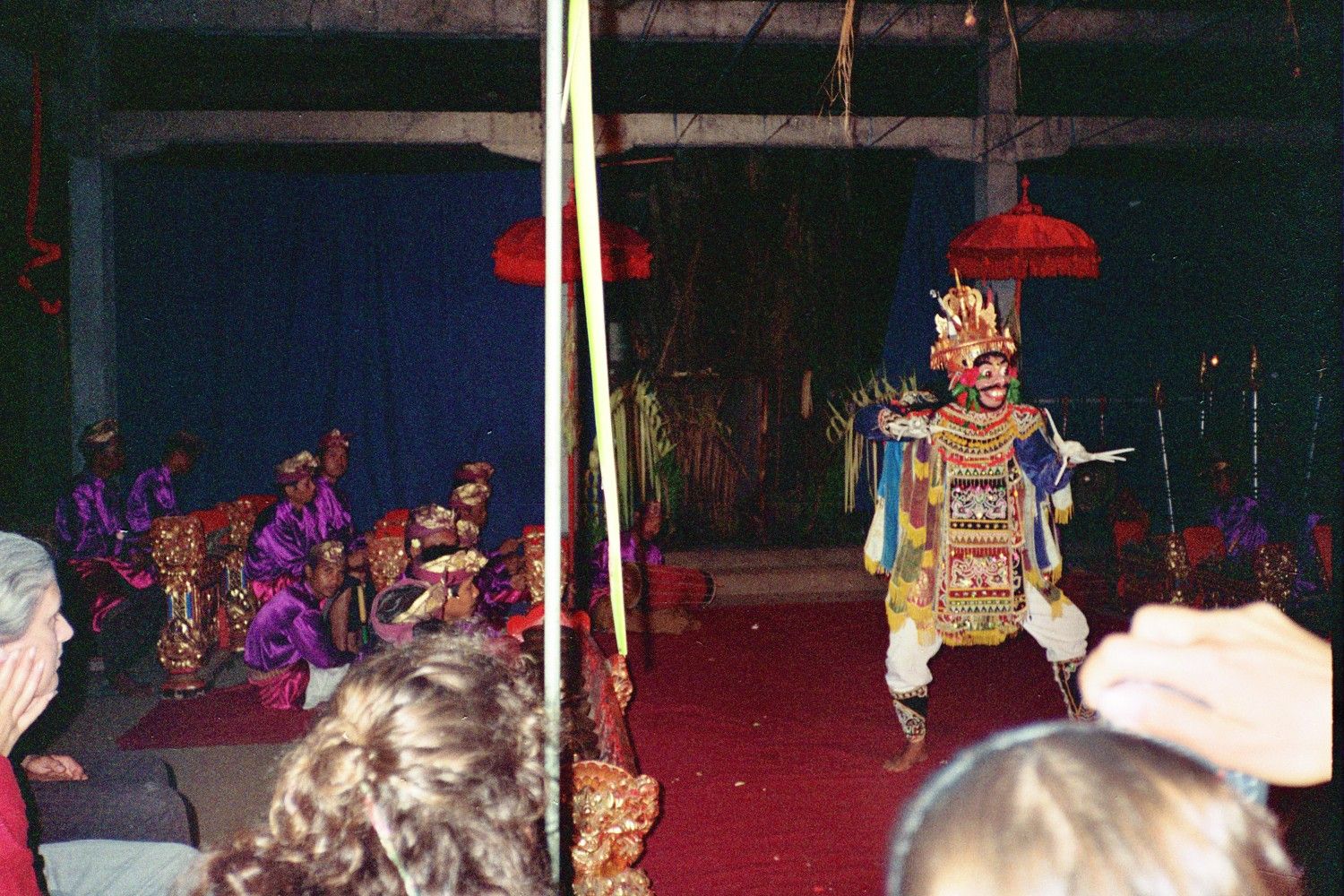 5/12 – Phoned home, then walked all over Ubud shopping. Bought a sarong for $2.50 (which I still have), a black hand painted long sleeved t-shirt for $8.50, 3 beautiful silk/cotton ties for $20 and a nice button down short sleeved shirt for $7.50. Had wonderful dinner of chicken with tomato and coconut sauce mixed with rice and avocado – gave myself a treat. Saw children’s dance troop’s version of the Ramayana – beautiful dancers, honorable prince and princess and frightful monsters and cute little monkeys.