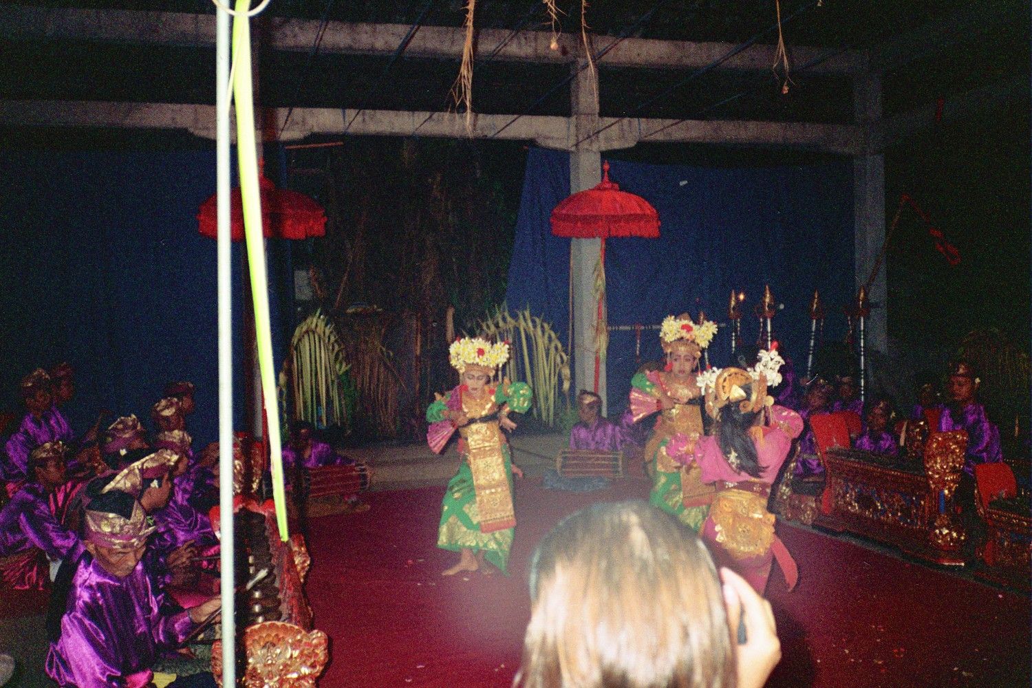5/10 – Woke up around 6:30am, had breakfast, packed and was on the road around 7:30am. Ran into Allison, Pete from New Zealand, Wayne from Oz and 2 Germans at a stop on the way to Ubud. We all shared a bemo to Ubud. Ended up at small, nice place, minus the Germans, with only 3 bungalows. Found great, cheap local restaurant and had lunch. We all split up and wondered around on various errands. A lot of shops and very touristy, but has a nice feel. Had dinner at same place and saw local Legong dance. Started out with four girls dancing with a basket of flowers on one hand. Music was all percussion with harmonious xylophone sound. Had a couple of more dances with male masked demons and one dance with two girls. It was all wonderful. I was very tired and crashed around 9:30.