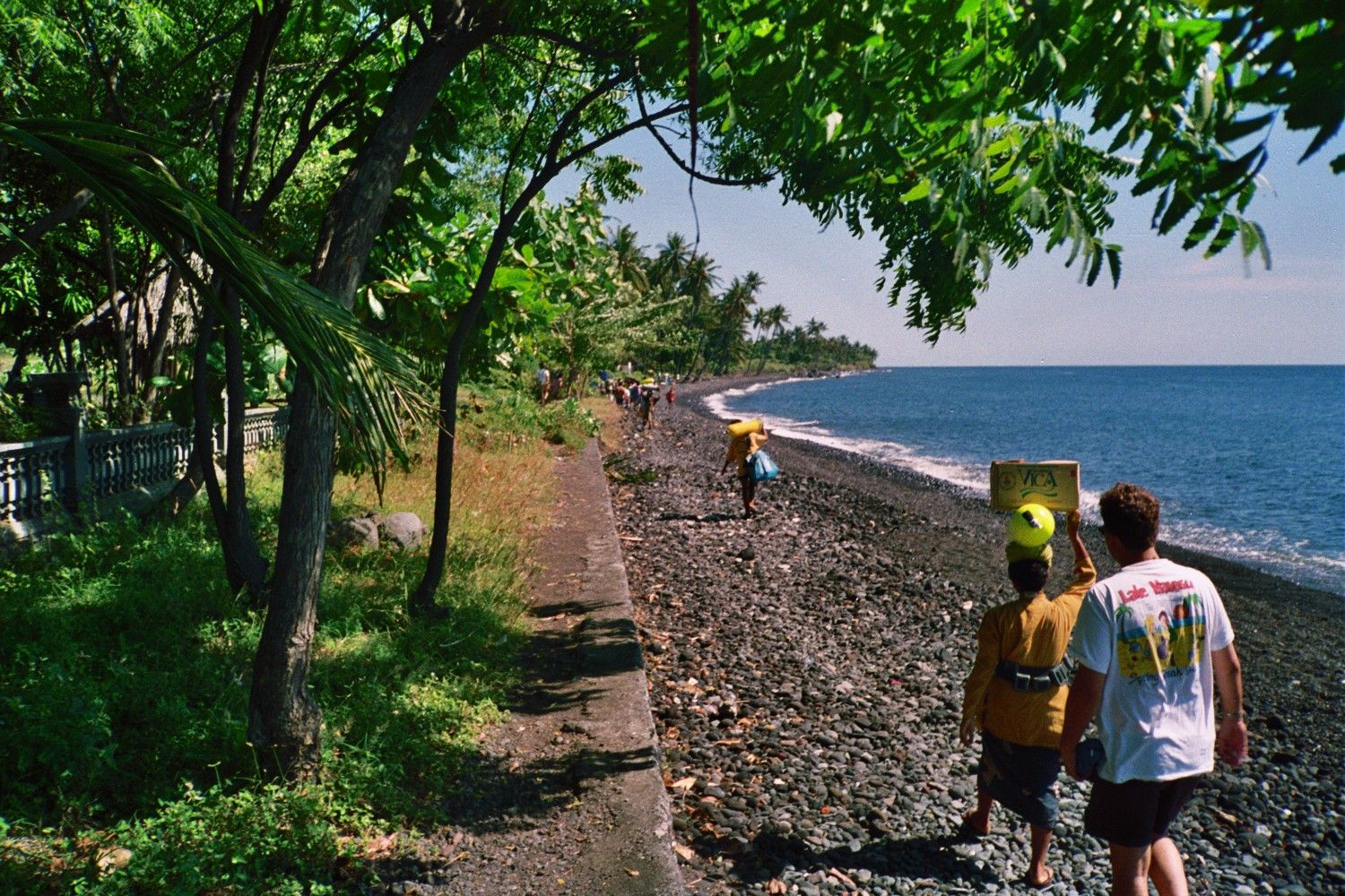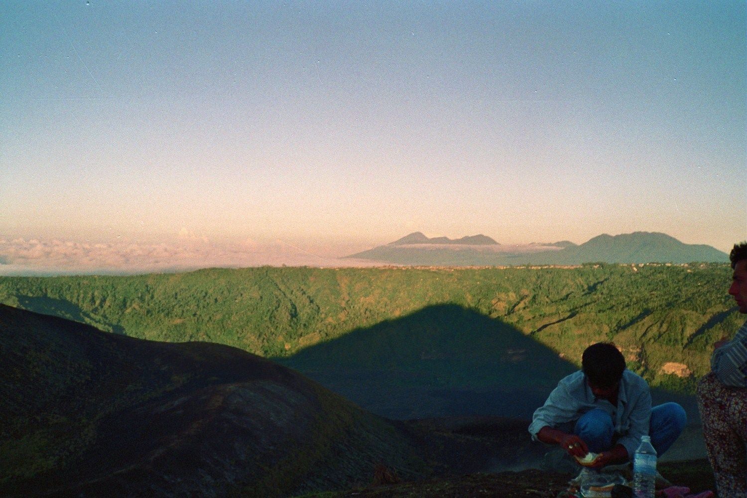 5/8 – Caught bus to Peneloken. Beautiful view of volcano, lake and large mountain within huge crater. Decided to walk down with full pack, it was that pretty. Met local working the fields. He recommended a place called Sutra which was about 6 km before Titra. I got there, liked it and checked in. Met British couple who went on volcano climb that morning; recommended it and a good guide through the guest house. Had lunch and talked with a German woman who spent a long time in India about her spiritual experiences there. Relaxed, slept and read all afternoon. Went to dinner with British couple at small family warang down the road. Ran into Allison from Australia afterwards. Had a beer with everyone and crashed early.