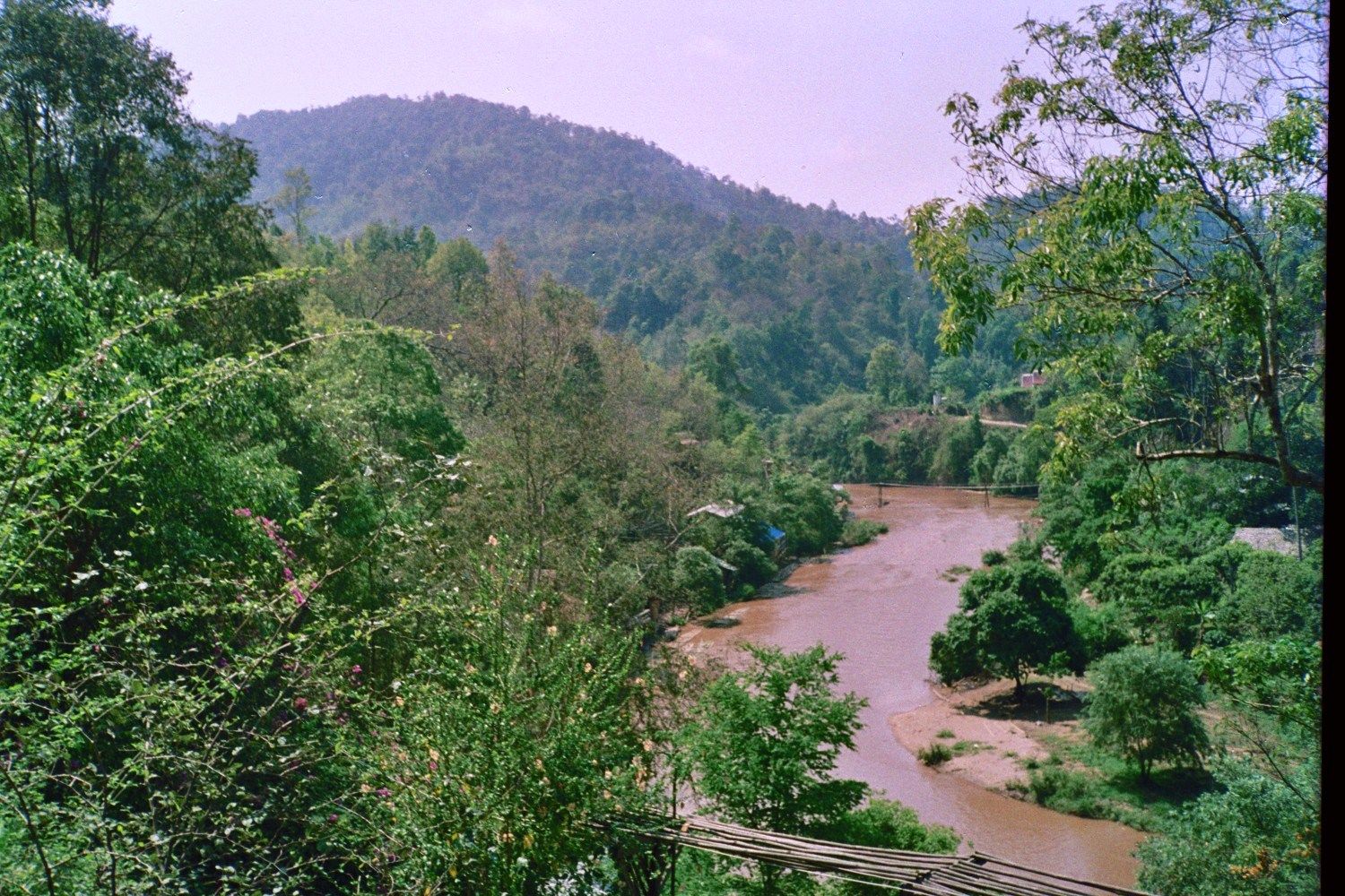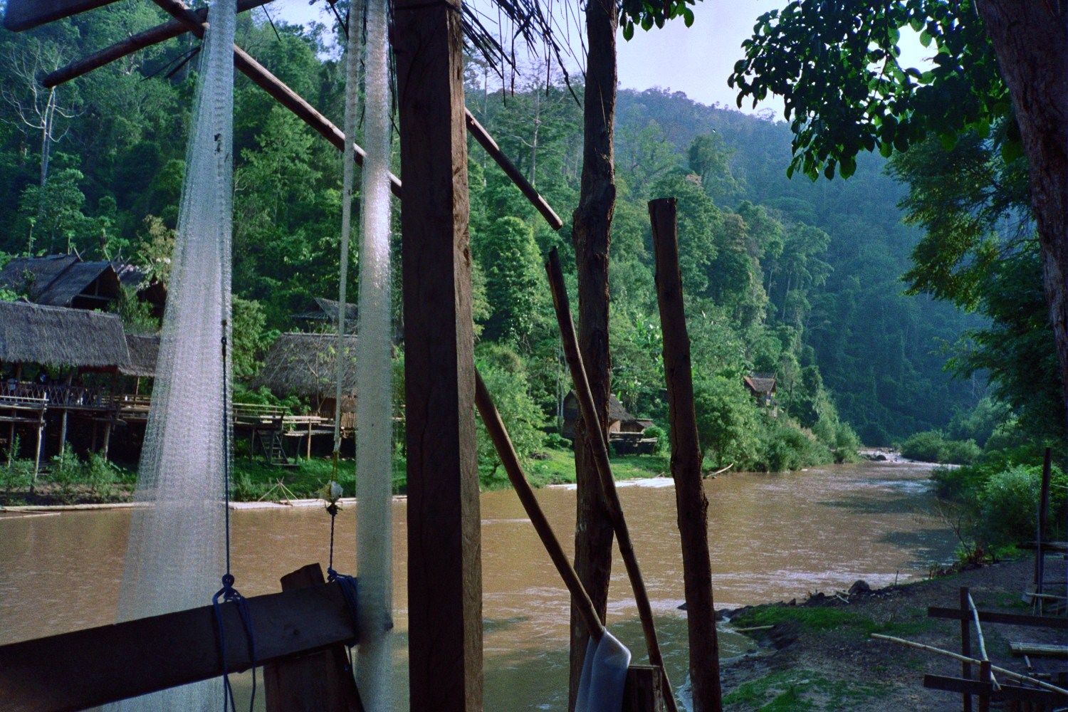 4/15 – Woke up after large rainstorm that night, which uncovered all the holes in the thatched roof. We had a two hour trek – accompanied by more children for part of the way – to a beautiful village on the river. After relaxing and swimming in the muddy river, Jack and I decided to stay a 4th day to solve my trek problem. I promised to meet the guide the next day and help him get his money from Rose’s guest house. He had told us that Akha was half Catholic – we saw the small wooden church on a hill above the village yesterday. They all had only come down from Burma about six years ago. We stayed at a place owned by a man nicknamed Spider. He had 2 wives in Chang Mai and one at the village. We took a nap, then took a 30 minute walk with Spider to his small fish farm. Stayed around and peacefully caught – and threw back – small fish. On the way back he couaght a spider – which looked like a tarantula – and took the fangs out and carried it back with him. We ended up roasting and eating it. It tasted like charred crabmeat. Had a nice dinner – made jokes with the family and had some horrible tasting moonshine.