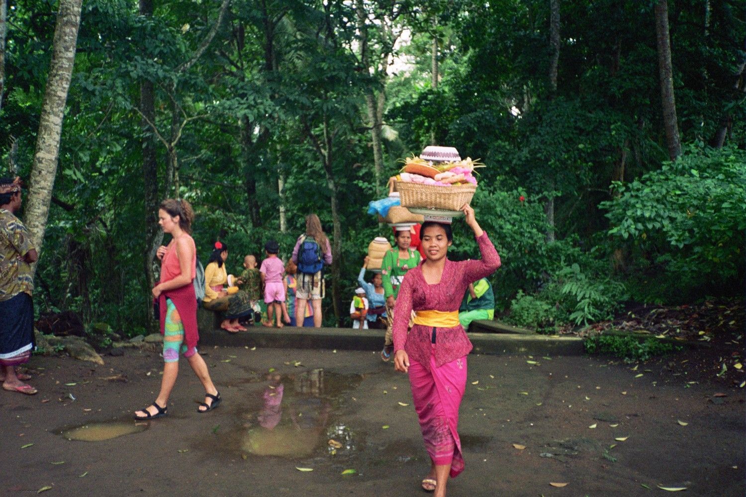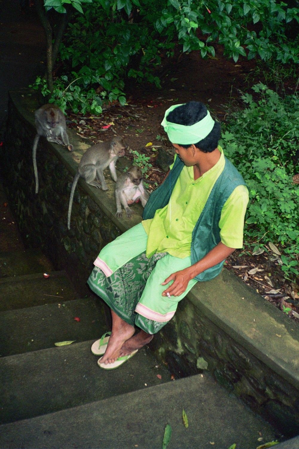 5/11 – Allison and I walked through the rain and tried to find Elephant Cave. Got lost once. Discovered my poncho worked well. When we finally found it, it was anticlimactic. One small cave, and a nice outdoor temple amongst some rice paddies. I got stuck in the mud walking down from one of the paddies – my sandals were useless and I had to go barefoot. Went to Monkey Forest on the way back to Ubud. Scores of wonderfully dressed women balancing baskets of fruits on their heads all converging on a nice temple in the forest. When we looked inside they were all sitting there with their offerings piled around them. The monkeys were very aggressive and were constantly snatching peanut bags from tourists – they were fun to watch. Ate dinner at same place. Saw Kekak and Trance dances. First dances had about 40 men chanting and “check-chacking” rhythmically on the ground while two girls and a couple of demons danced out a play. Wonderful, mesmerizing sounds. Second dance was the men with about 10 chanting women and two girls dancing in a trance with their eyes closed. Final dance was the fire dance – again with the men – and one man in a horse custom dancing through the hot embers of burnt coconut shells. They needed two men to stop his dancing at the end – he was in such a trance – and he laid there panting and recovering for a long time afterwards. Had a beer with Allison, then crashed.
