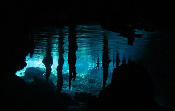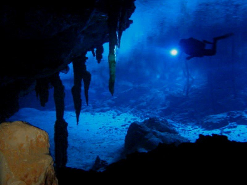 Once we entered the cenote it went from a bright round hole to a dark, gloomy cave. There was a line strung on the bottom and we followed it as we slowly moved forward. As we continued we could see blue halos of light to our sides and then ahead as the sunlight creeped through portions of the overhead limestone. There were beautiful and exotic stalactite and stalagmite formations all around us, above us and below us. As the west eye got closer we could see more beams of sunlight sparkling in the water ahead of us.