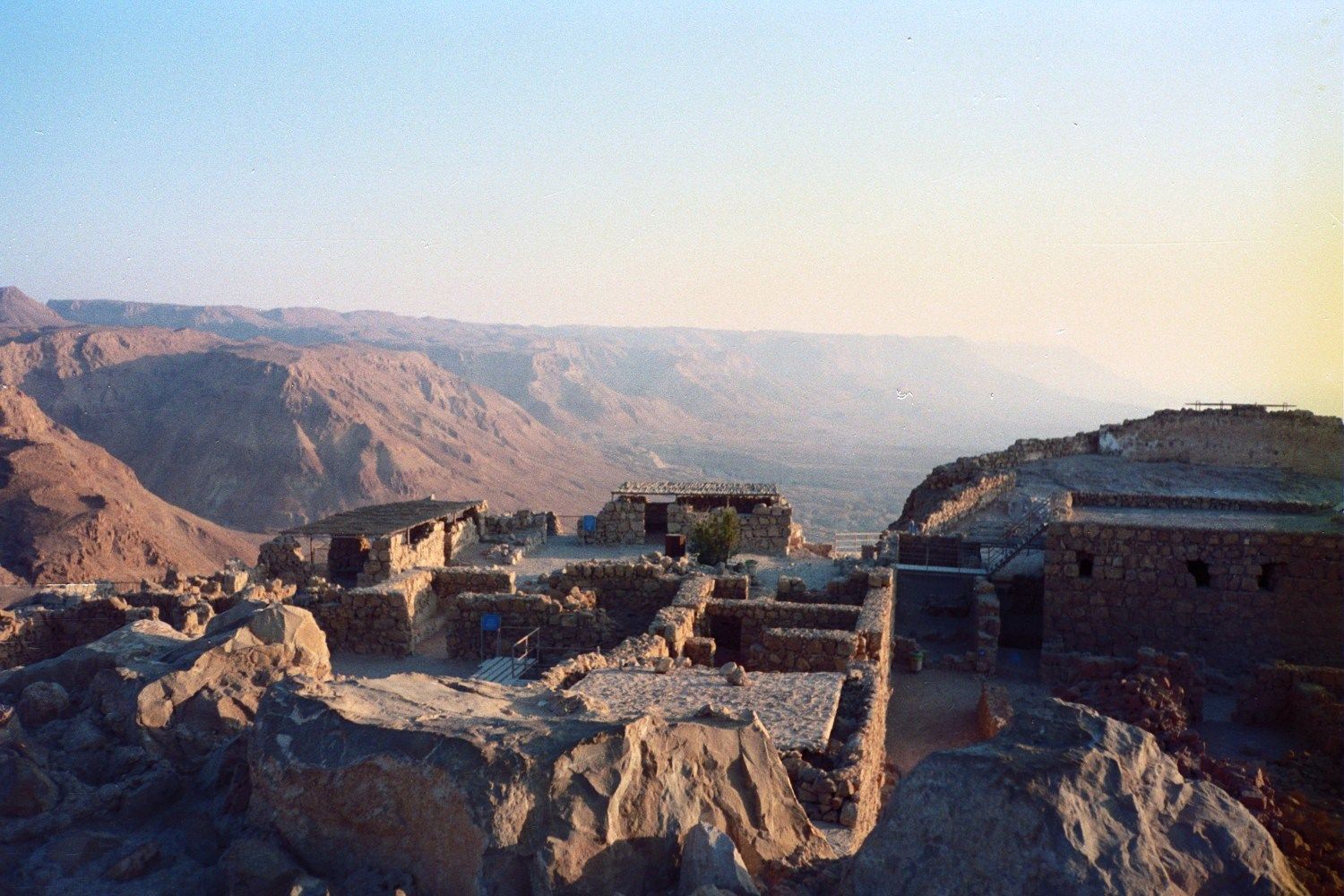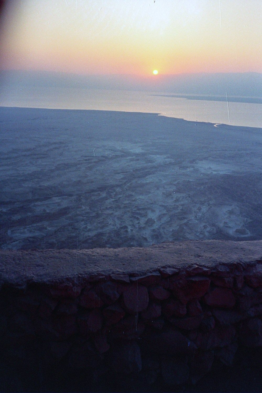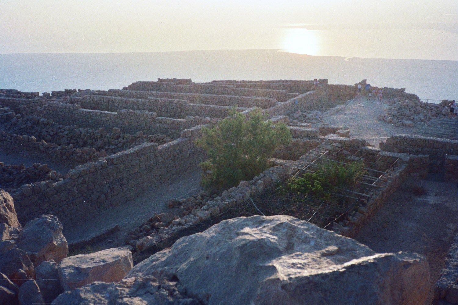 I took a bus directly to Mesada the next day. I got there in the early afternoon and the hostel was closed so I just hung around, ate in the air-conditioned cafeteria and read. I ended up going to bed early that night because a bunch of us woke up at 4:00am to climb Mesada. After stumbling around in the dark (our flashlights were marginally effective) we actually found the right path and started up the trail around 5:30. A bunch of tour buses arrived from Jerusalem around that time and I ended up passing 40 or 50 people on my way up. I made the climb in around 30 minutes and was exhausted when I hit the top. The view was breathtaking. Light was streaming in from Jordan and the Dead Sea towards the east and about 20 minutes after I was on top the sun actually popped up. I could see the squares of the old Roman camps below me. The fortress itself was amazing – both in the way the Romans created it and in the resoluteness of the Jews who defended it.