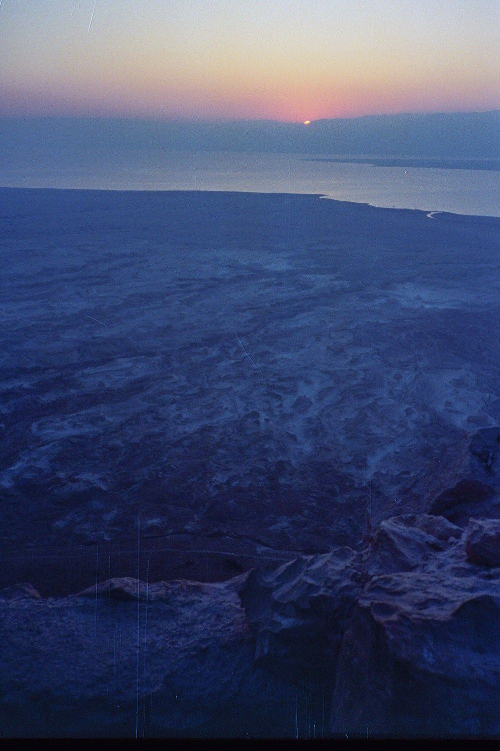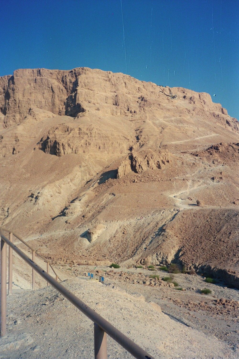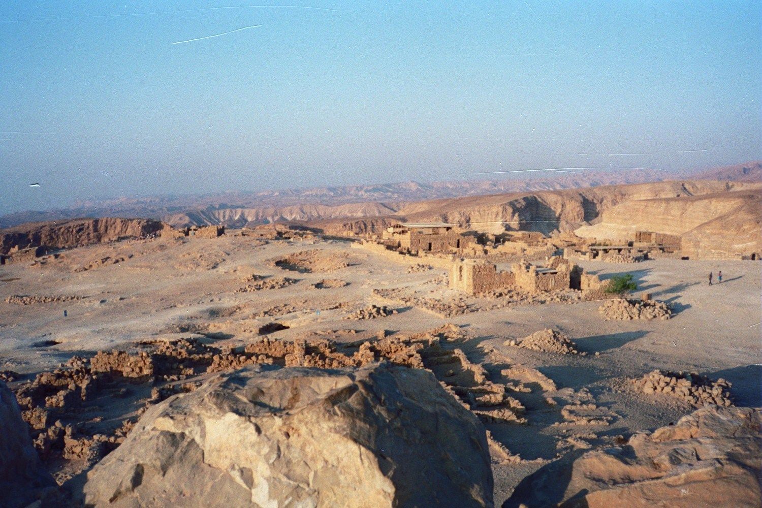 I took a bus directly to Mesada the next day. I got there in the early afternoon and the hostel was closed so I just hung around, ate in the air-conditioned cafeteria and read. I ended up going to bed early that night because a bunch of us woke up at 4:00am to climb Mesada. After stumbling around in the dark (our flashlights were marginally effective) we actually found the right path and started up the trail around 5:30. A bunch of tour buses arrived from Jerusalem around that time and I ended up passing 40 or 50 people on my way up. I made the climb in around 30 minutes and was exhausted when I hit the top. The view was breathtaking. Light was streaming in from Jordan and the Dead Sea towards the east and about 20 minutes after I was on top the sun actually popped up. I could see the squares of the old Roman camps below me. The fortress itself was amazing – both in the way the Romans created it and in the resoluteness of the Jews who defended it.