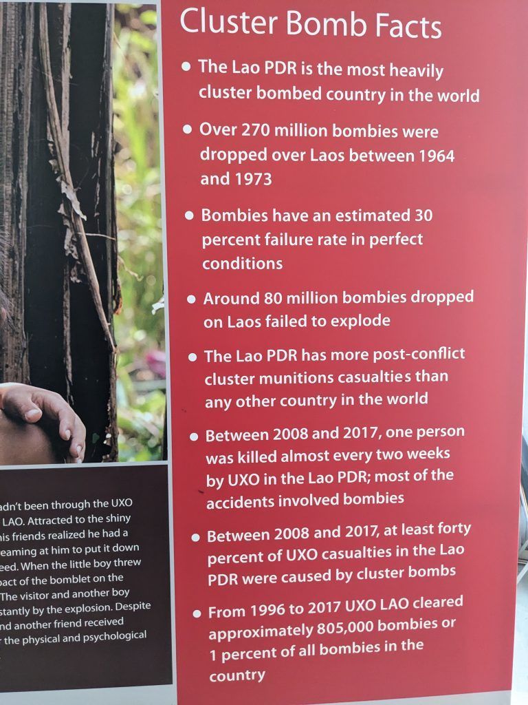 UXOLAO is the organization the oversees the removal of all these ordinances. Almost 50 years after the bombing stopped there are still dozens of accidents each year from these unexploded bombs. More importantly, the economy in Laos is still stunted because of the fear of expanding agriculture in areas of the country that have still not been meticulously cleared.
