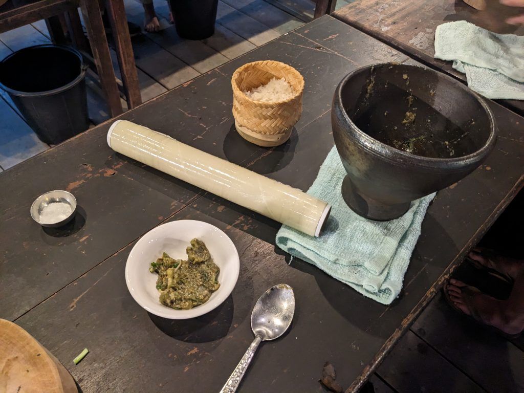 We got to make jeow mak keua which is an eggplant dip with chilis, salt, garlic, fish sauce, coriander and a spring onion.