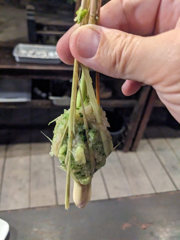 This is oua si khai, or stuffed lemongrass. We made a sauce of garlic, onions, coriander, lime leaf and salt and mixed it in with some chicken. Then we cut a stalk of lemongrass to make a basket and stick the chicken into it. Finally they were cooked in oil below.
