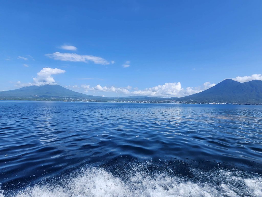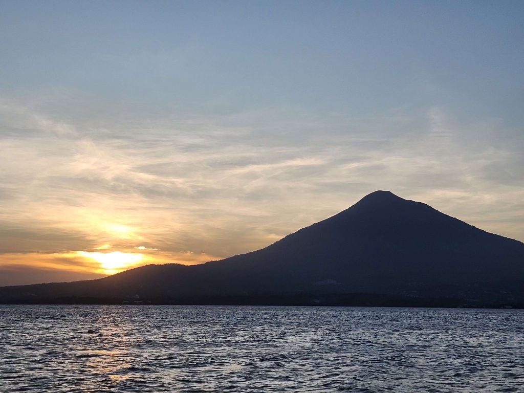 The sun setting behind another volcano as we sailed to one of our night dives.