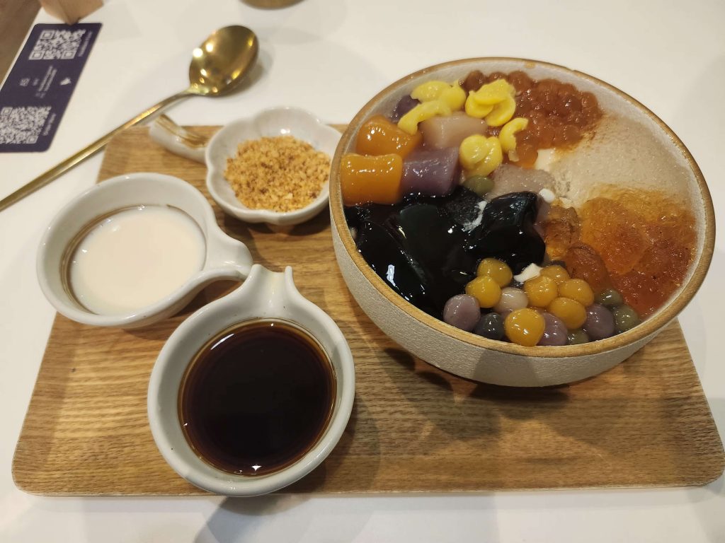 A Taiwanese four beans dessert including butter beans, chick peas, red kidney beans and baby lima beans with peanuts, cream and a molasses type of sauce to pour into it. It had a nice taste, but there are better dessert options for all these carbs and sugars (like Korean roasted marshmellow ice cream on a stick 🙂 )