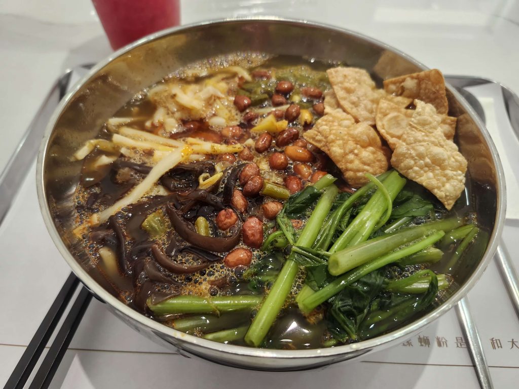 A fascinating dish of luosifen, or Chinese snail noodles. These are a famous, pungent, and highly savory dish featuring rice noodles in a rich broth made from river snails and pork bones, topped with fermented bamboo shoots, fried tofu skin, peanuts, and chili oil. Yes, that’s right, river snail broth. It really had a wonderful, unique taste.