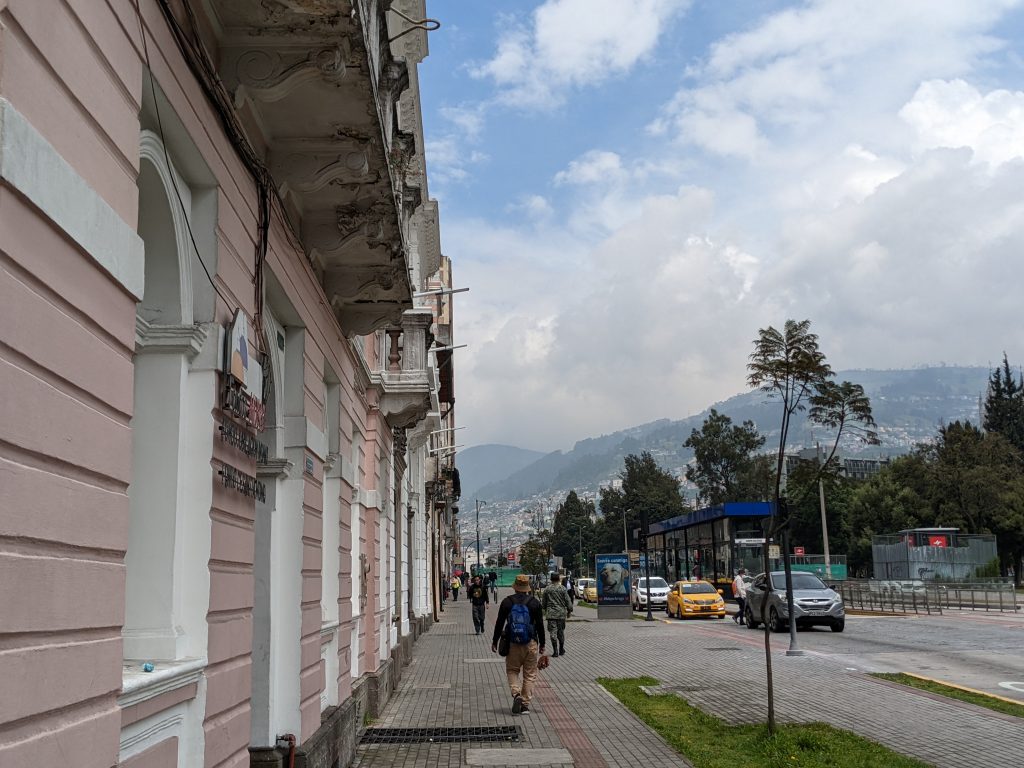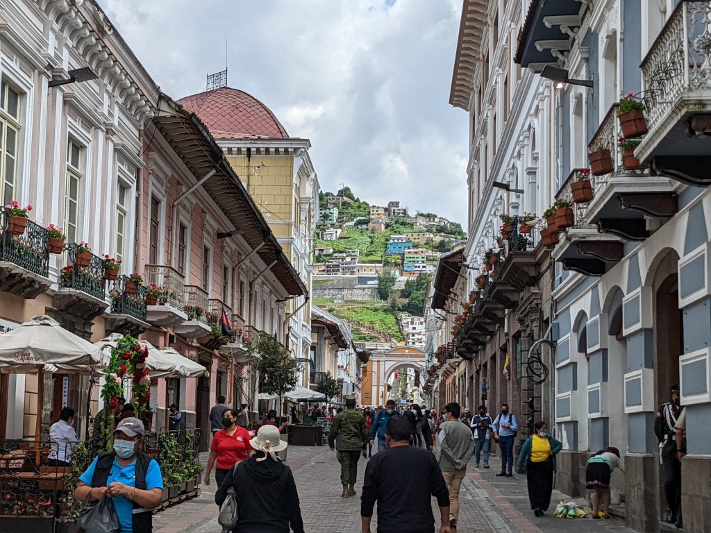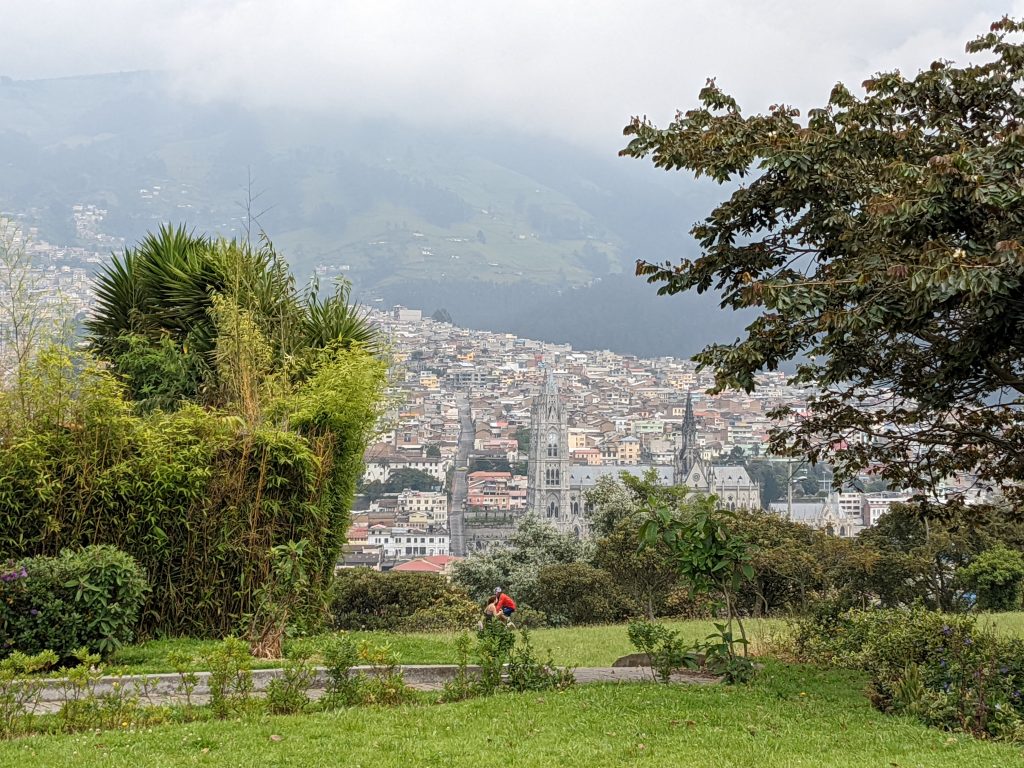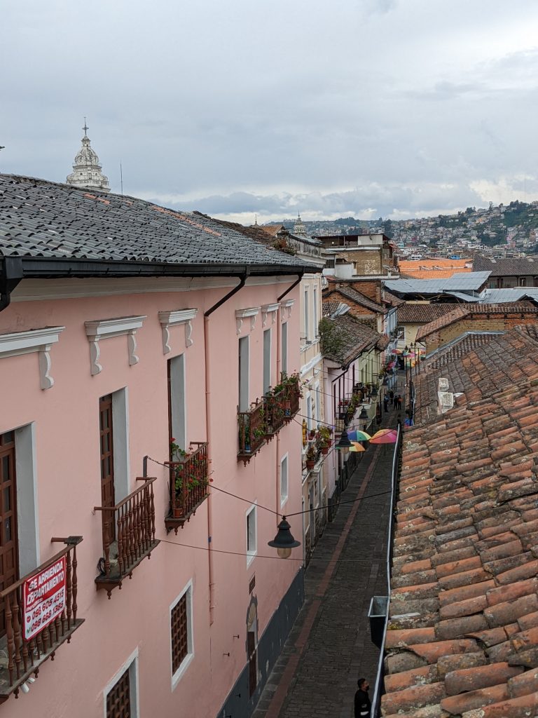 Quito is set into the palm of the northern Andes. It’s in a long valley surrounded by beautiful, tall mountains and one still somewhat active volcano. At 2,850 meters (9,350 feet) Quito is the second highest national capital in the world (after La Paz in Bolivia). It is also right on the equator. So the days generally have a spring-like quality, but the weather can also change very quickly. It can be sunny and warm in the morning and cold and drizzly by the late afternoon.