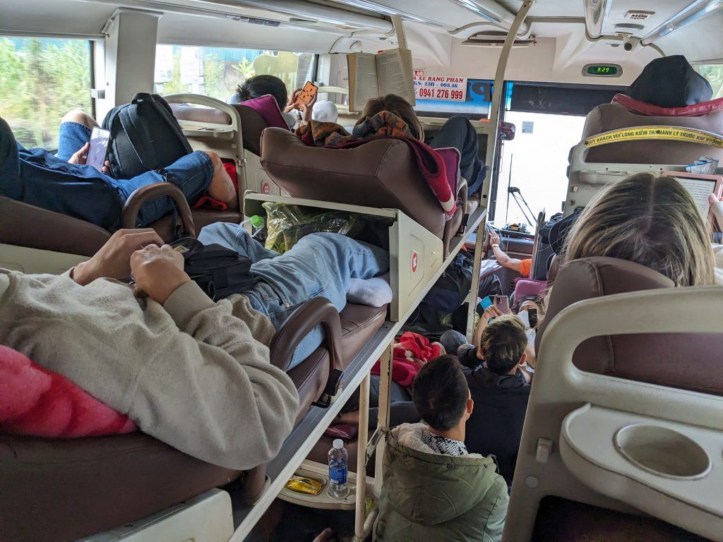 The buses to and from Hanoi I took the day before and day after the tour were unique. There were three rows of almost completely horizontal bunk seats with both Western and Vietnamese passengers. Local Vietnamese passengers sat on the floor between the seats. These rides were about 8 hours long and the seats were configured this way because many people took these as overnight buses. It was incredibly crowded, but relatively comfortable.