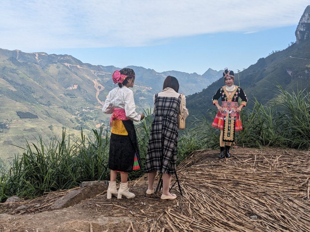 Some local women in costume posing above the river.