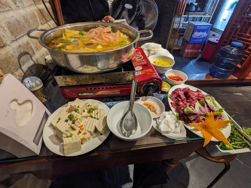 Our steampot dinner in Hong Van filled with beef, pork, chicken, tofu, noodles and all kinds of vegetables.