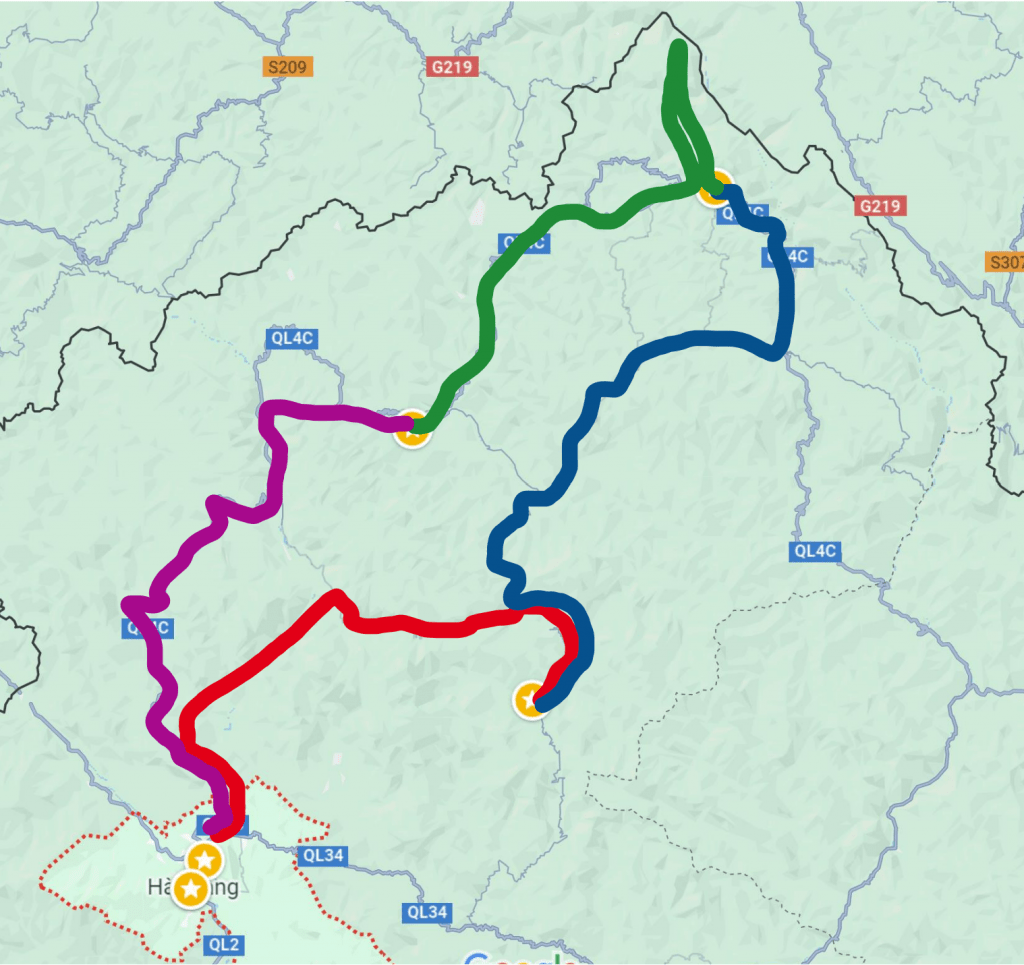 I highlighted the route below over the four days: from Ha Giang to Du Gia in red on day 1, from Du Gia to Dong Van in blue on day 2, from Dong Van to Ha Ahn on day 3 in green and then from Ha Ahn back to Ha Giang on day 4 in purple. The day 3 squiggle north was up to Lung Cu where you could see across to the China border.