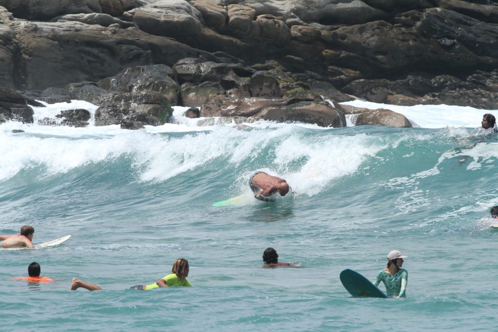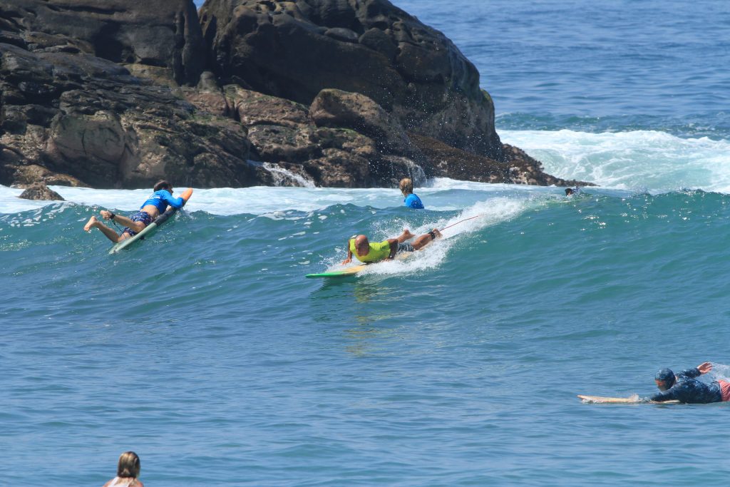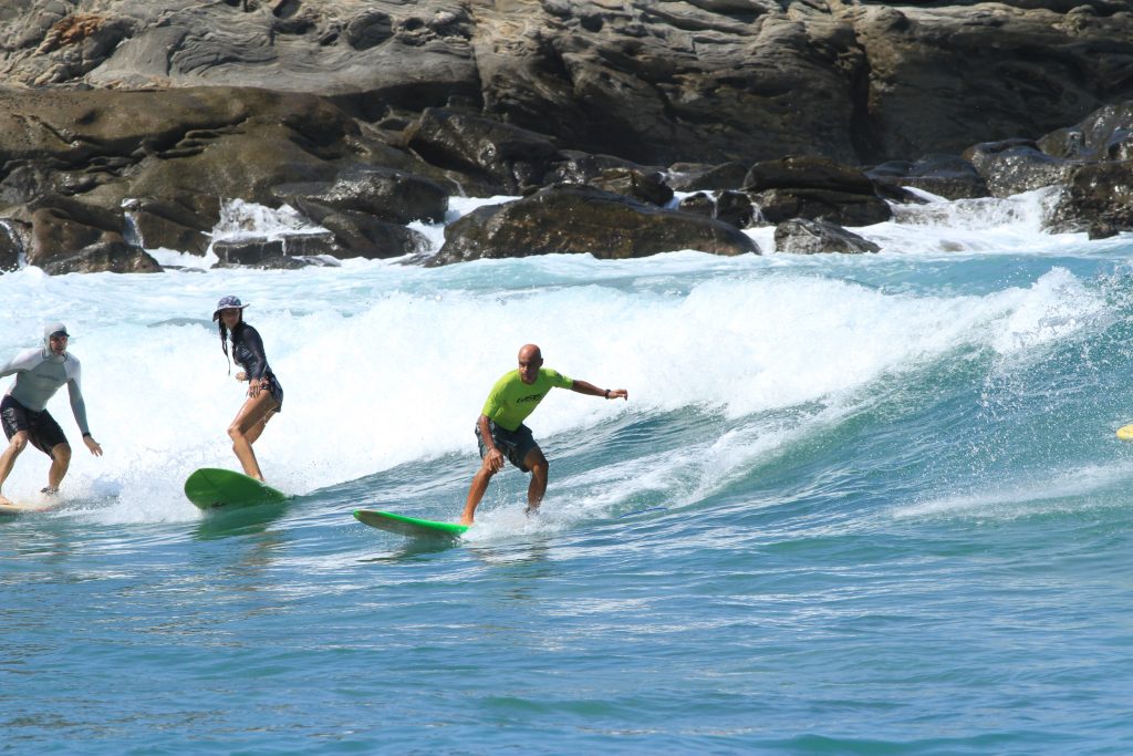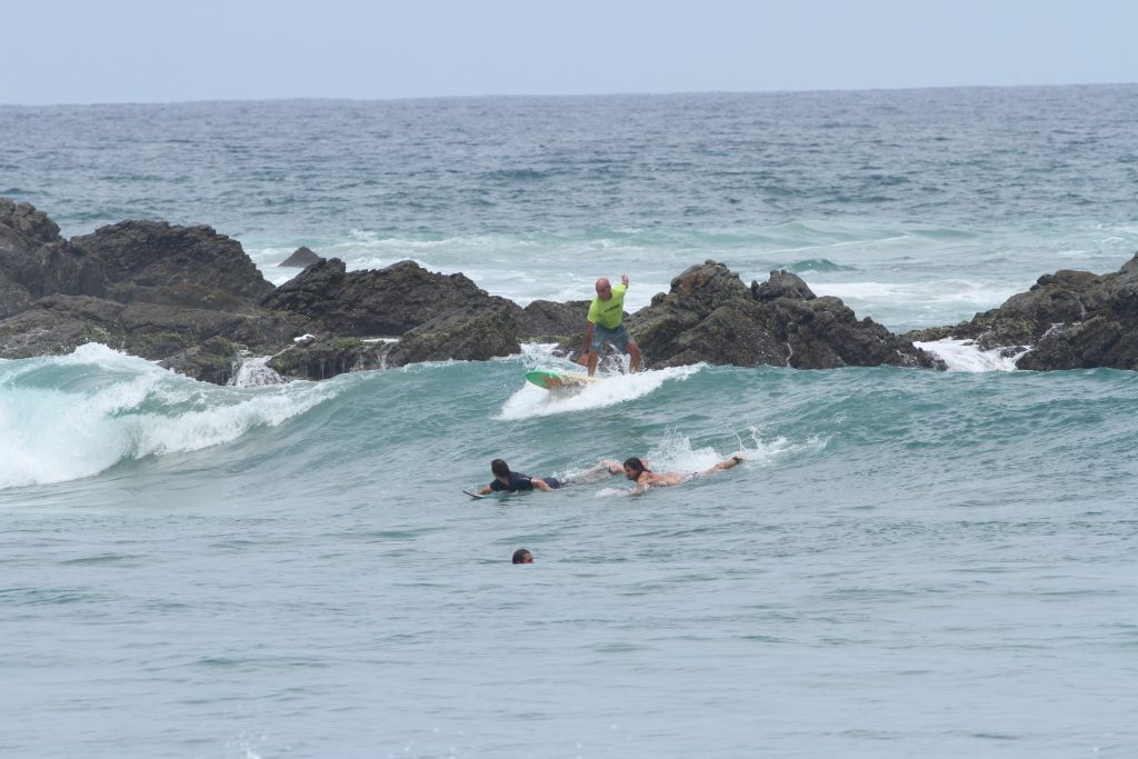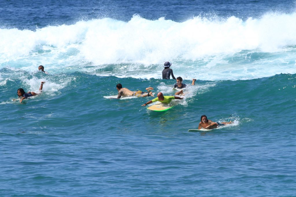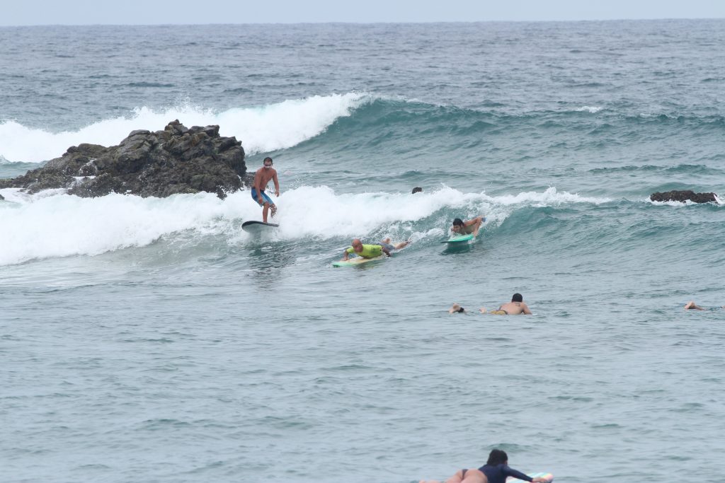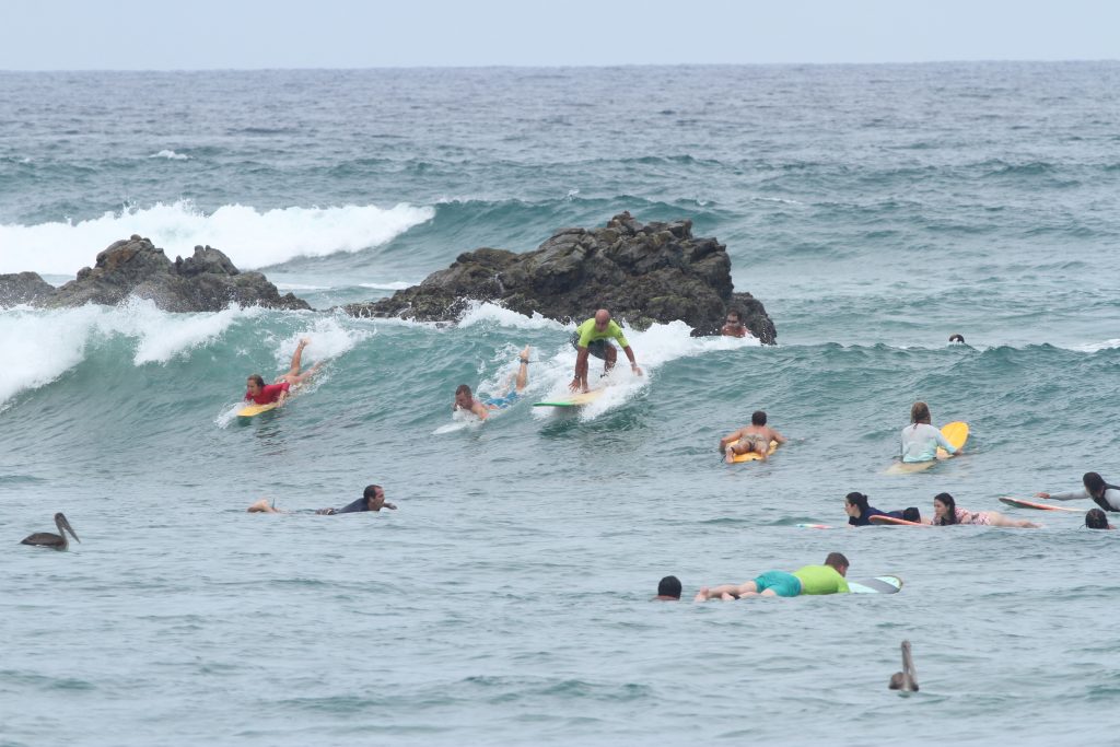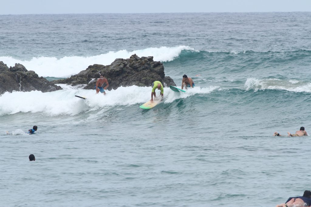 Nice catch on my own, but not the best ride!My instructor is outside of me. He wanted us to catch it both together. But when I saw the shape over my right shoulder I didn’t know it was him and I bailed thinking I cut someone off. Oh well, it would have been a nice ride together.Technically I cut off the girl in the red, but I didn’t see her catch the wave before I popped up. And technically the guy in the black cut me off. But we all seemed to get the most out of this party wave.I was a bit too far outside on this and needed to paddle harder, and pop up later.
