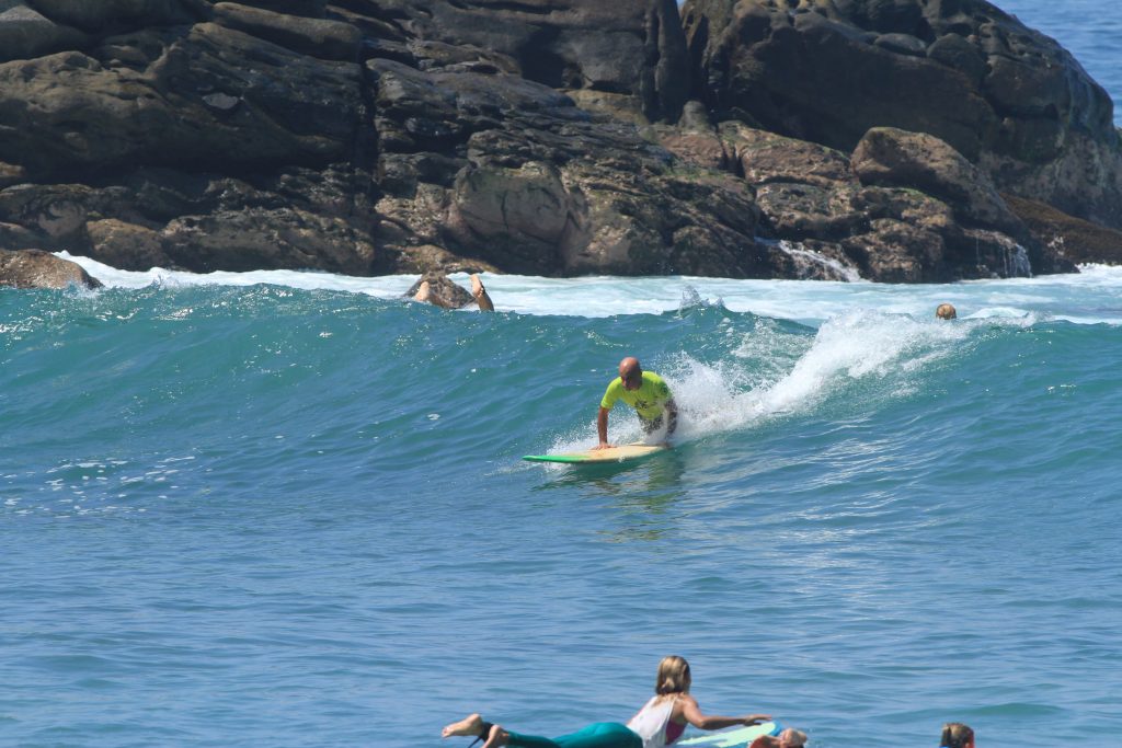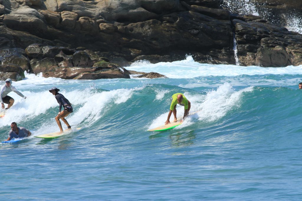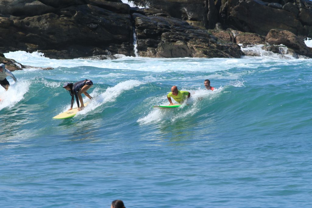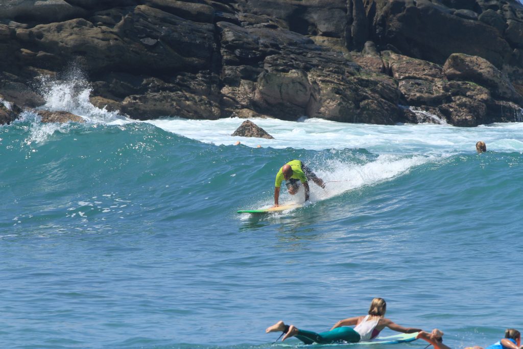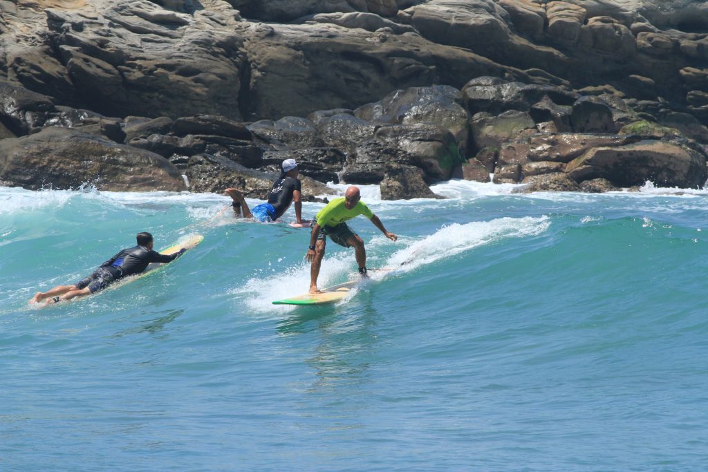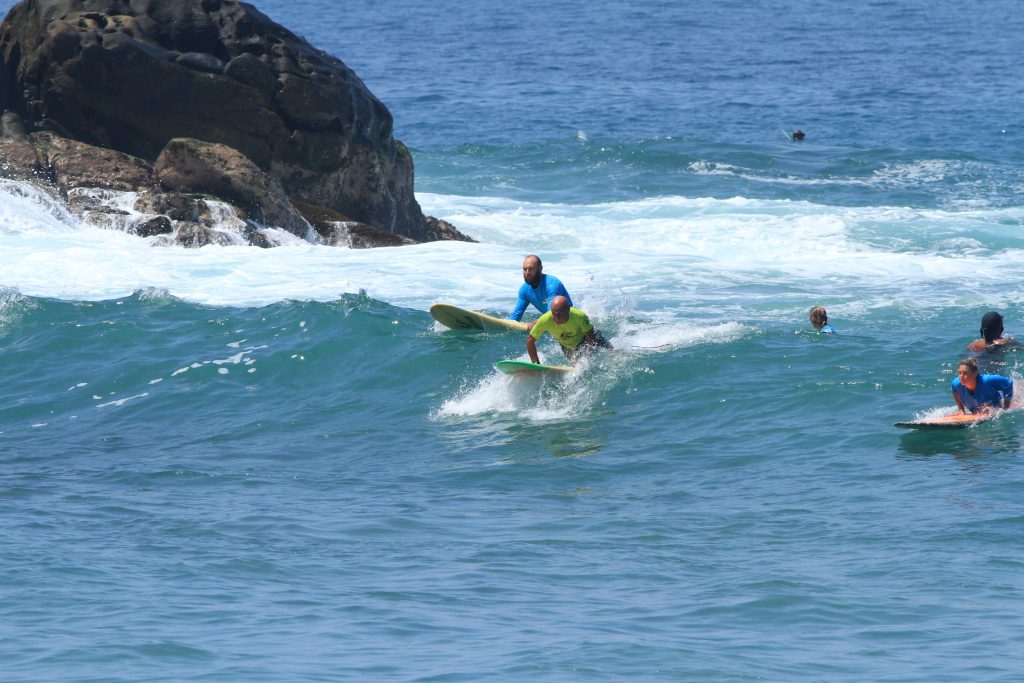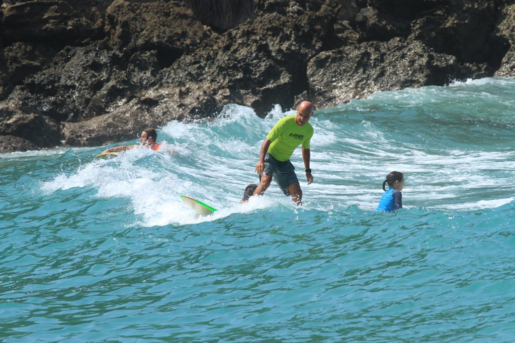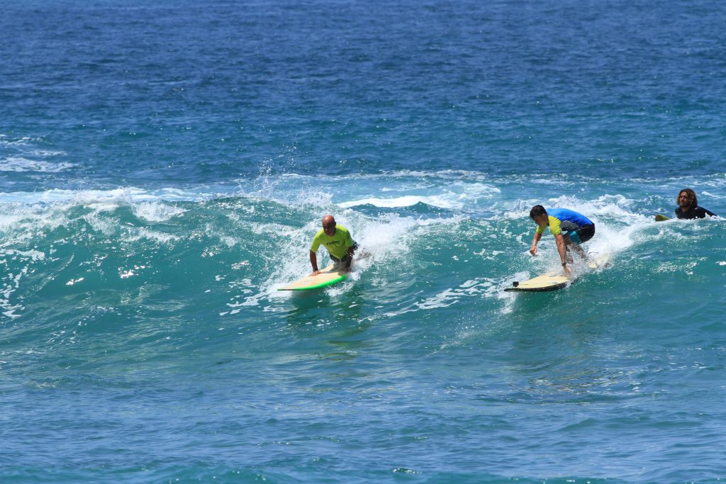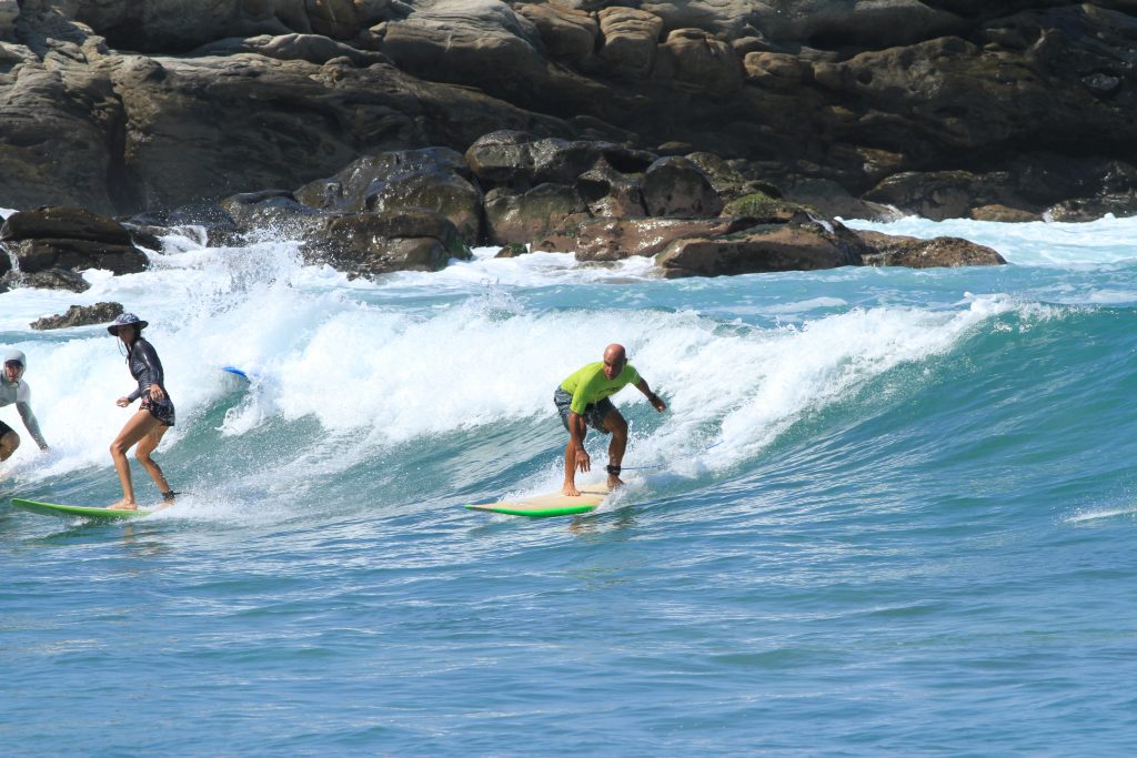 Nice catch on my own, but not the best ride!My instructor is outside of me. He wanted us to catch it both together. But when I saw the shape over my right shoulder I didn’t know it was him and I bailed thinking I cut someone off. Oh well, it would have been a nice ride together.Technically I cut off the girl in the red, but I didn’t see her catch the wave before I popped up. And technically the guy in the black cut me off. But we all seemed to get the most out of this party wave.I was a bit too far outside on this and needed to paddle harder, and pop up later.