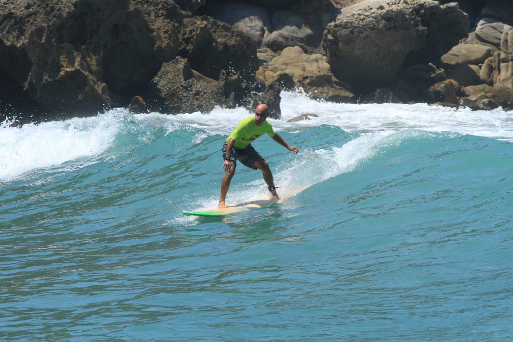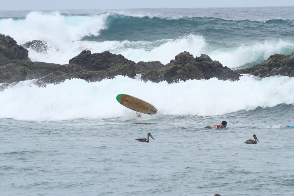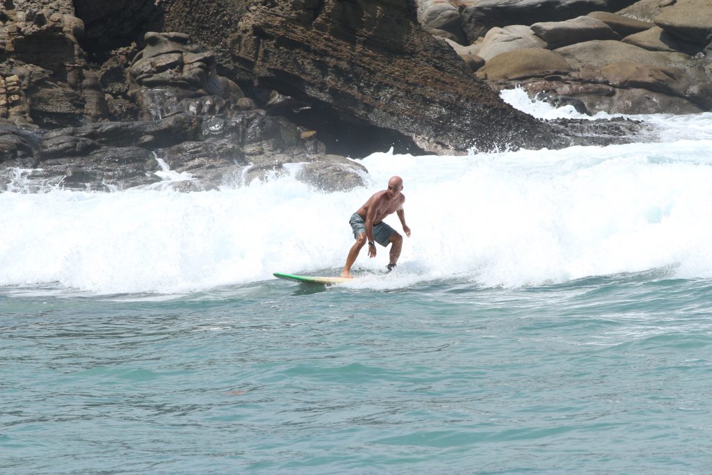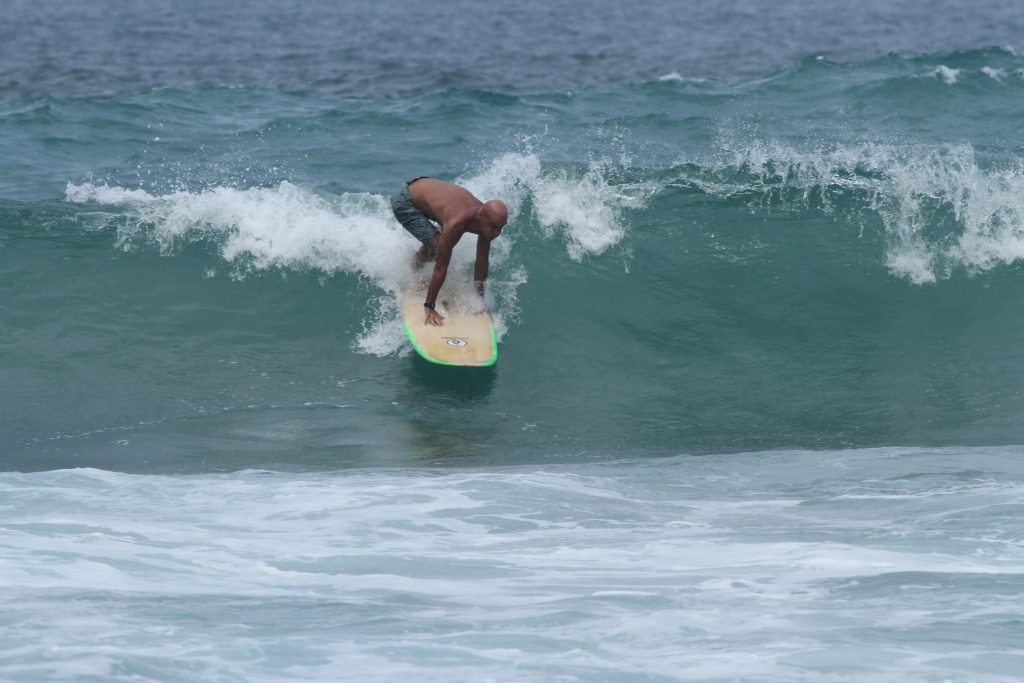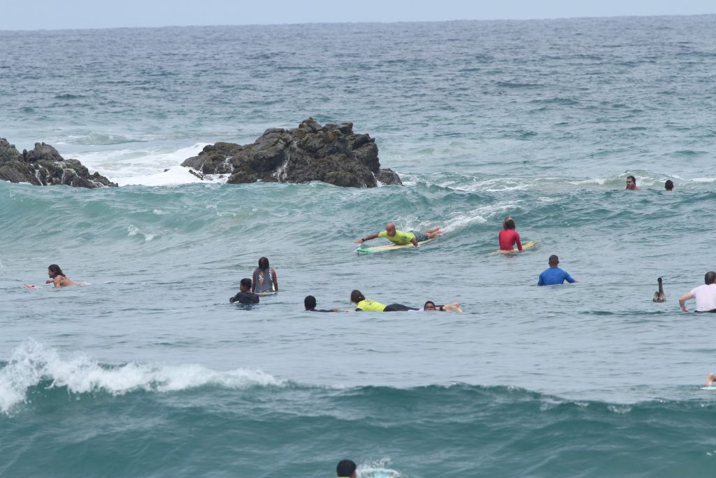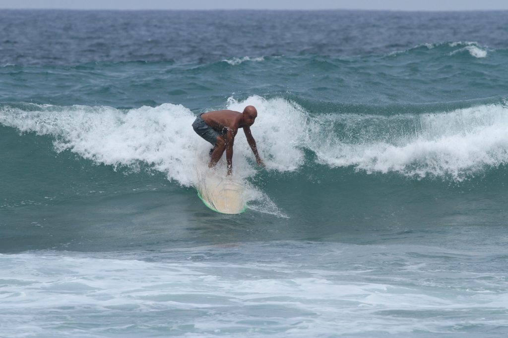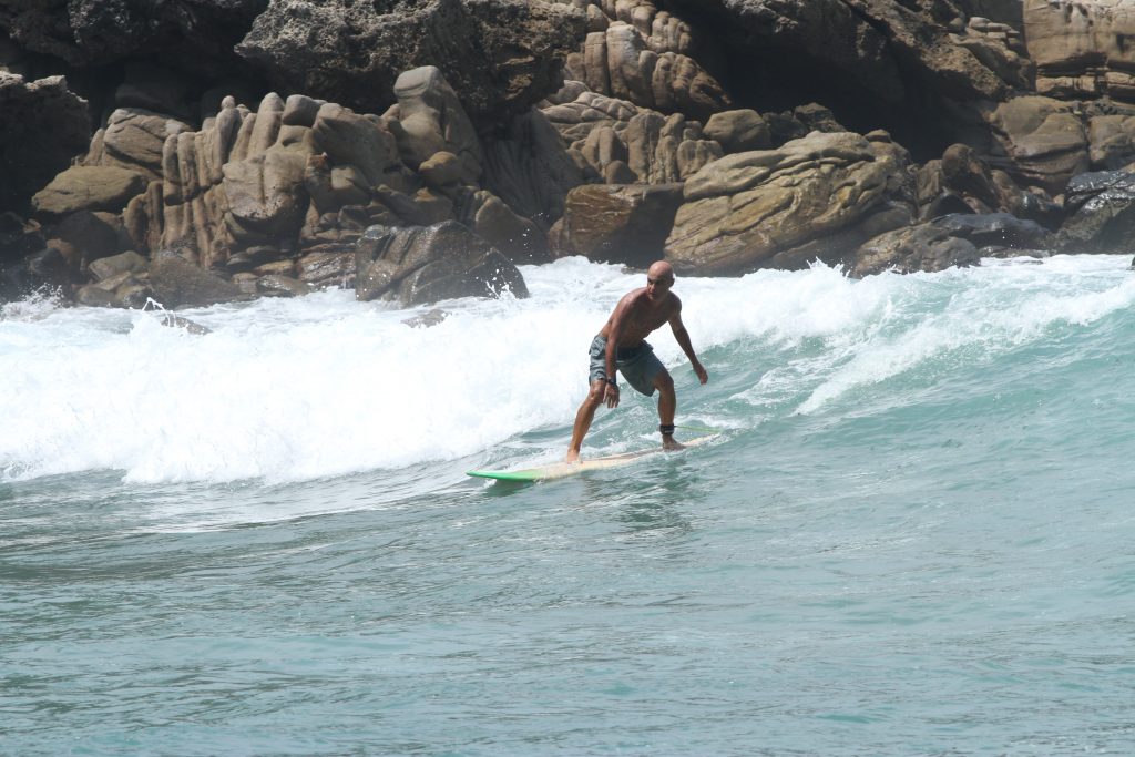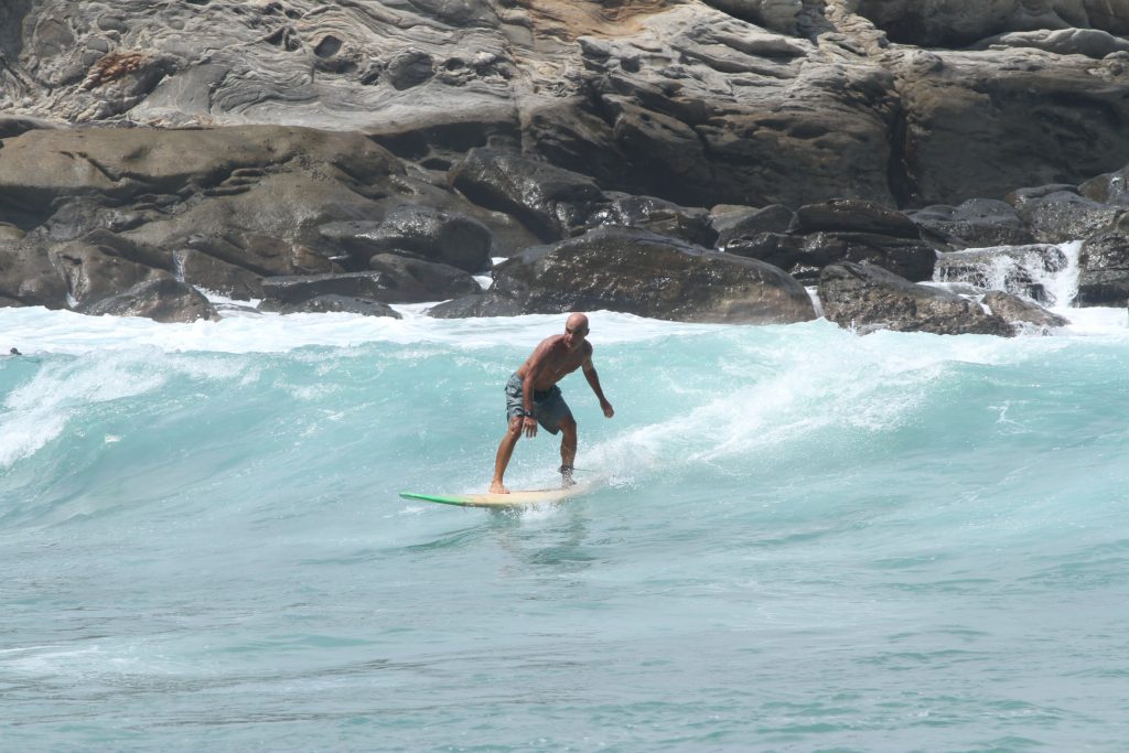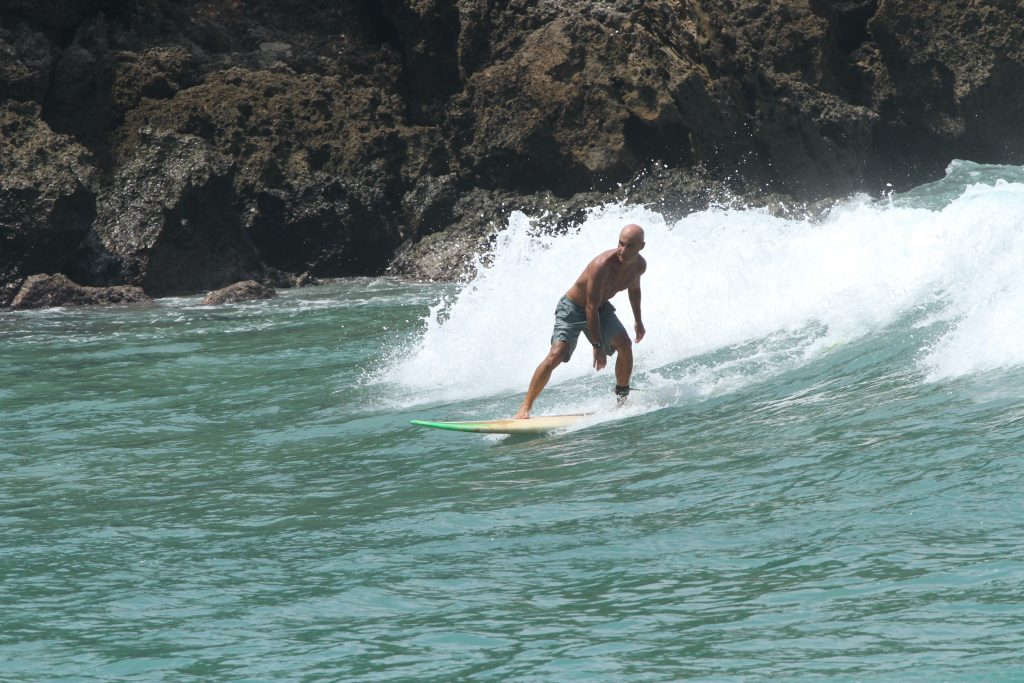 The beach itself. You can see part of the stairs leading down to the beach in the middle right of the picture. There are 168 steps. We get to carry our boards down there every day and then back up again after we’ve surfed for a couple of hours…not the funnest thing in the world 🙂A set coming into the beach. One of the guys I surfed with for a couple of days had an Apple Watch on. It could record the distances he surfed. Some of the waves we were catching went on for over 240 feet, which is more than 70 meters. Nice!You can see partial view of where we catch the waves here on the far left and a broader view of the potential ride into the beach each time if the wave is right and we catch it correctly.