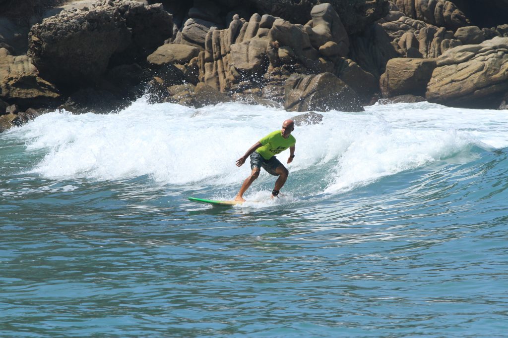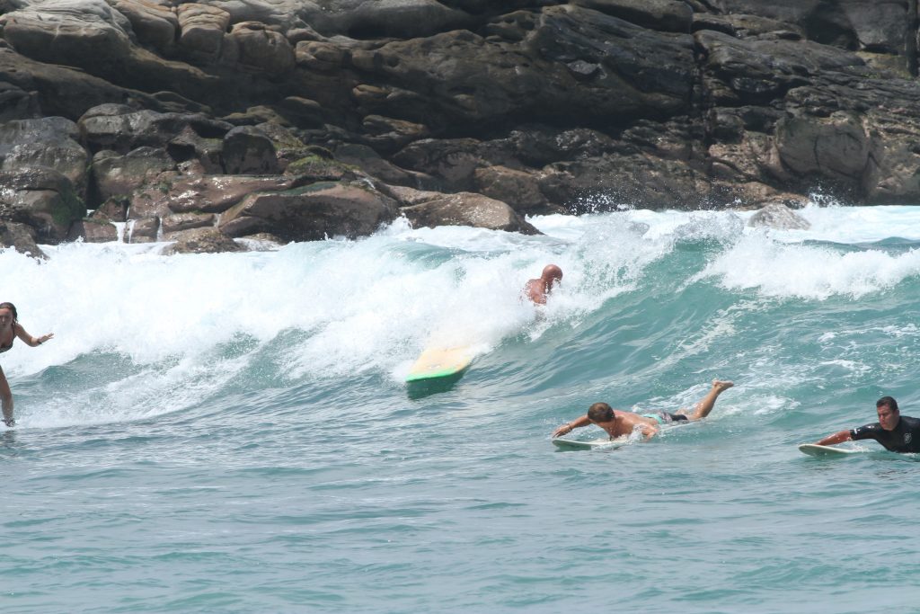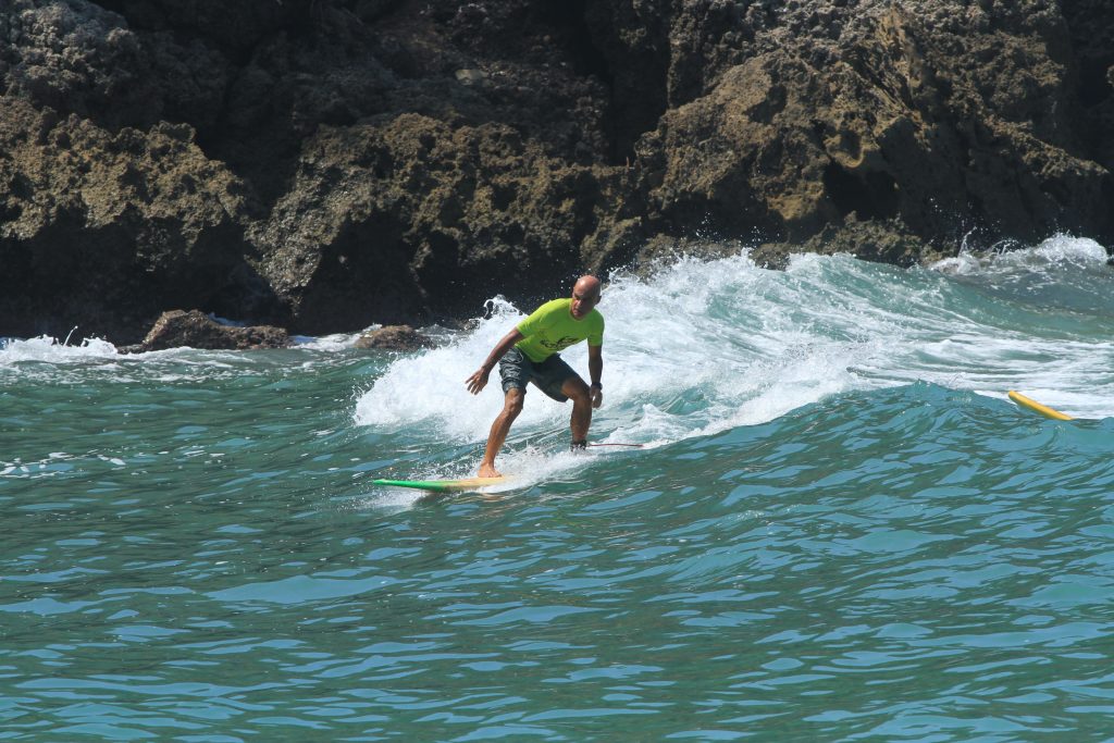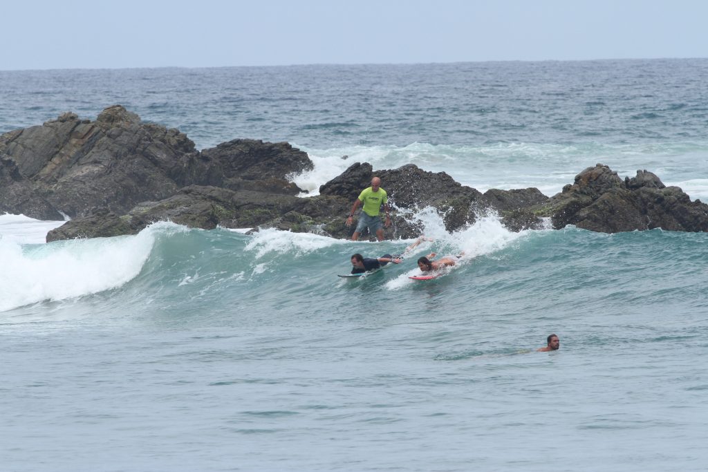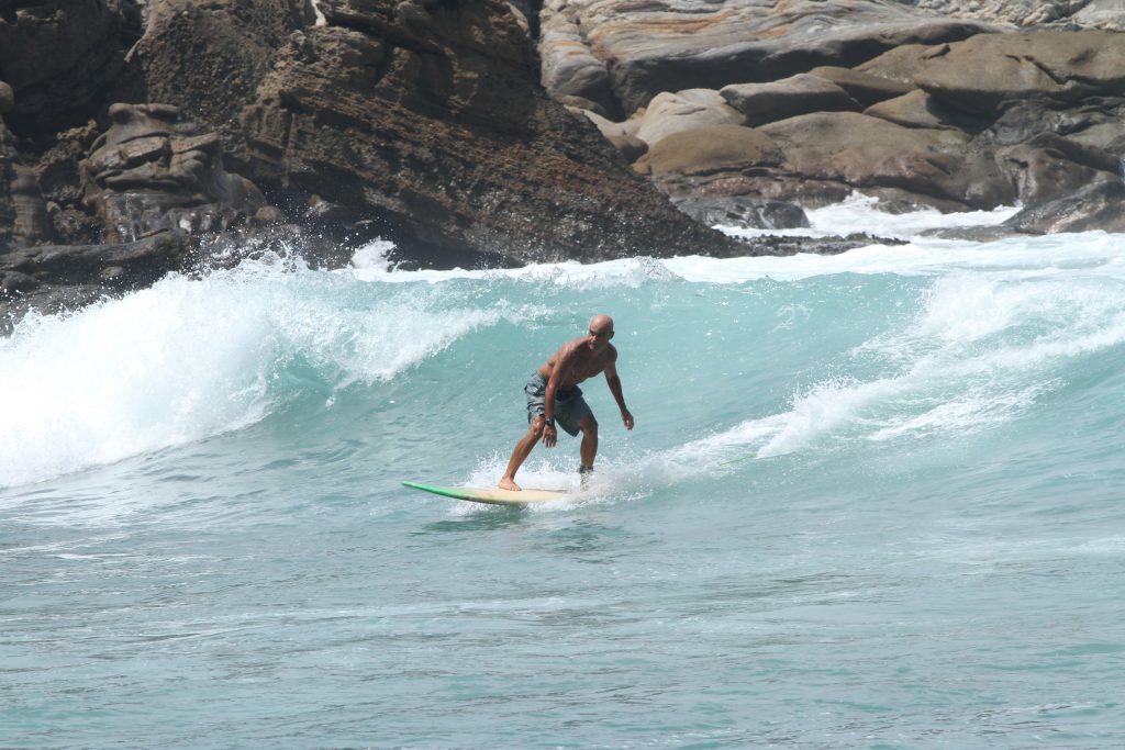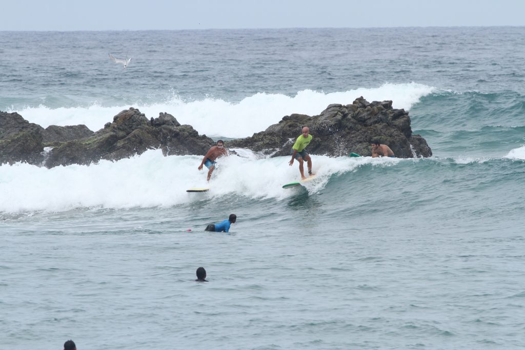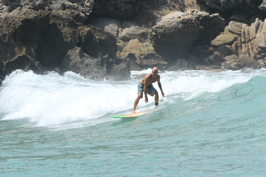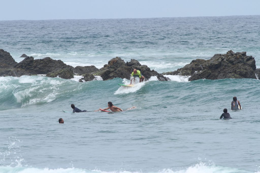 The beach itself. You can see part of the stairs leading down to the beach in the middle right of the picture. There are 168 steps. We get to carry our boards down there every day and then back up again after we’ve surfed for a couple of hours…not the funnest thing in the world 🙂A set coming into the beach. One of the guys I surfed with for a couple of days had an Apple Watch on. It could record the distances he surfed. Some of the waves we were catching went on for over 240 feet, which is more than 70 meters. Nice!You can see partial view of where we catch the waves here on the far left and a broader view of the potential ride into the beach each time if the wave is right and we catch it correctly.