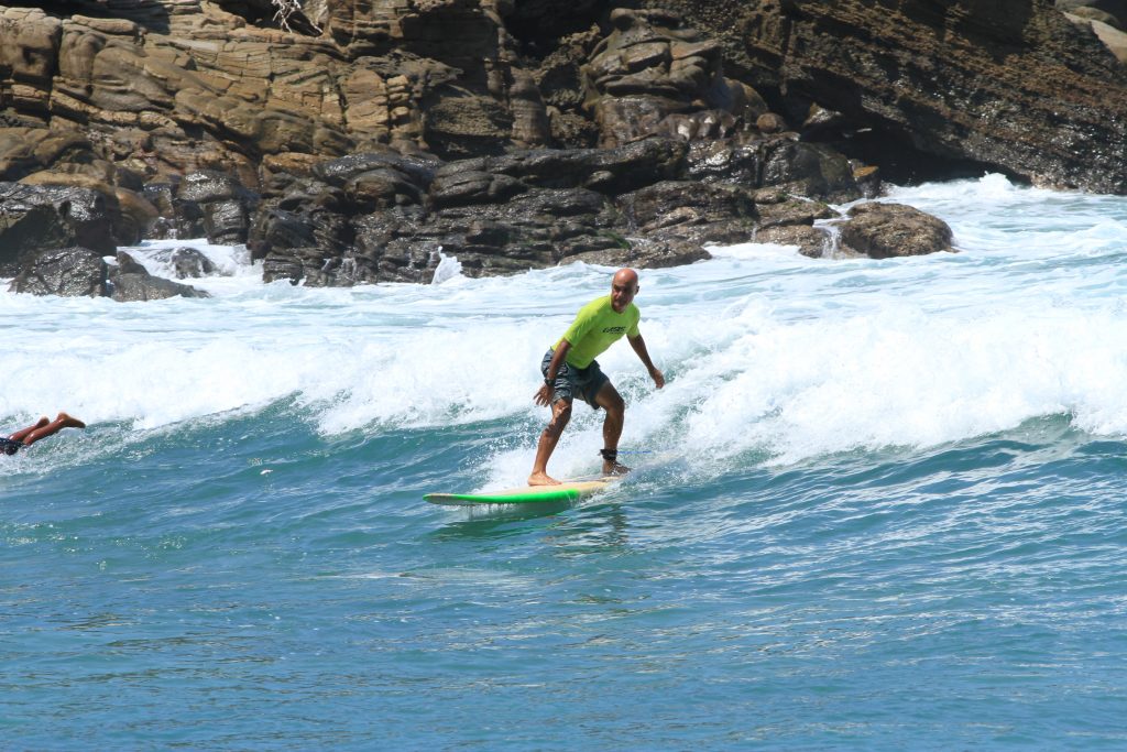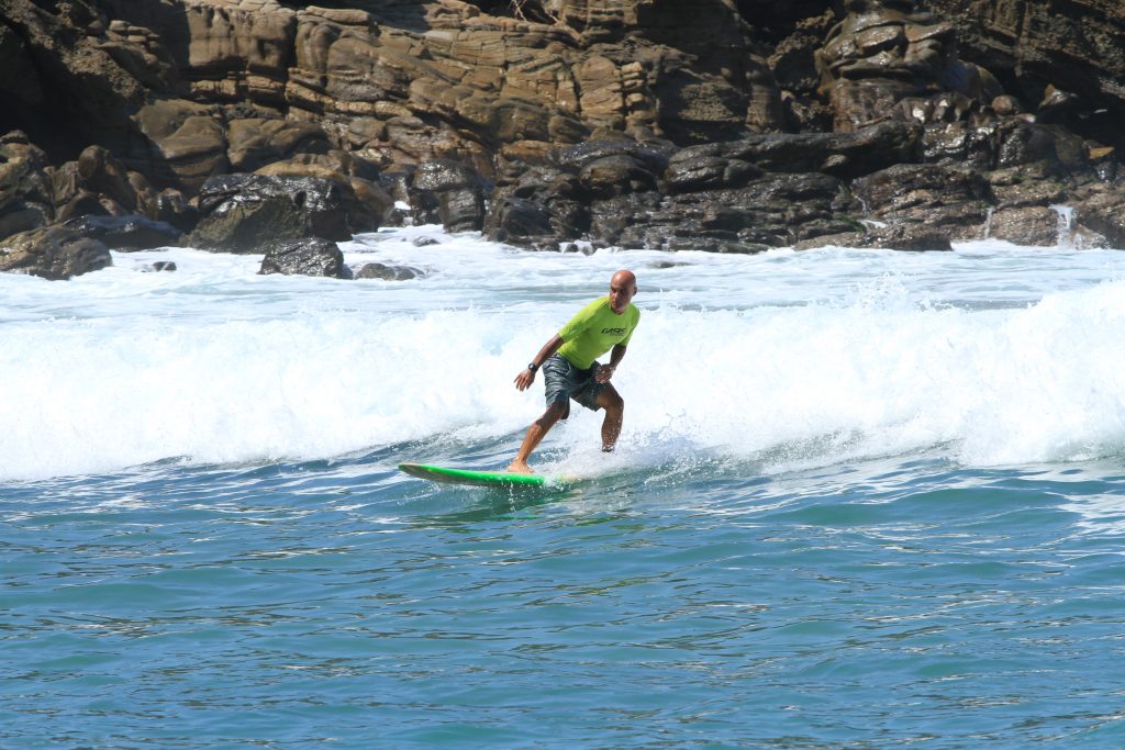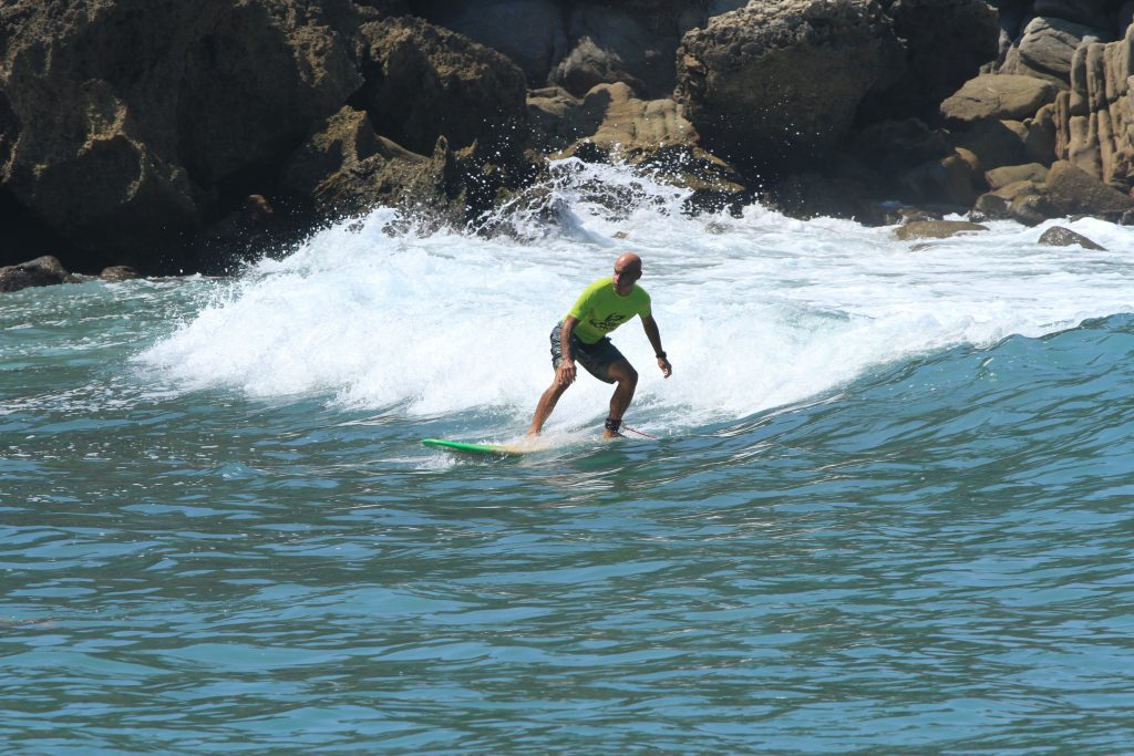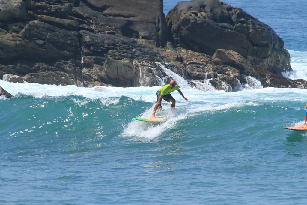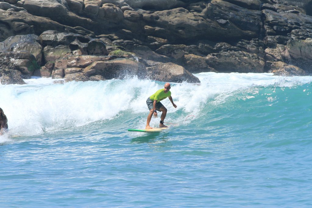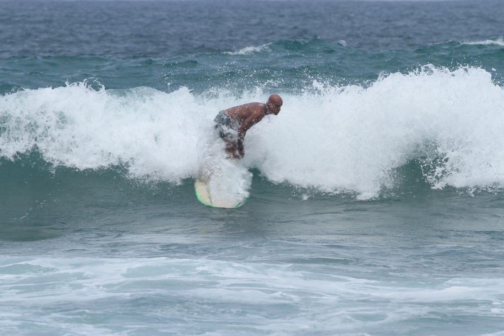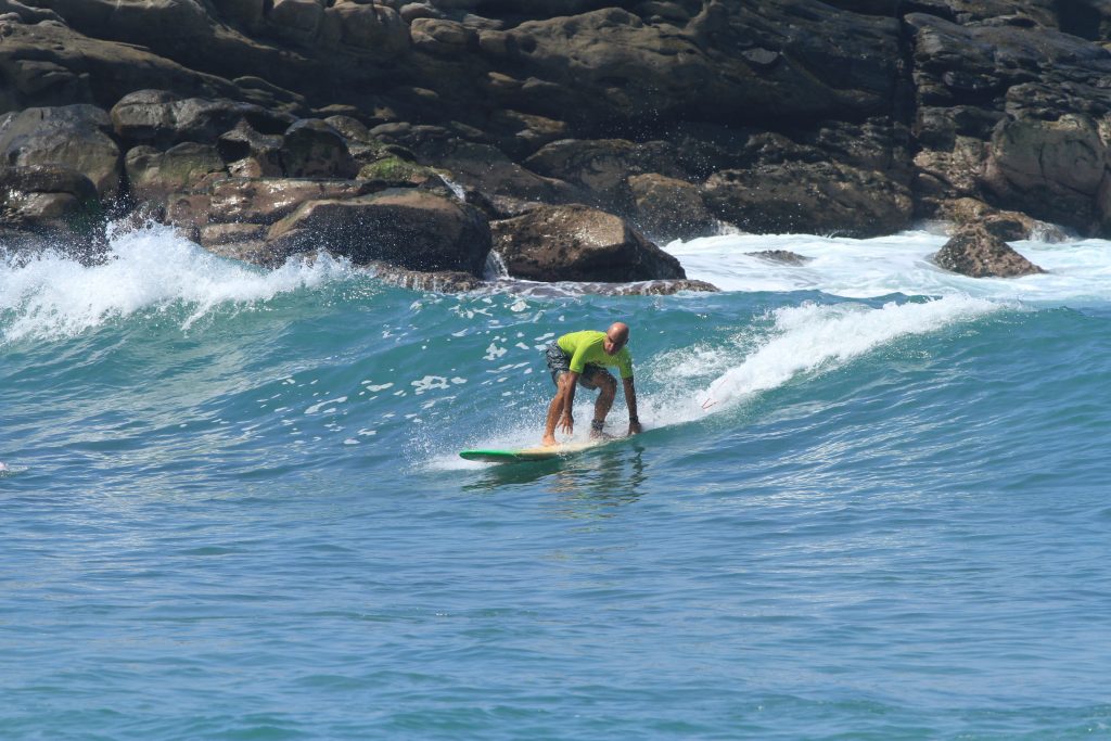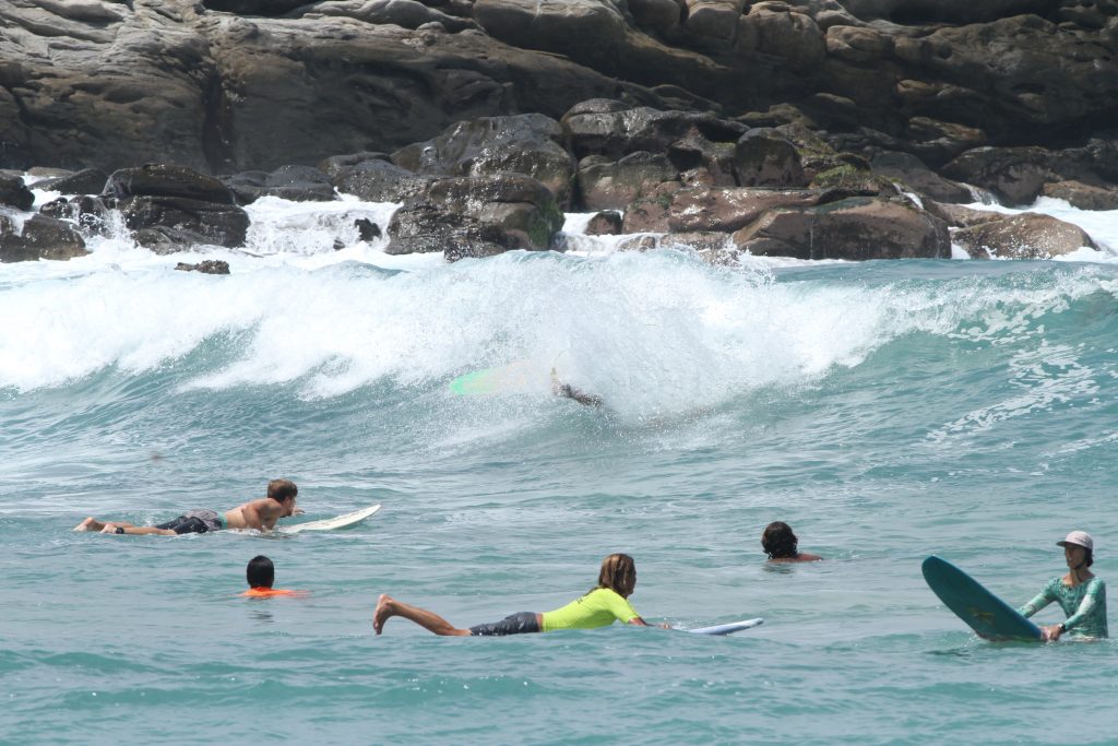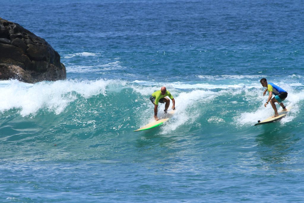 The beach itself. You can see part of the stairs leading down to the beach in the middle right of the picture. There are 168 steps. We get to carry our boards down there every day and then back up again after we’ve surfed for a couple of hours…not the funnest thing in the world 🙂A set coming into the beach. One of the guys I surfed with for a couple of days had an Apple Watch on. It could record the distances he surfed. Some of the waves we were catching went on for over 240 feet, which is more than 70 meters. Nice!You can see partial view of where we catch the waves here on the far left and a broader view of the potential ride into the beach each time if the wave is right and we catch it correctly.
