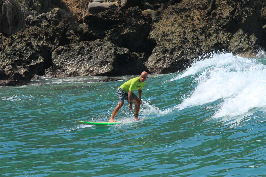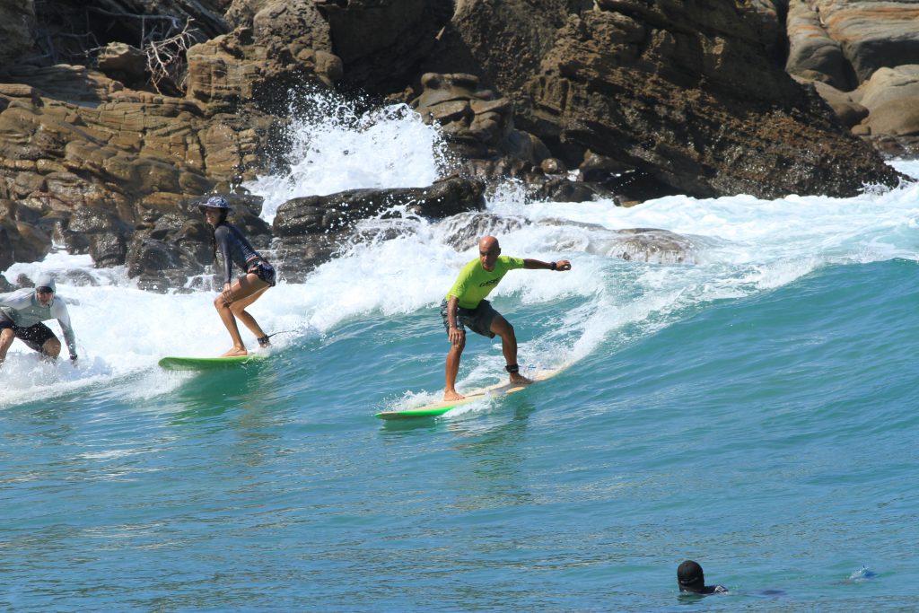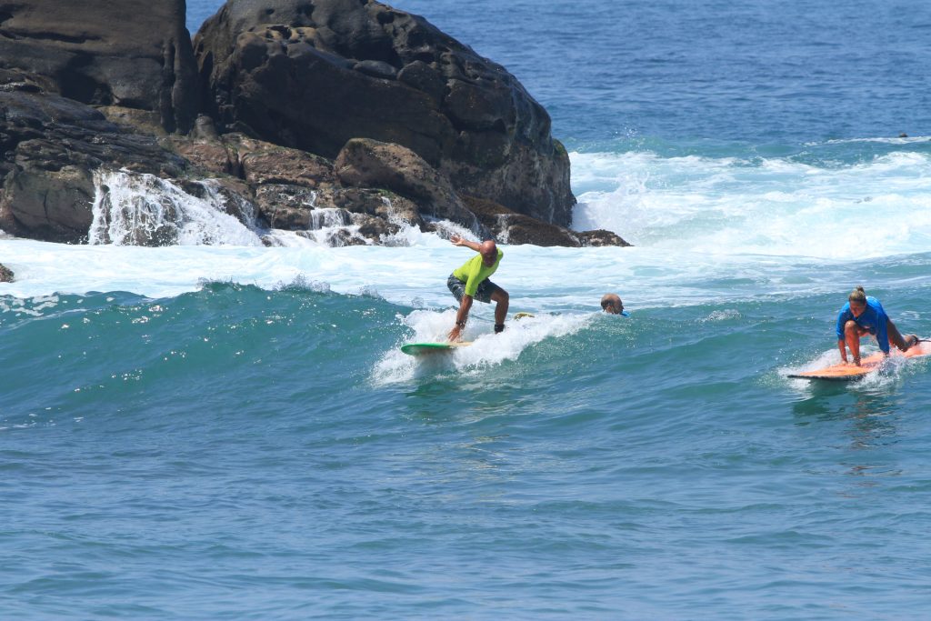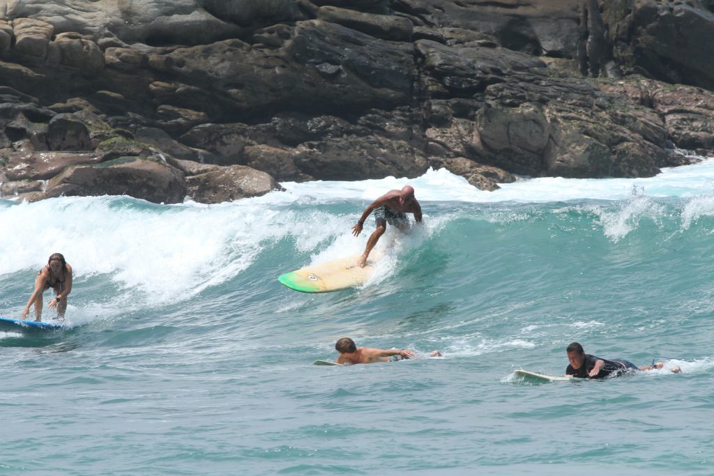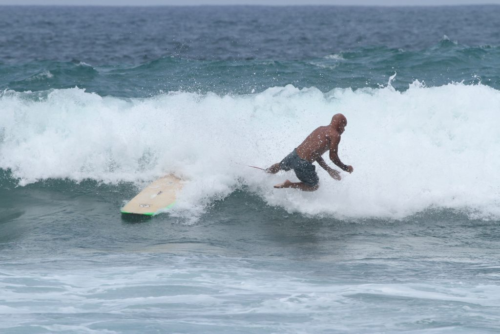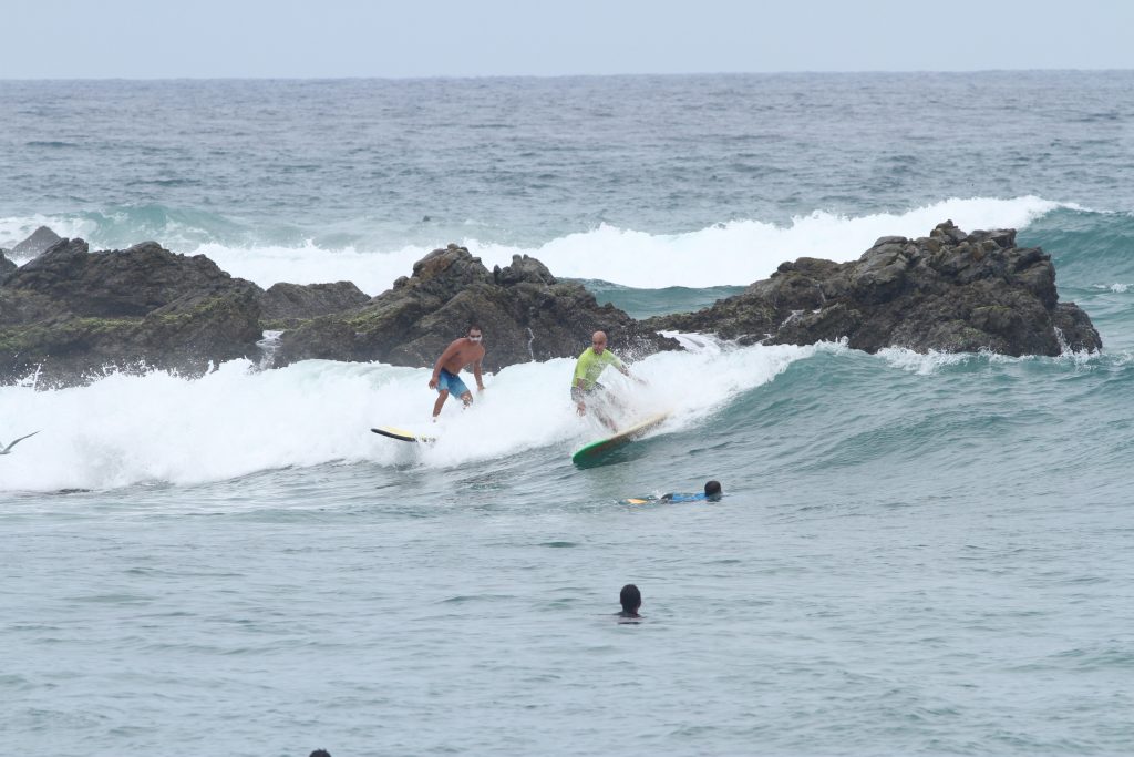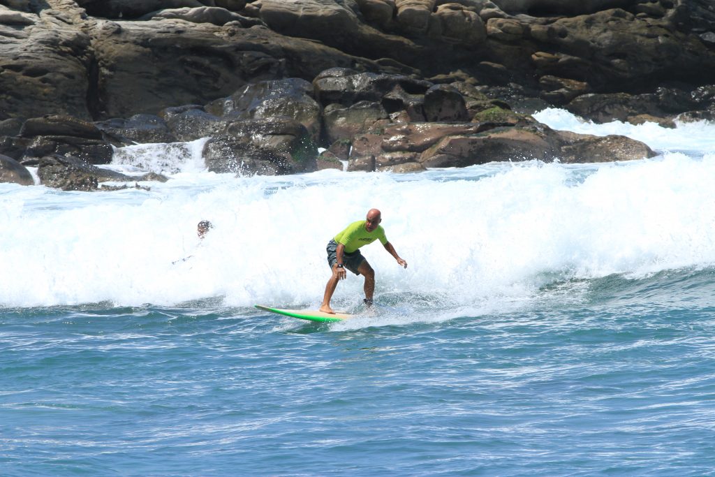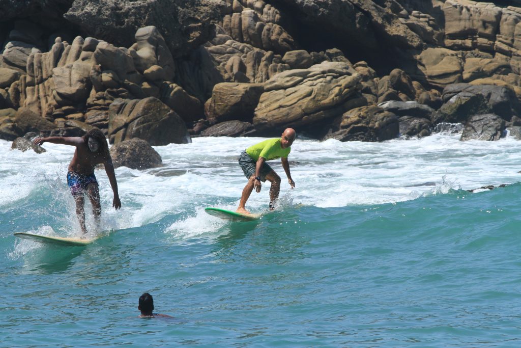 The beach itself. You can see part of the stairs leading down to the beach in the middle right of the picture. There are 168 steps. We get to carry our boards down there every day and then back up again after we’ve surfed for a couple of hours…not the funnest thing in the world 🙂A set coming into the beach. One of the guys I surfed with for a couple of days had an Apple Watch on. It could record the distances he surfed. Some of the waves we were catching went on for over 240 feet, which is more than 70 meters. Nice!You can see partial view of where we catch the waves here on the far left and a broader view of the potential ride into the beach each time if the wave is right and we catch it correctly.