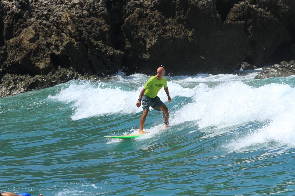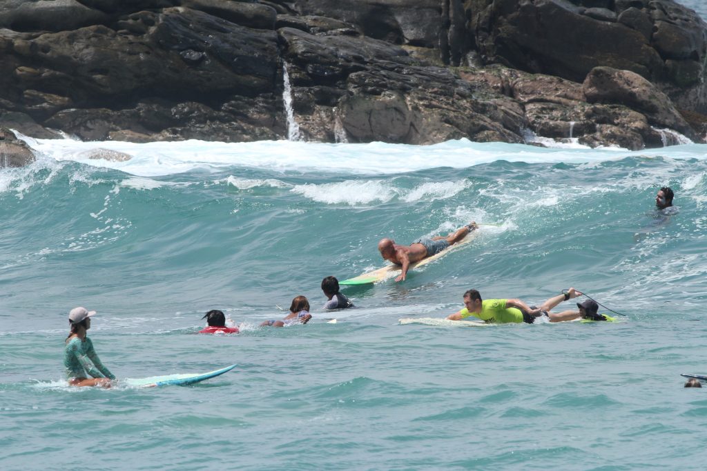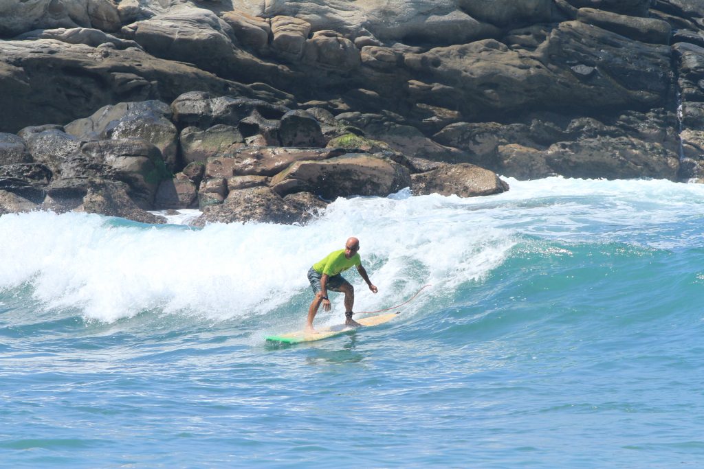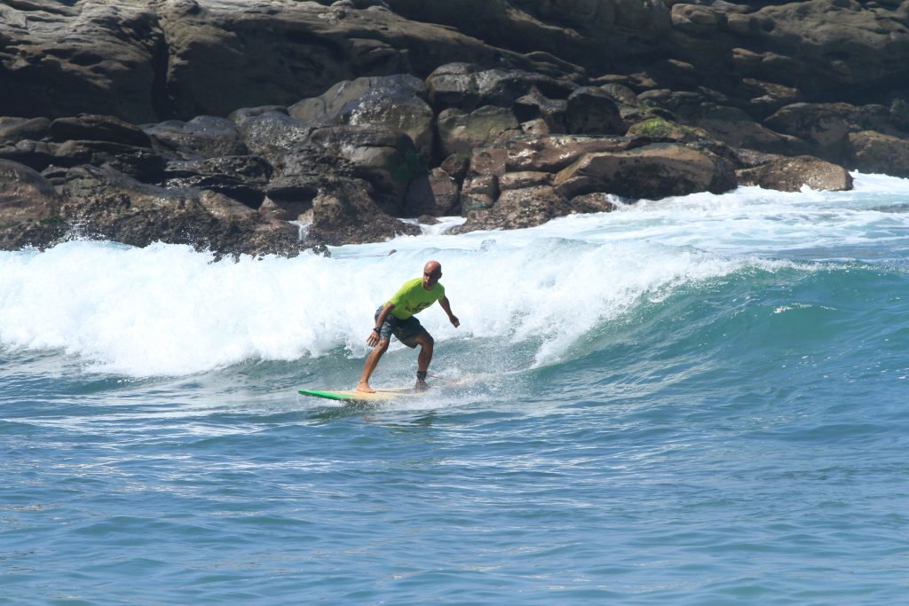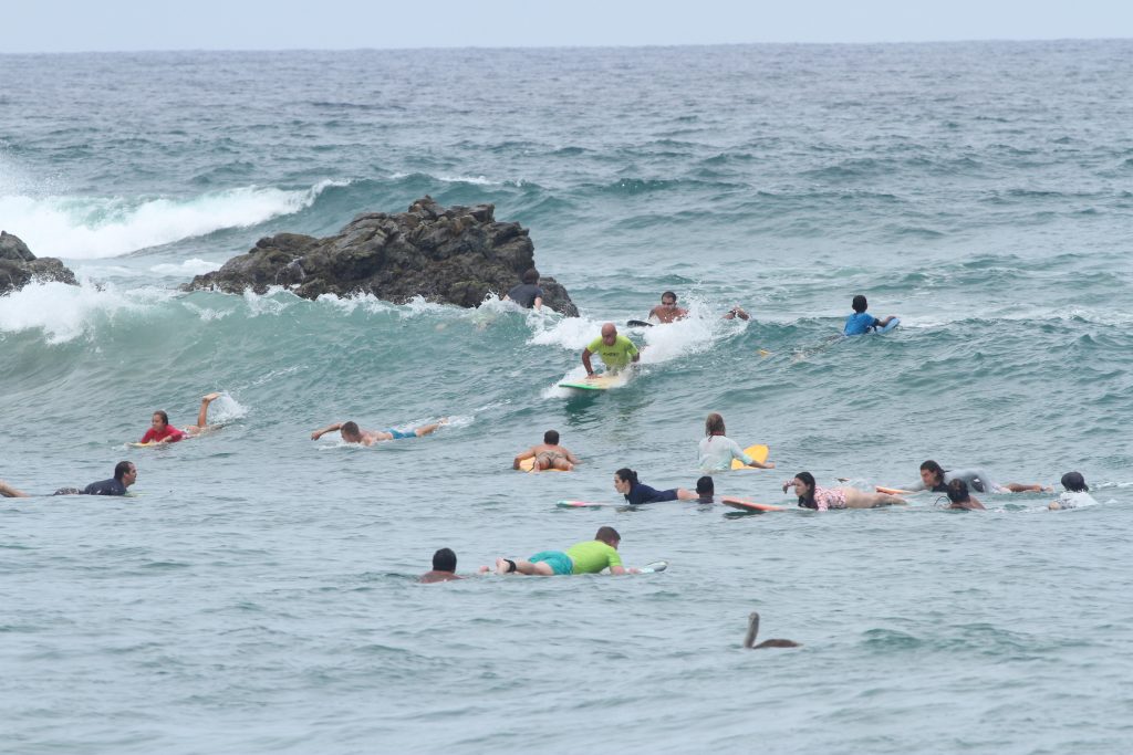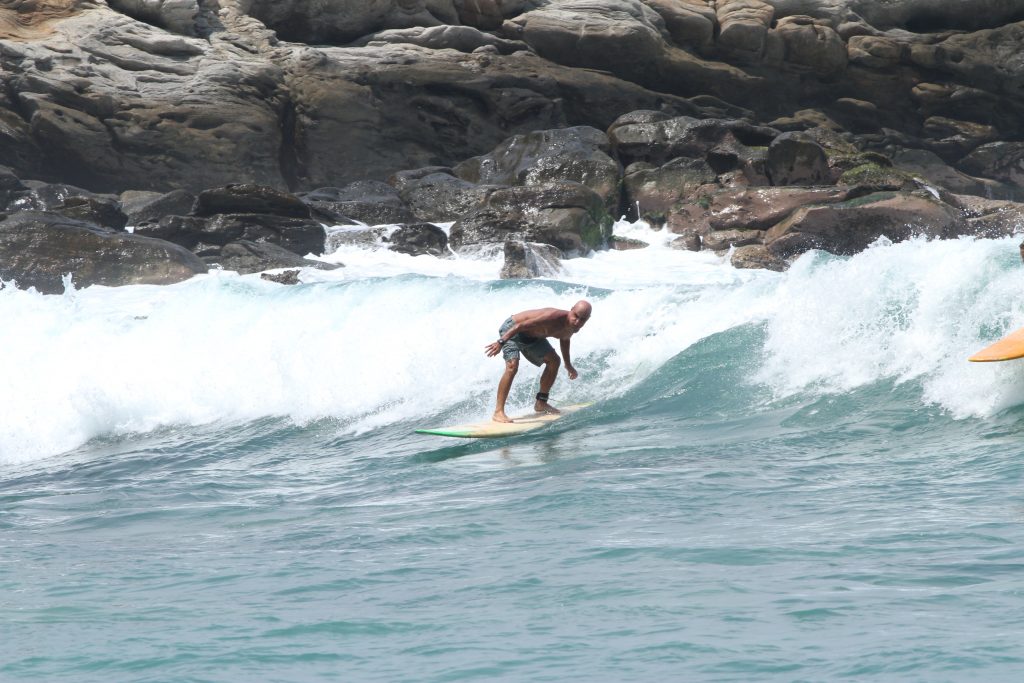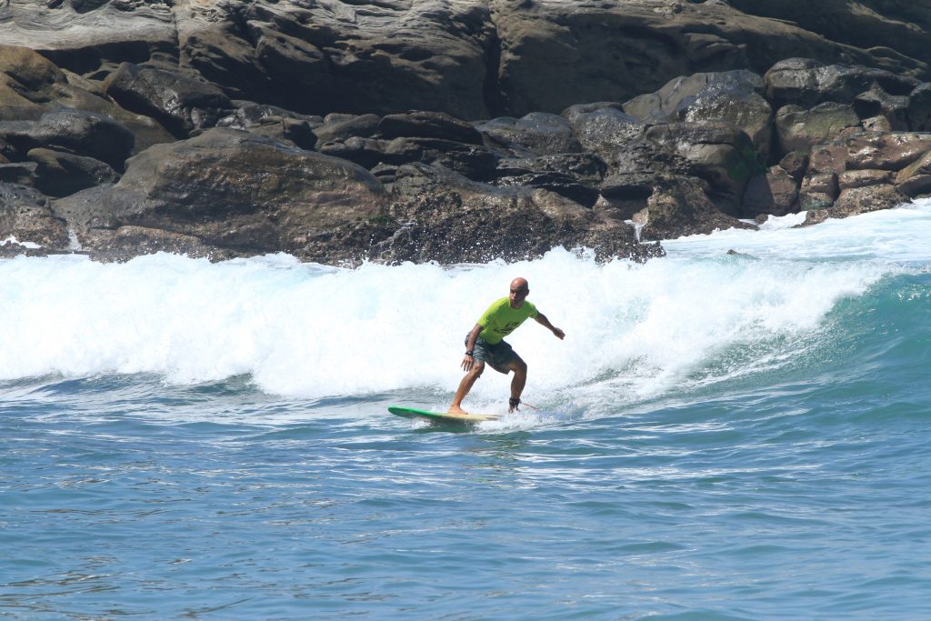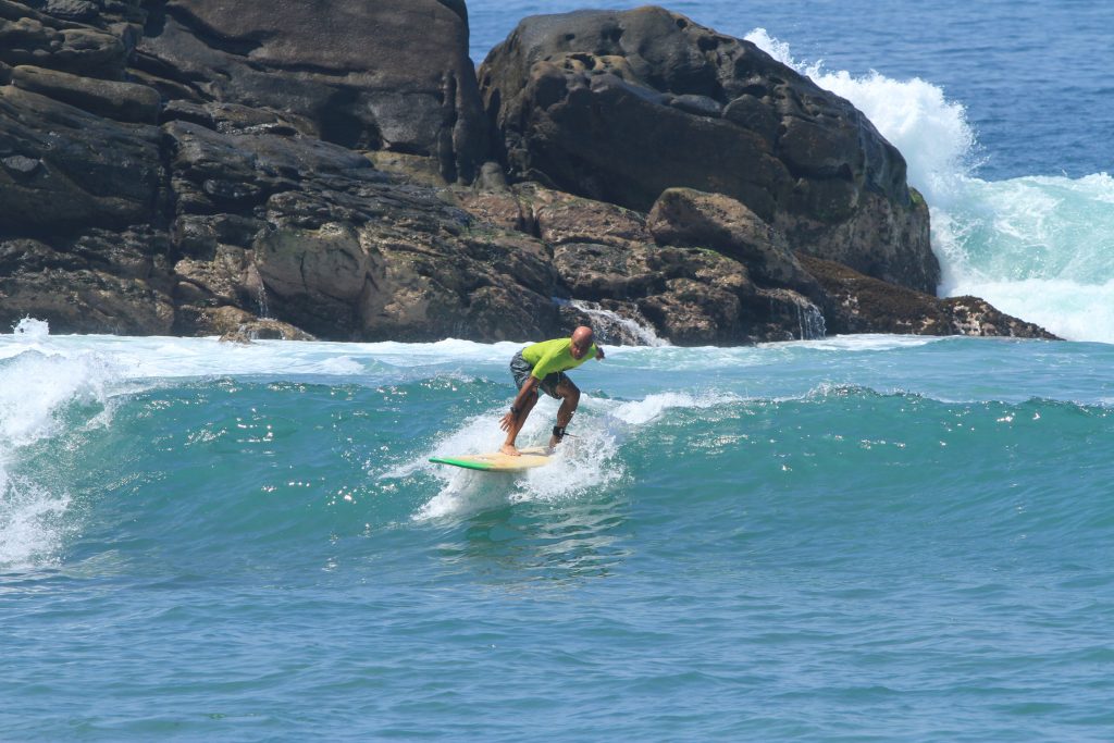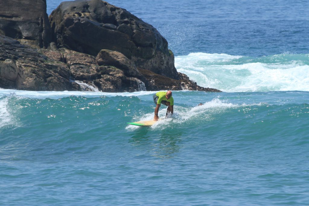 The beach itself. You can see part of the stairs leading down to the beach in the middle right of the picture. There are 168 steps. We get to carry our boards down there every day and then back up again after we’ve surfed for a couple of hours…not the funnest thing in the world 🙂A set coming into the beach. One of the guys I surfed with for a couple of days had an Apple Watch on. It could record the distances he surfed. Some of the waves we were catching went on for over 240 feet, which is more than 70 meters. Nice!You can see partial view of where we catch the waves here on the far left and a broader view of the potential ride into the beach each time if the wave is right and we catch it correctly.