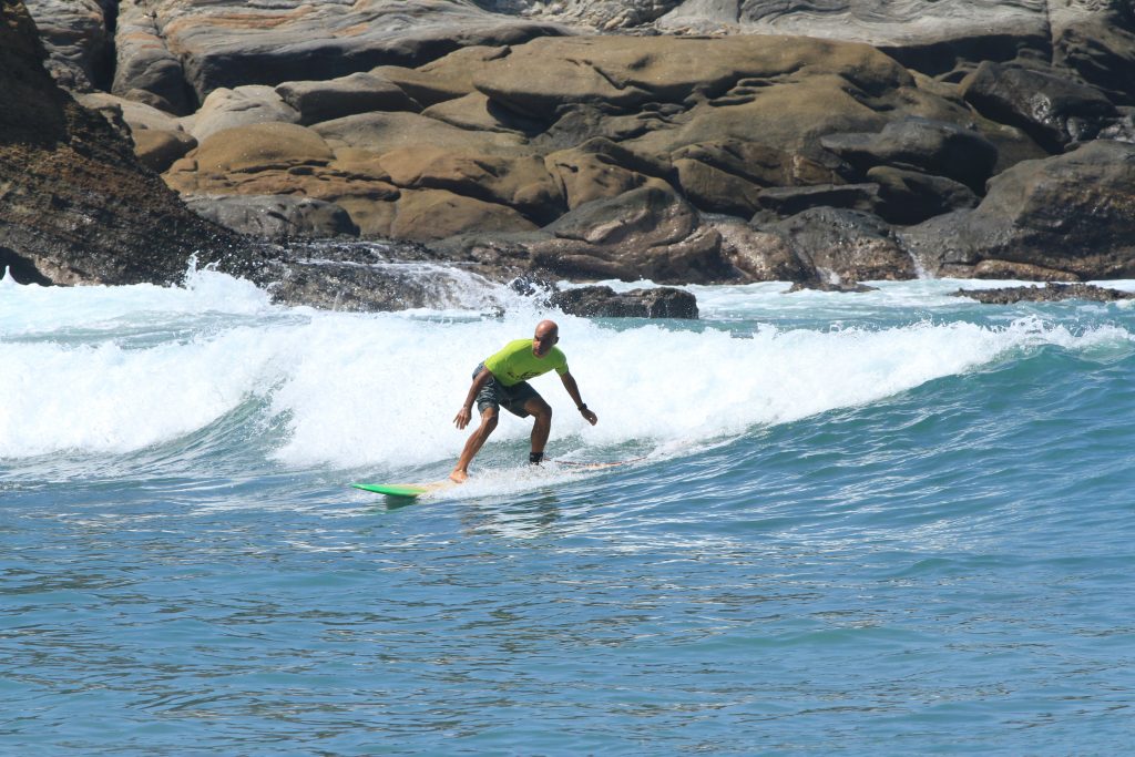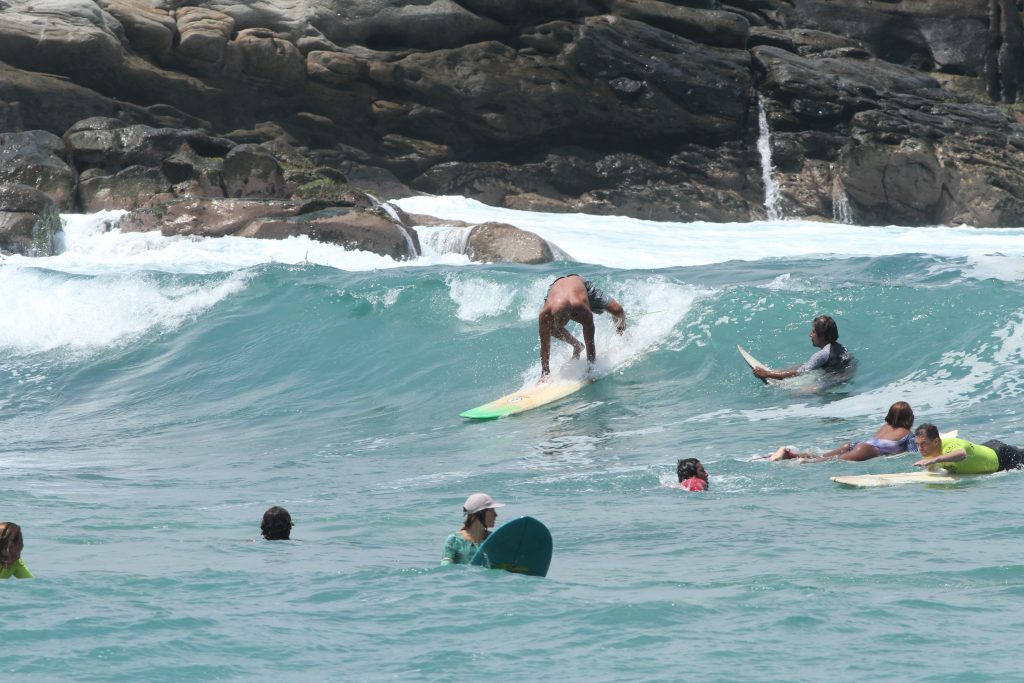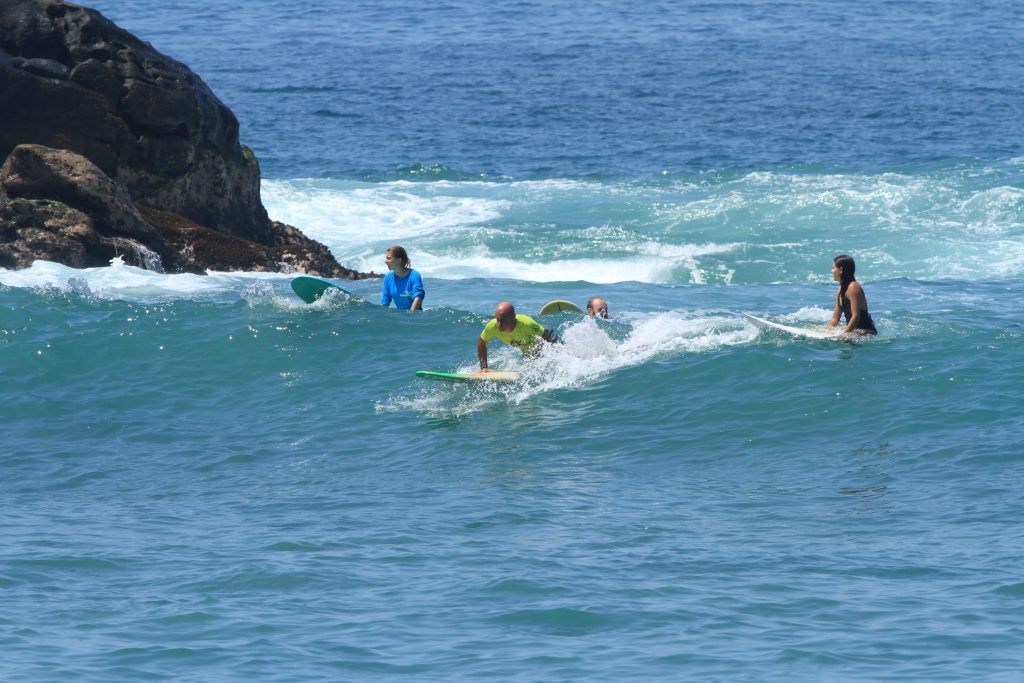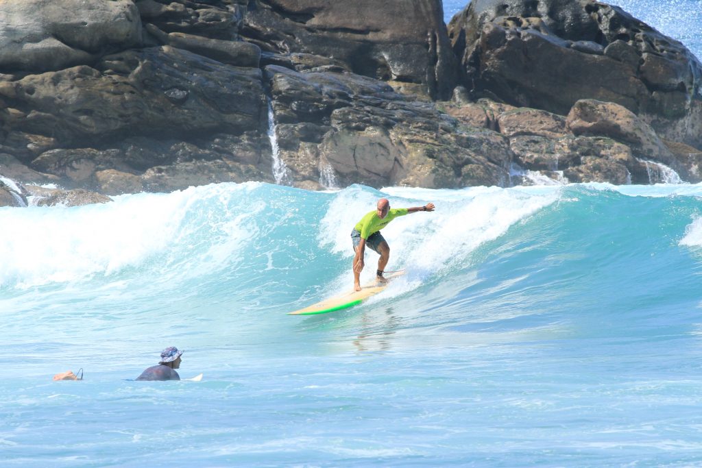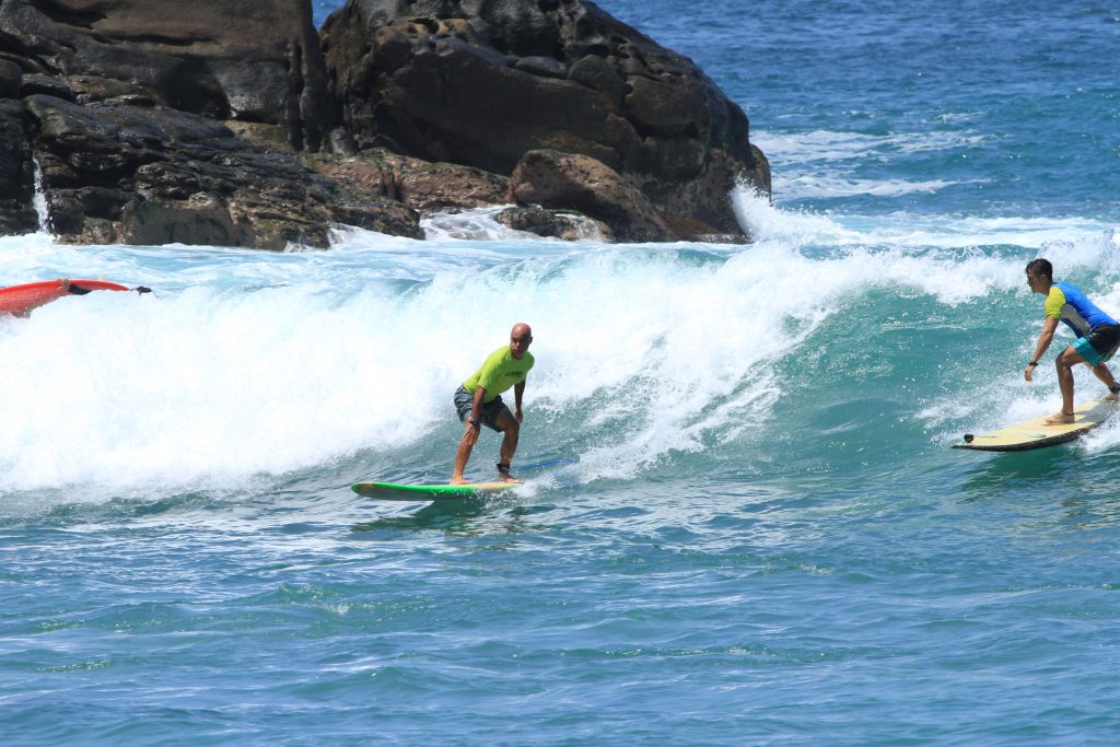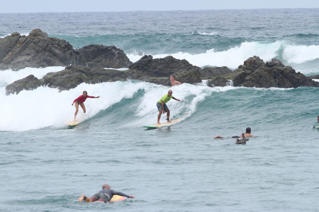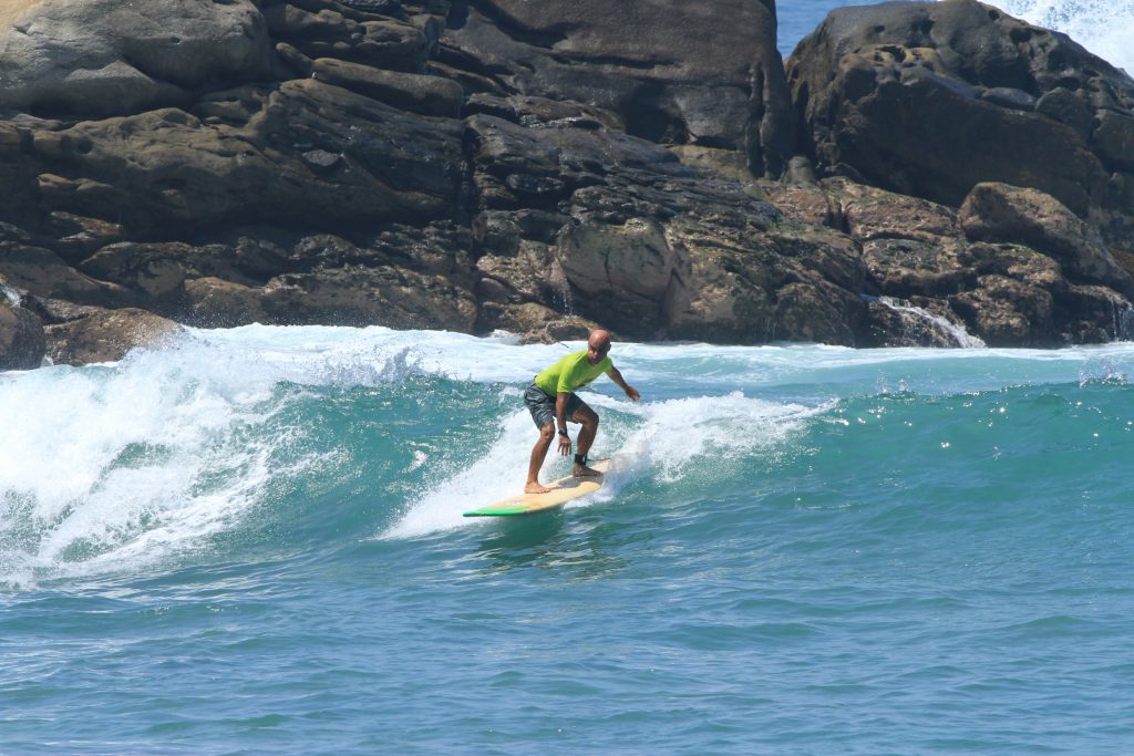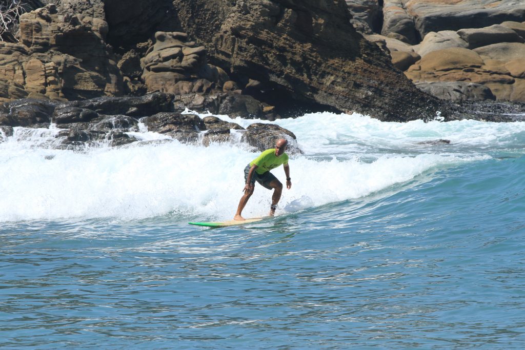 The beach itself. You can see part of the stairs leading down to the beach in the middle right of the picture. There are 168 steps. We get to carry our boards down there every day and then back up again after we’ve surfed for a couple of hours…not the funnest thing in the world 🙂A set coming into the beach. One of the guys I surfed with for a couple of days had an Apple Watch on. It could record the distances he surfed. Some of the waves we were catching went on for over 240 feet, which is more than 70 meters. Nice!You can see partial view of where we catch the waves here on the far left and a broader view of the potential ride into the beach each time if the wave is right and we catch it correctly.