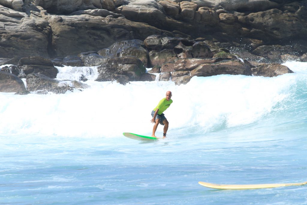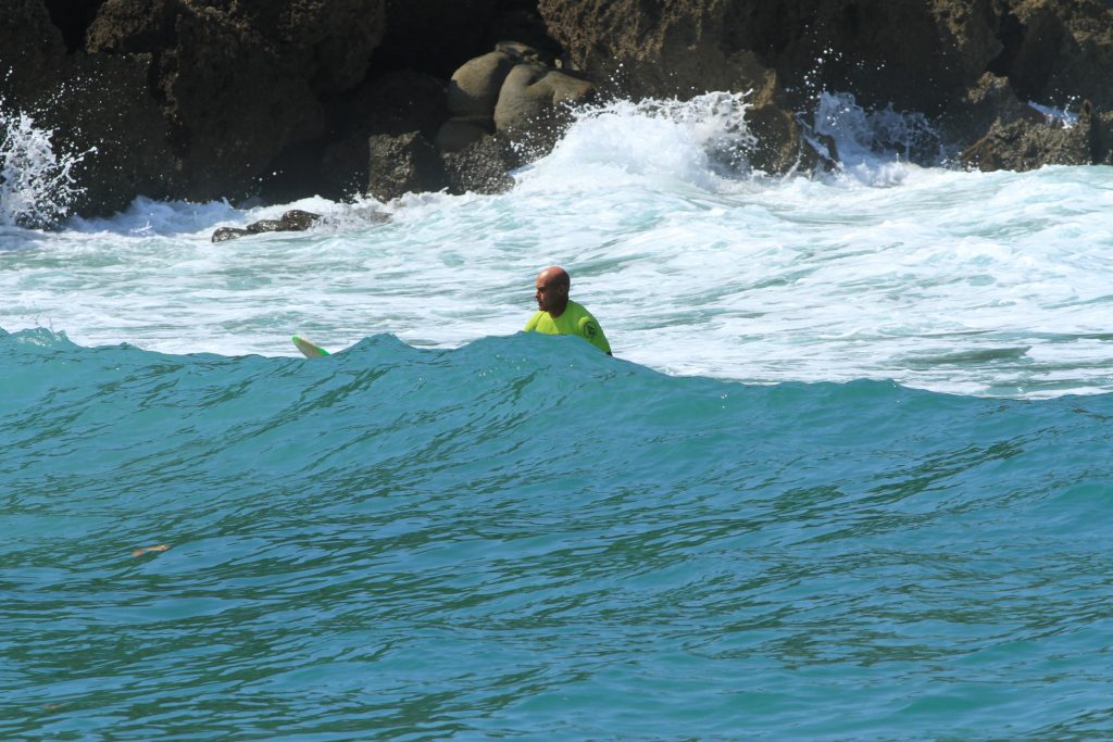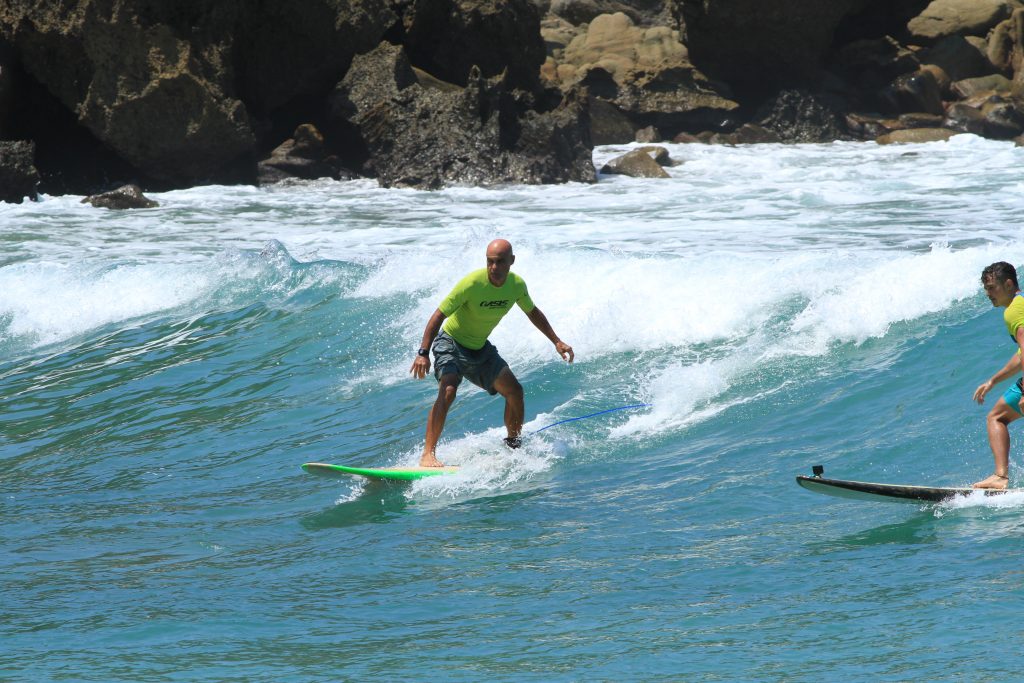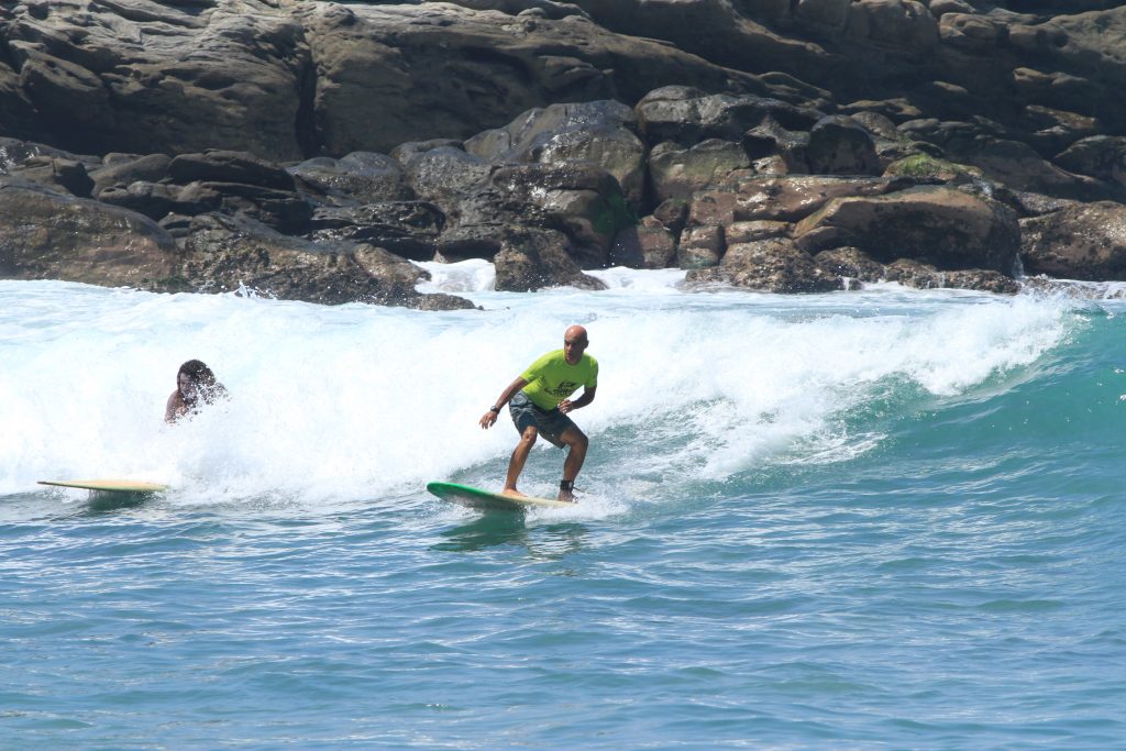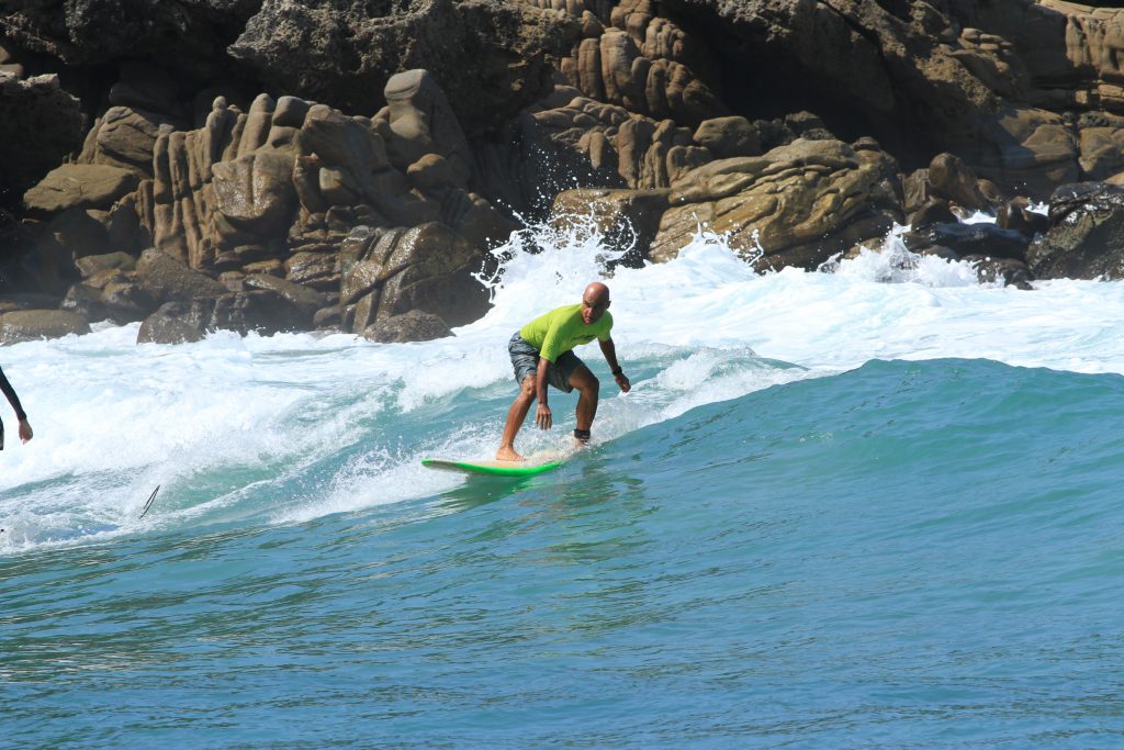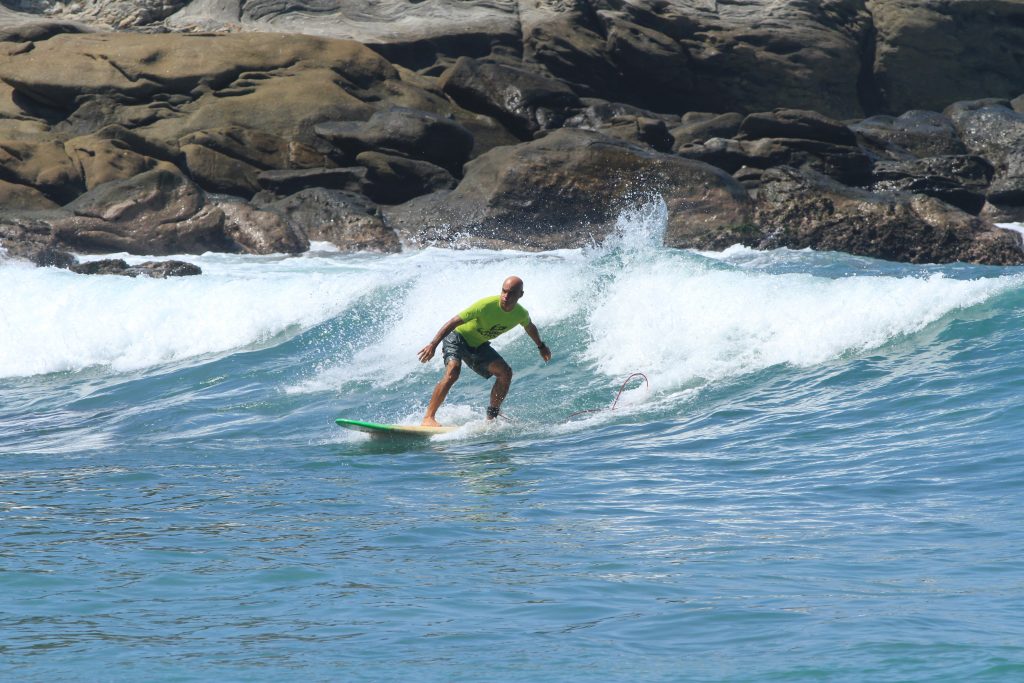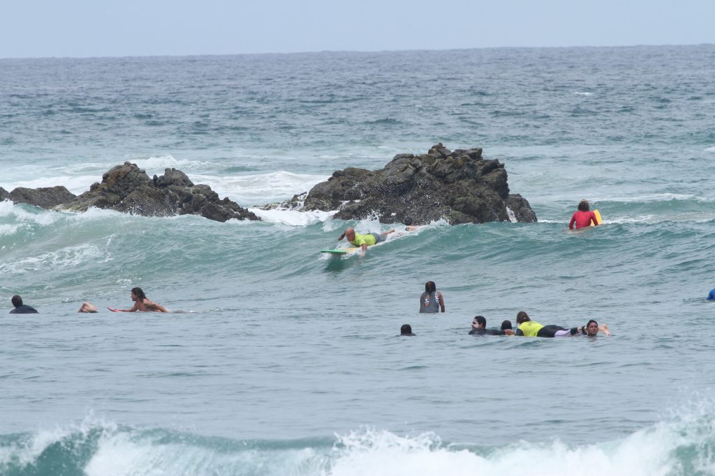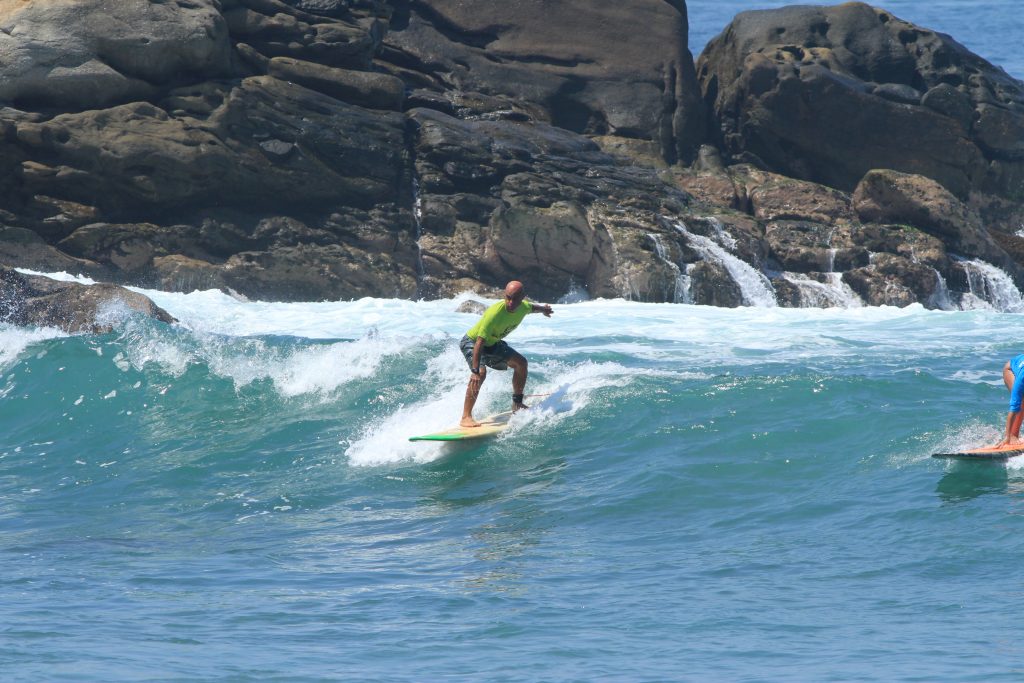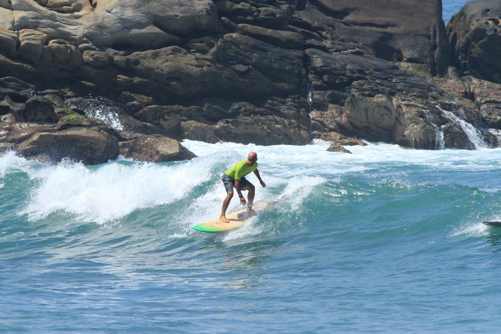 The beach itself. You can see part of the stairs leading down to the beach in the middle right of the picture. There are 168 steps. We get to carry our boards down there every day and then back up again after we’ve surfed for a couple of hours…not the funnest thing in the world 🙂A set coming into the beach. One of the guys I surfed with for a couple of days had an Apple Watch on. It could record the distances he surfed. Some of the waves we were catching went on for over 240 feet, which is more than 70 meters. Nice!You can see partial view of where we catch the waves here on the far left and a broader view of the potential ride into the beach each time if the wave is right and we catch it correctly.