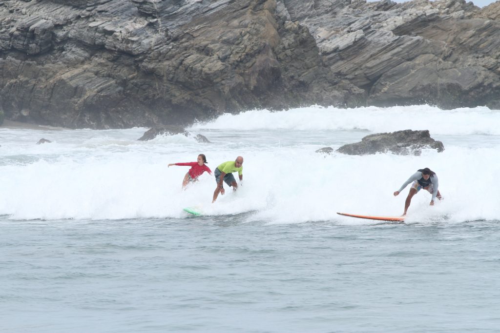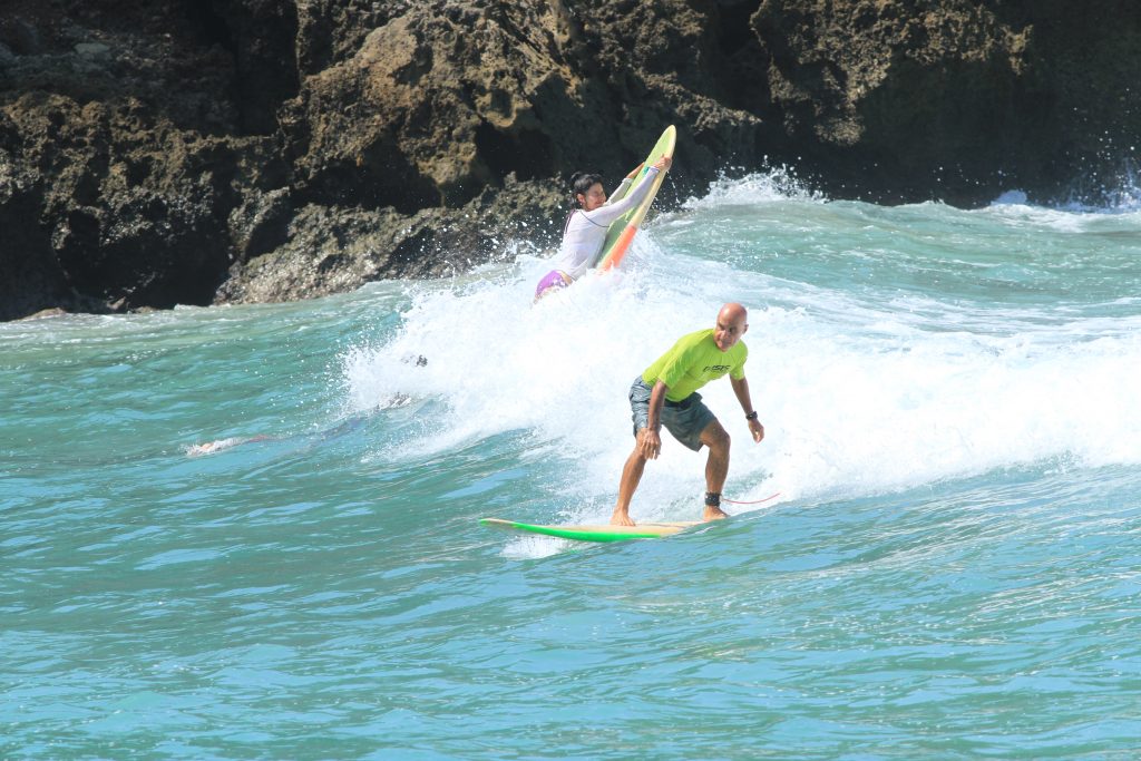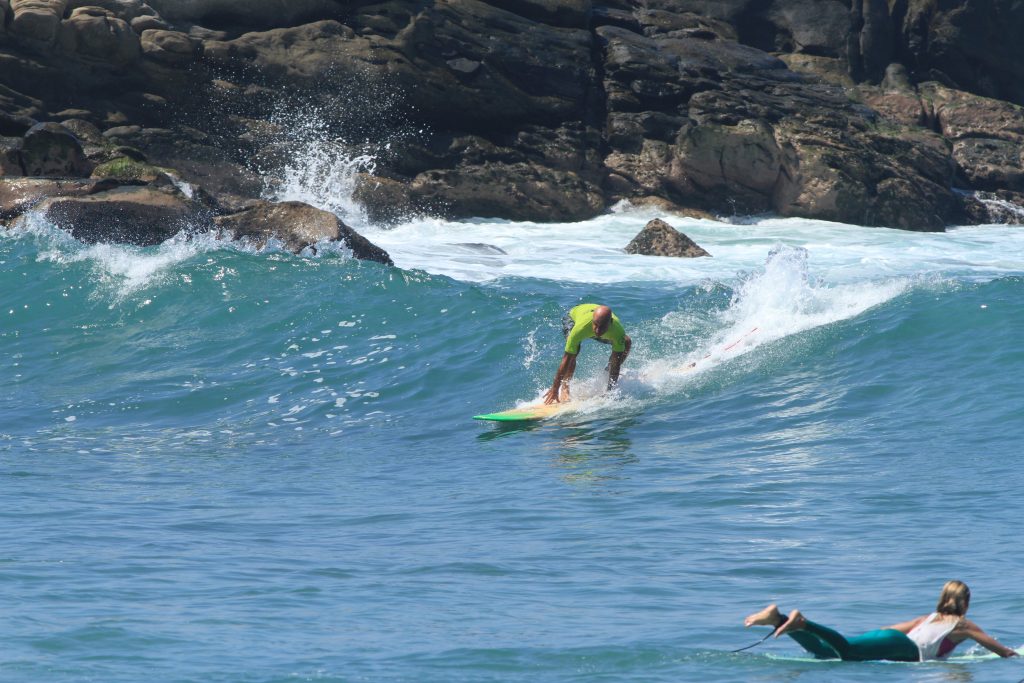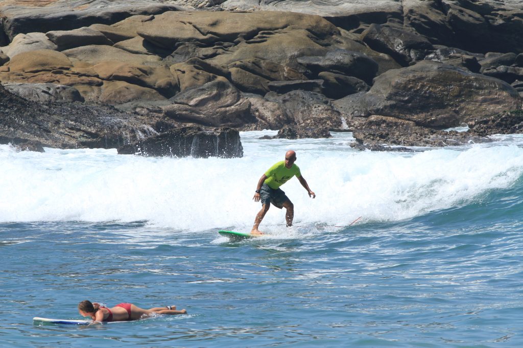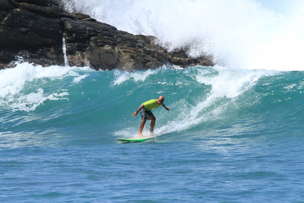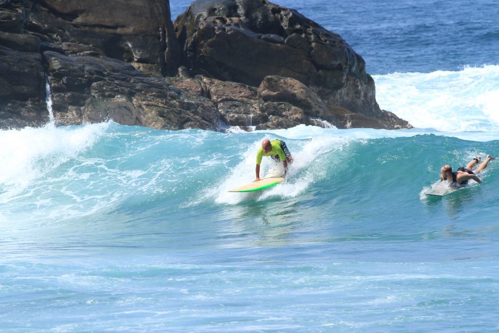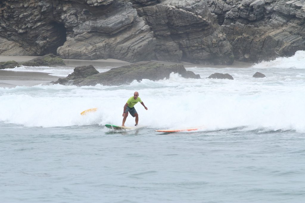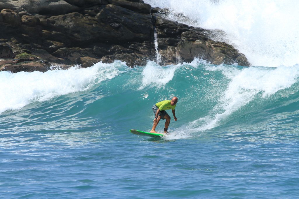 The beach itself. You can see part of the stairs leading down to the beach in the middle right of the picture. There are 168 steps. We get to carry our boards down there every day and then back up again after we’ve surfed for a couple of hours…not the funnest thing in the world 🙂A set coming into the beach. One of the guys I surfed with for a couple of days had an Apple Watch on. It could record the distances he surfed. Some of the waves we were catching went on for over 240 feet, which is more than 70 meters. Nice!You can see partial view of where we catch the waves here on the far left and a broader view of the potential ride into the beach each time if the wave is right and we catch it correctly.