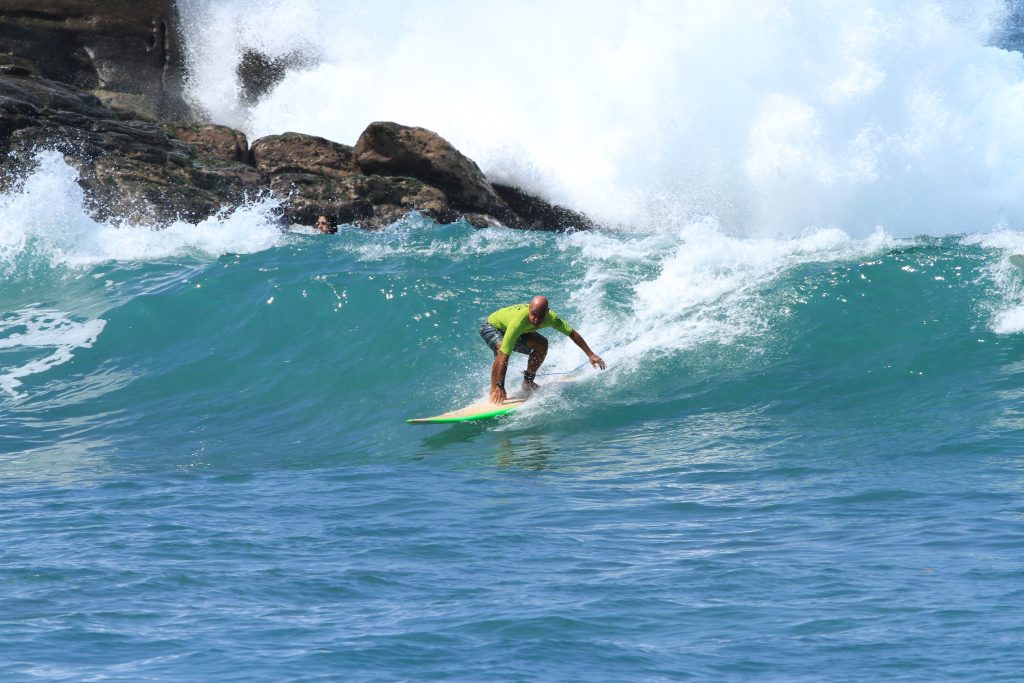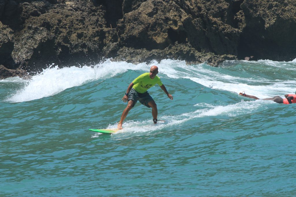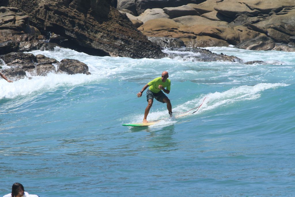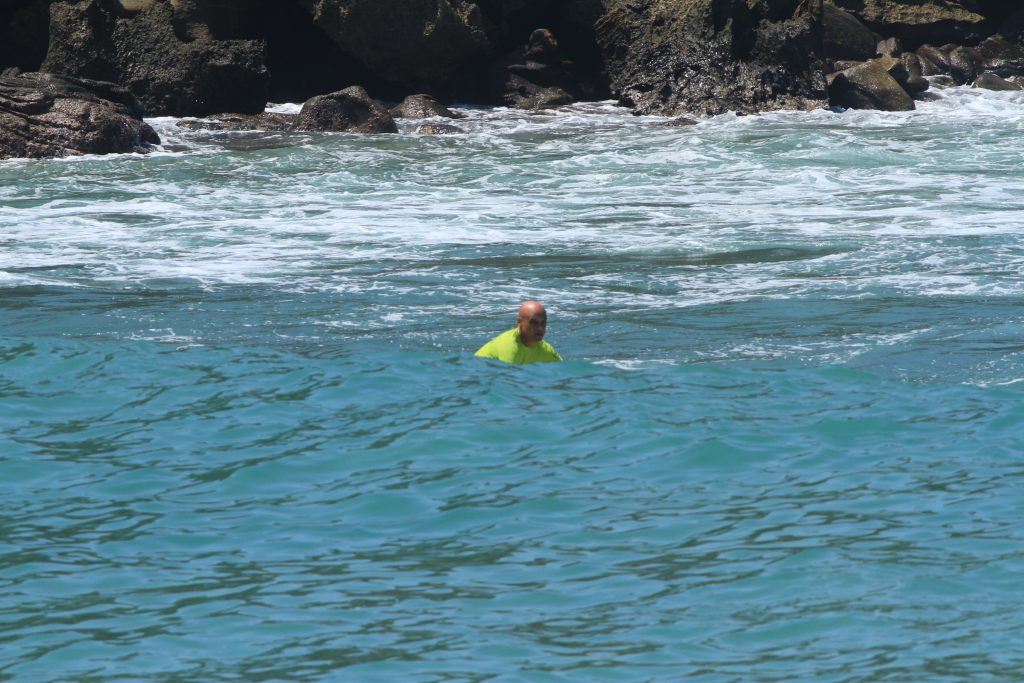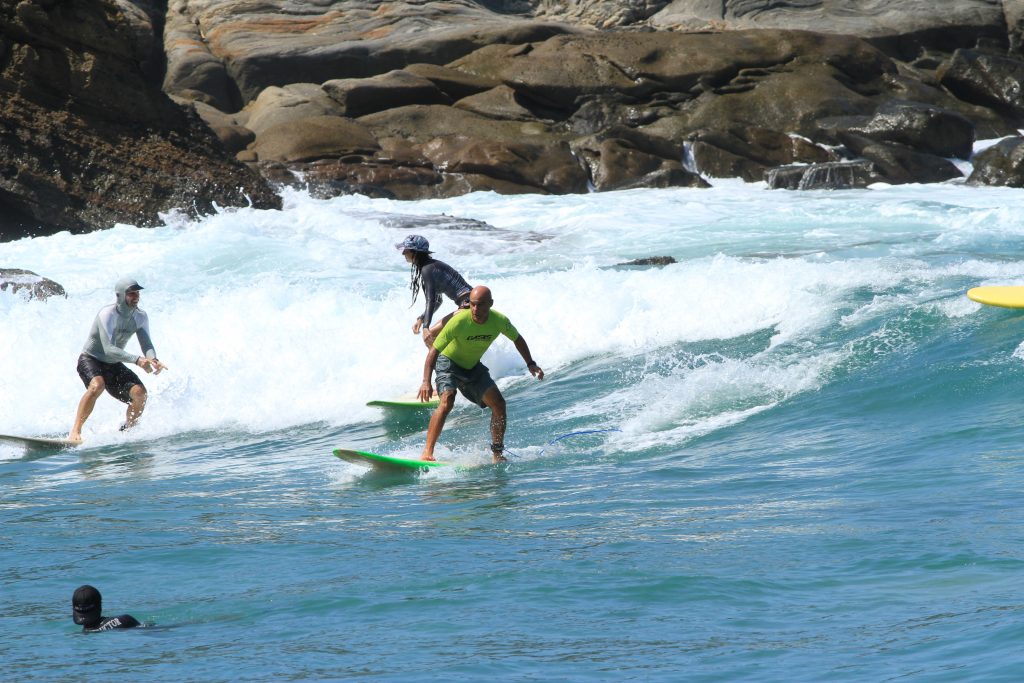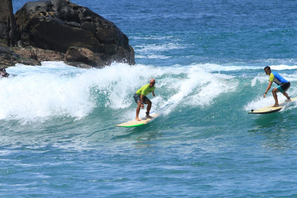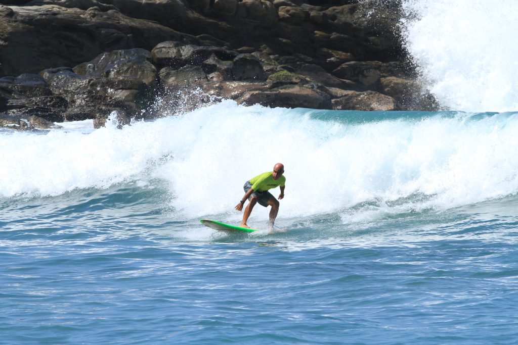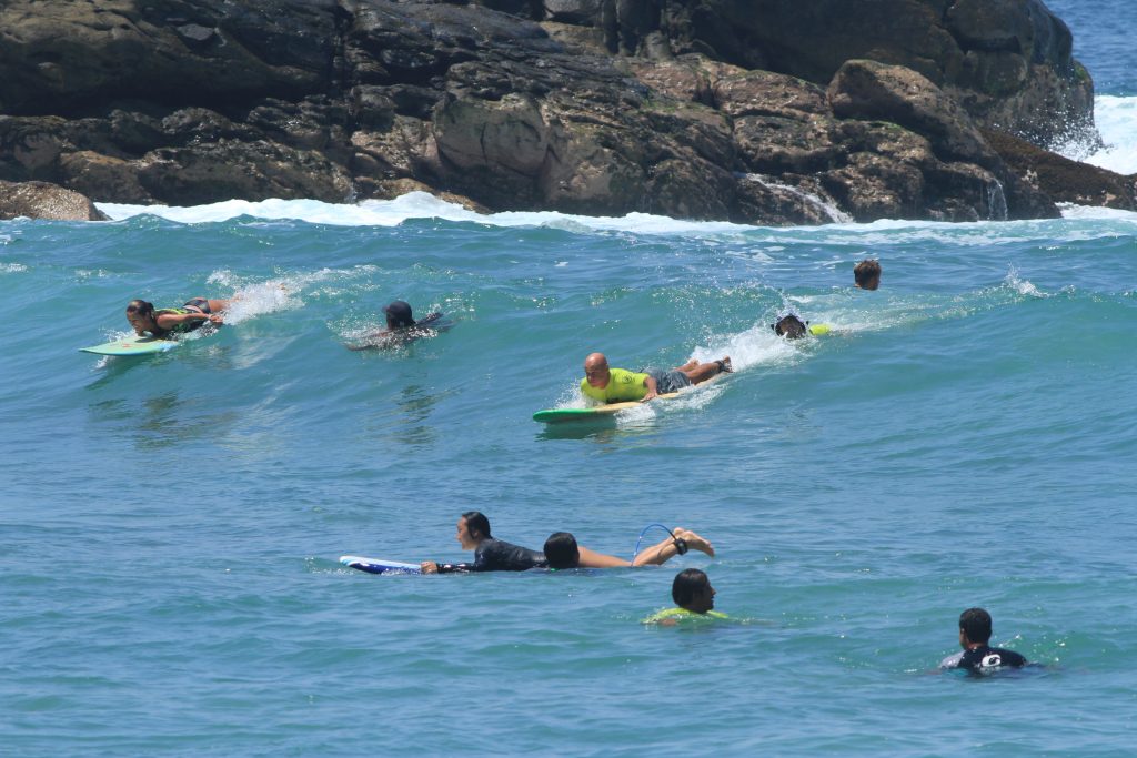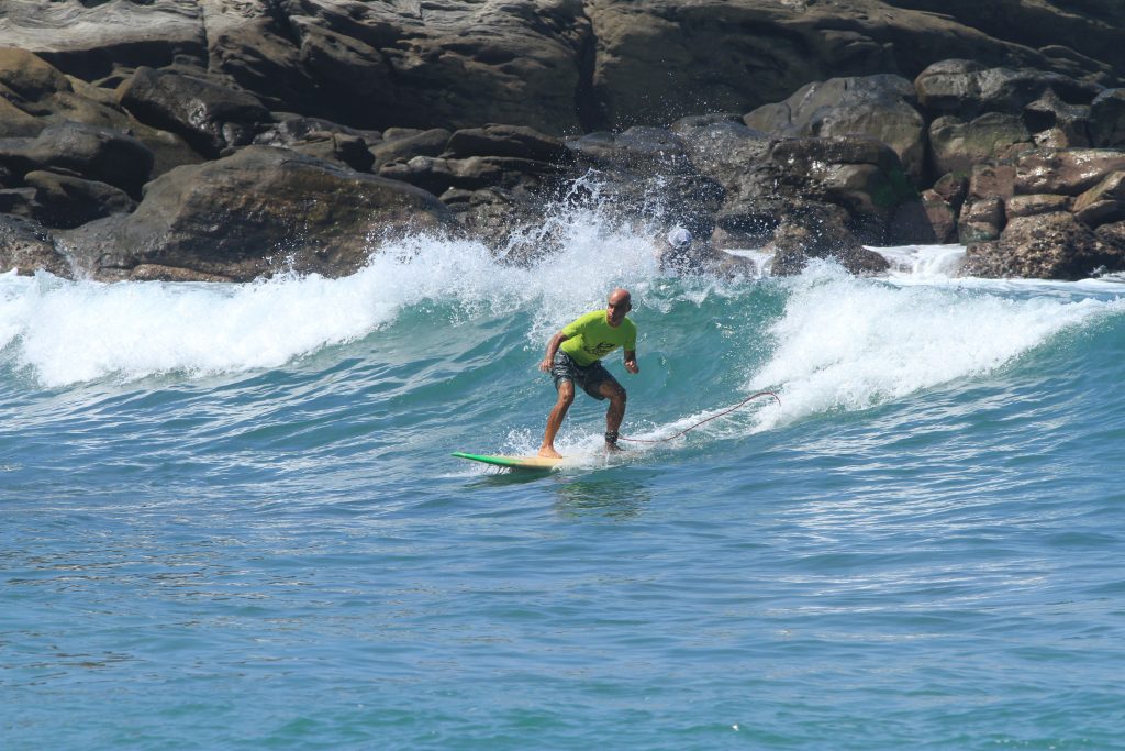 The beach itself. You can see part of the stairs leading down to the beach in the middle right of the picture. There are 168 steps. We get to carry our boards down there every day and then back up again after we’ve surfed for a couple of hours…not the funnest thing in the world 🙂A set coming into the beach. One of the guys I surfed with for a couple of days had an Apple Watch on. It could record the distances he surfed. Some of the waves we were catching went on for over 240 feet, which is more than 70 meters. Nice!You can see partial view of where we catch the waves here on the far left and a broader view of the potential ride into the beach each time if the wave is right and we catch it correctly.