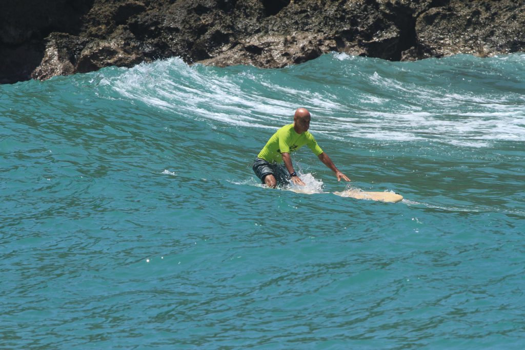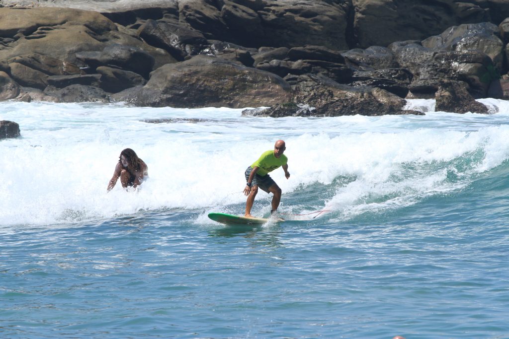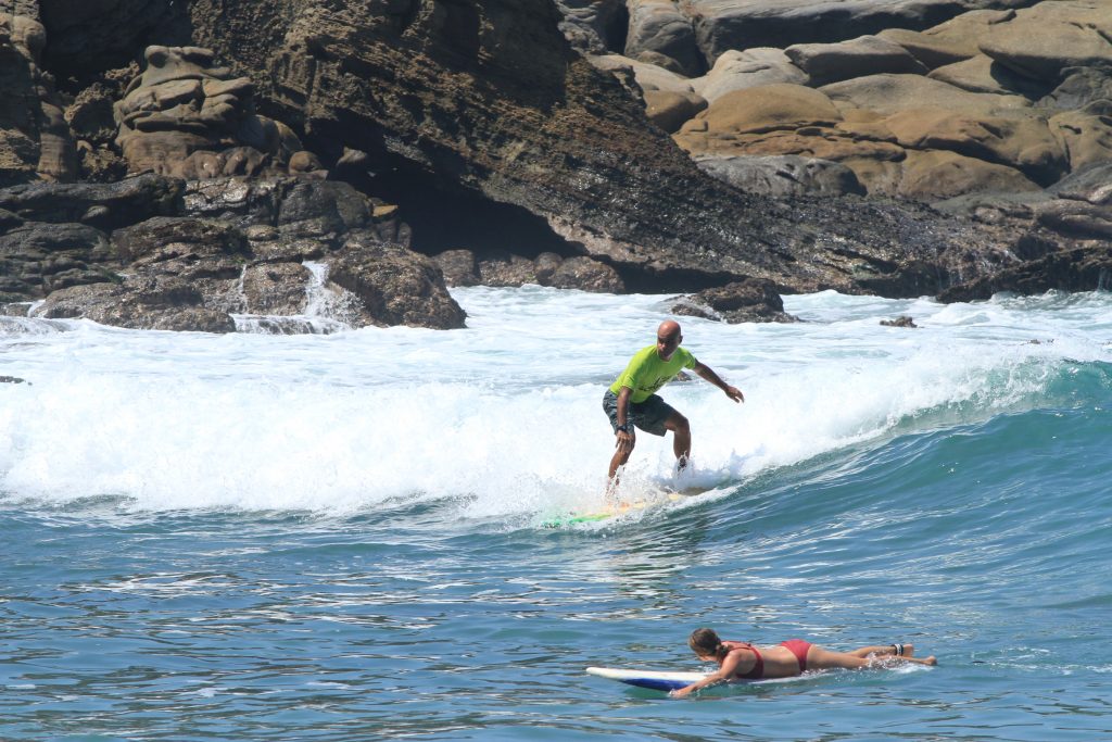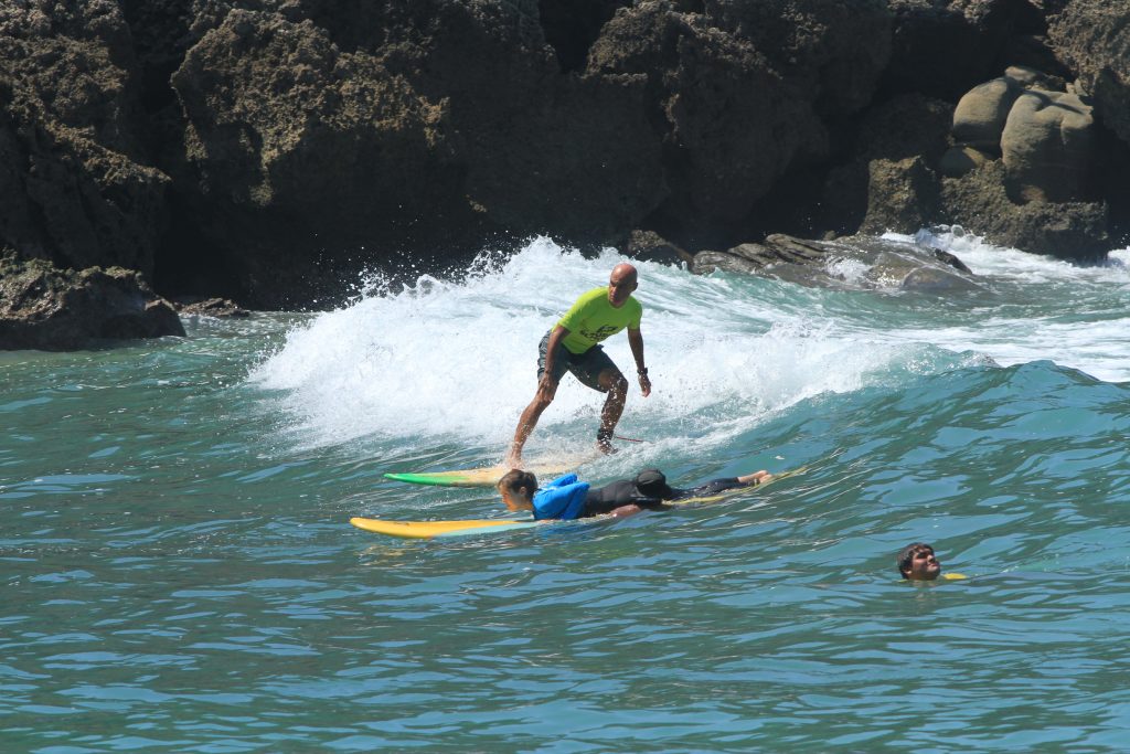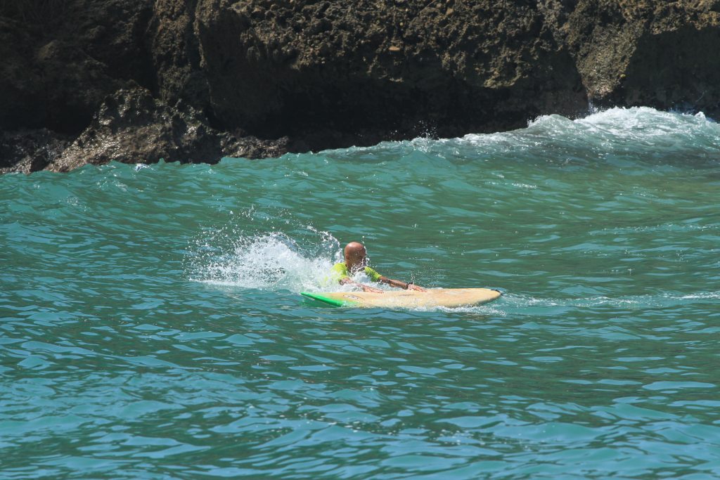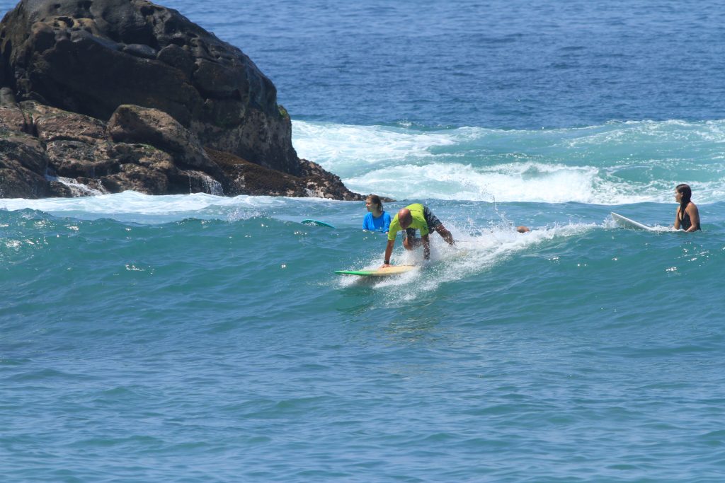 The class board on my last day. The orange star meant they’d be taking pictures. At this point I was catching waves on my own with some much needed guidance from the instructor confirming which waves to take and how to position myself. I’m not sure why the photo senquence ended here. I might have bailed to yield right of way to the girl on my right. If you look down, not straight ahead, when you take off……this happens 🙂Had to bail out since the girl on my right had right of way and I might have hit her if I kept going. In shallow water and bailed before I would have hit some rocks. I got up and the wave closed out from the left. I wasn’t good enough to power through it.